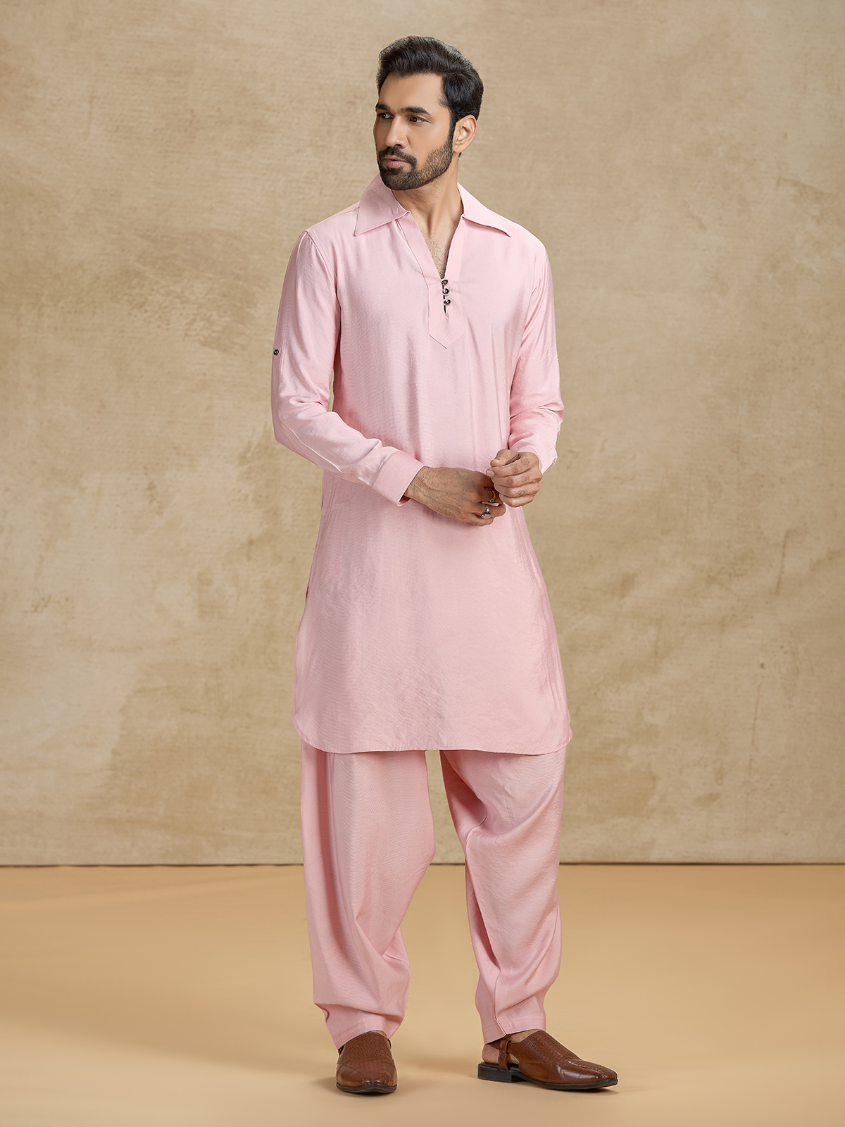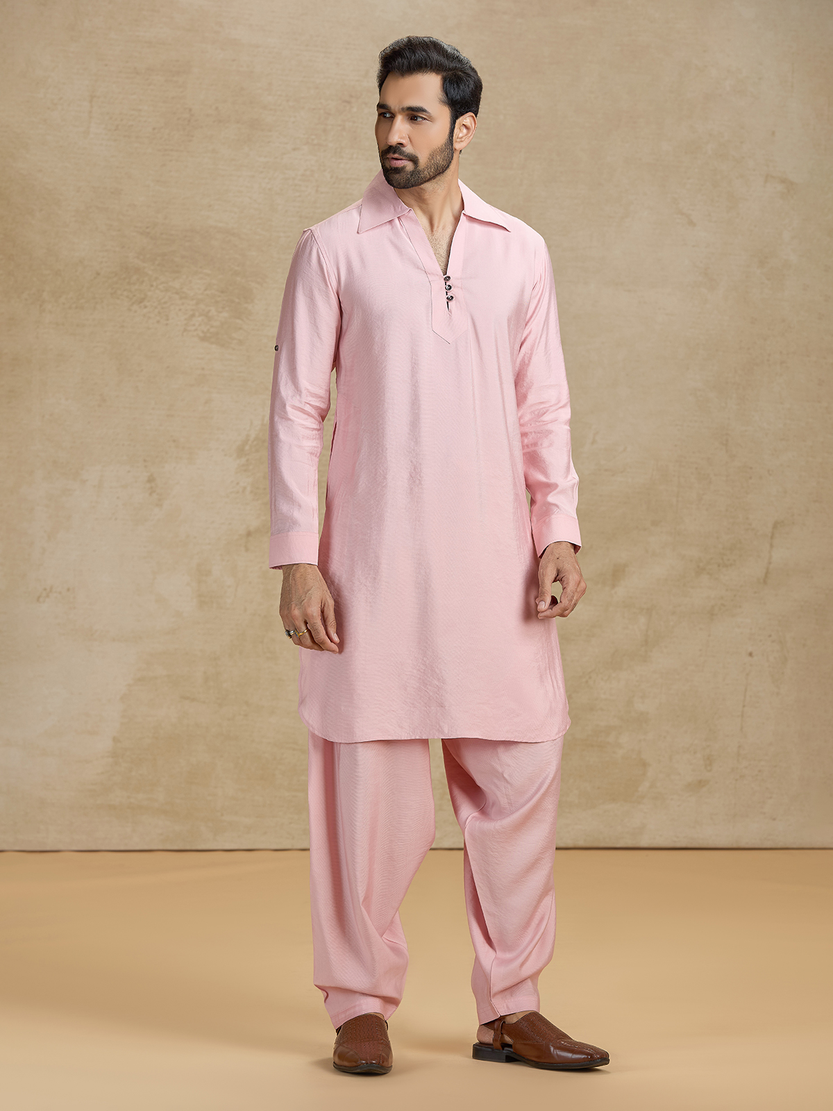 Add a soft yet striking touch to your wardrobe with this blush pink cotton silk Pathani set. The knee-length kurta is detailed with a refined cutaway collar, full sleeves, and a sleek buttoned placket. Paired with a matching salwar, it creates a graceful, premium look for Eid and celebrations.