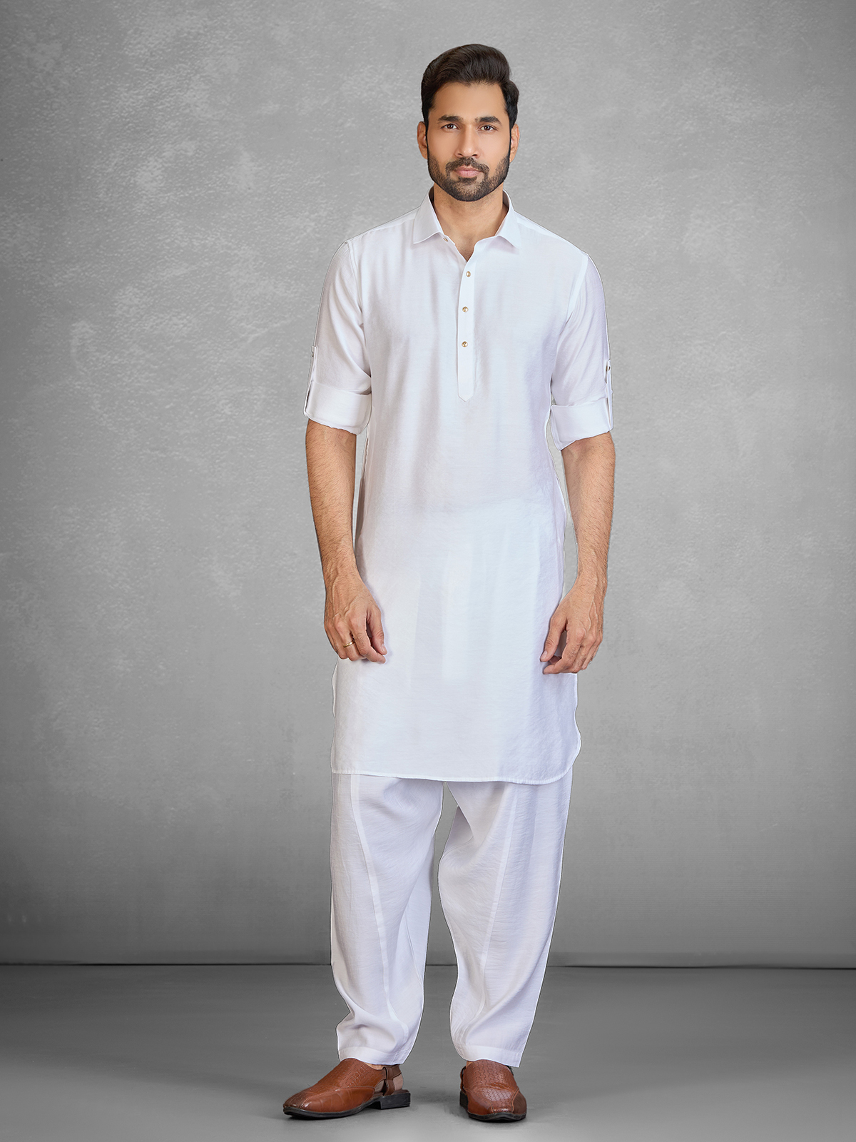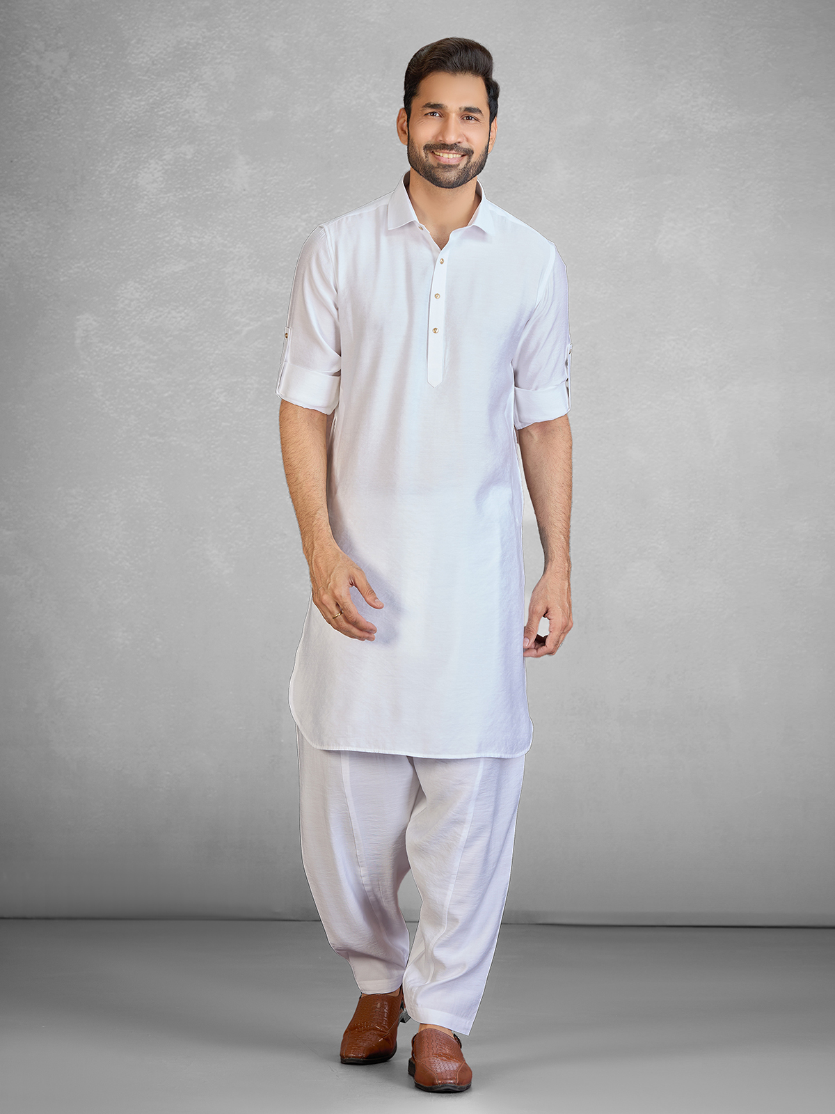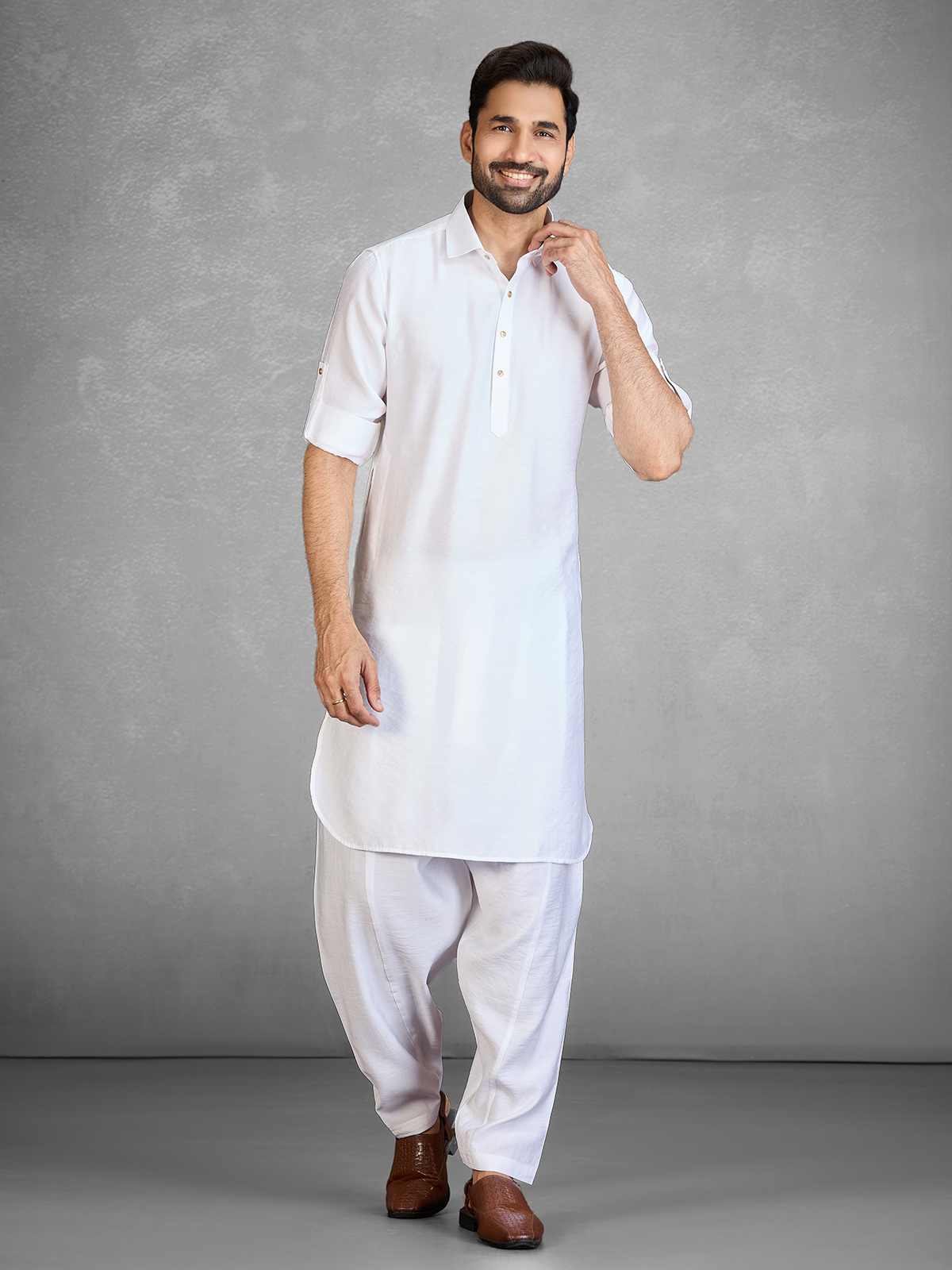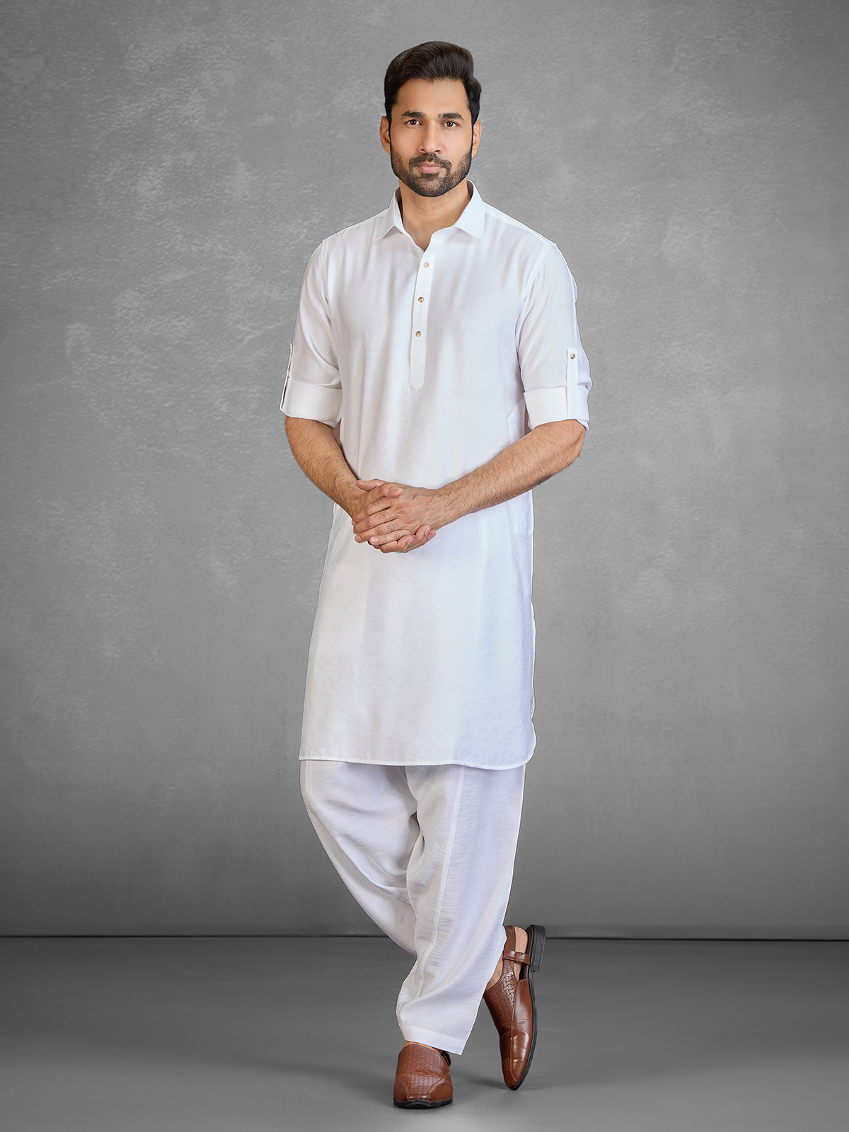 Pure and timeless, this white cotton blend Pathani suit reflects effortless ethnic elegance. The kurta features a button down collar, full sleeves, front button detailing, and a functional pocket for added convenience. Paired with a matching white salwar, this ensemble is perfect for Eid celebrations and traditional festive occasions.