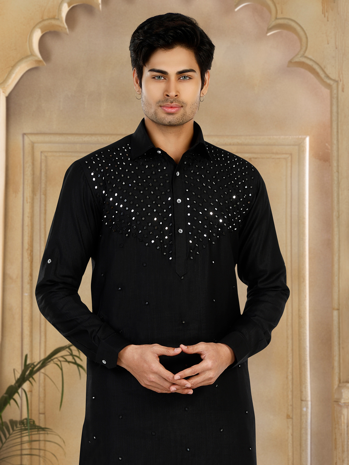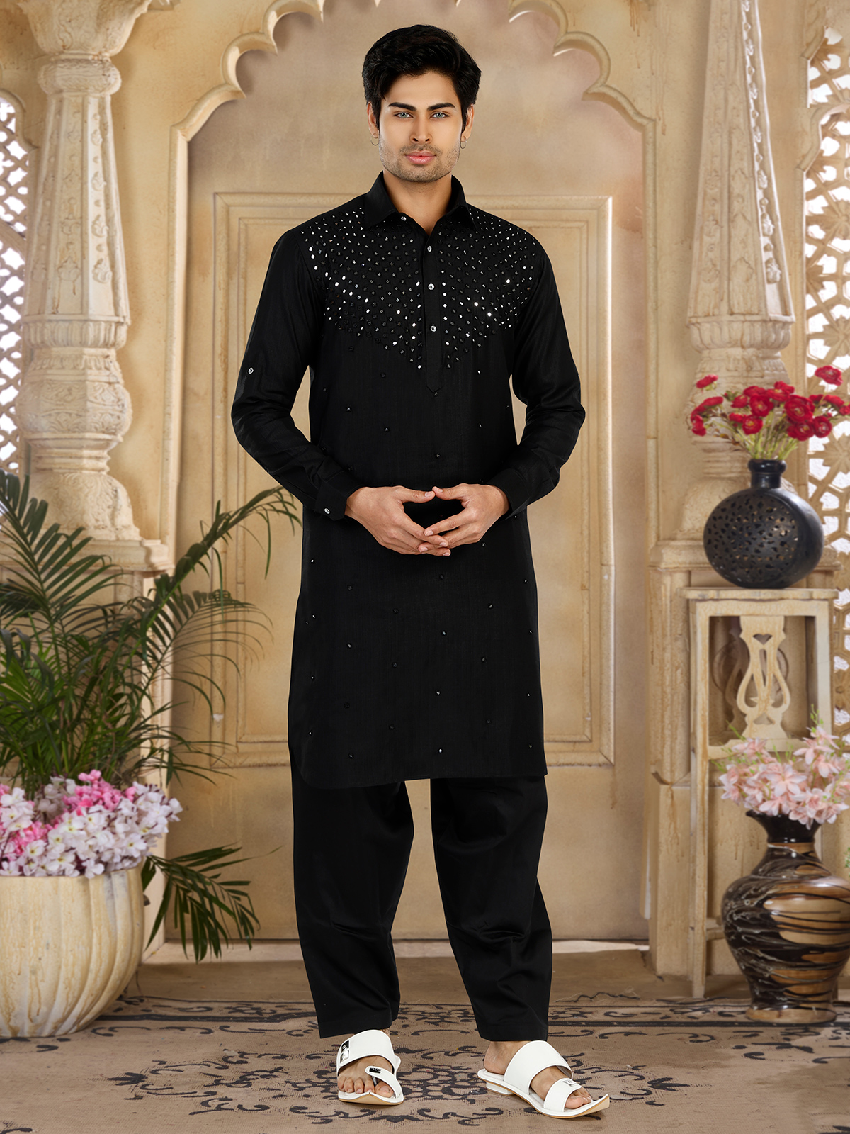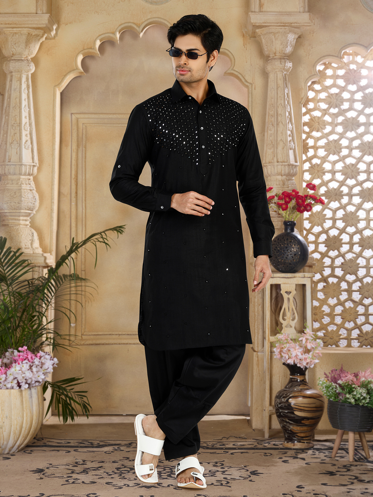 Stay chic and comfortable in our must-have black pathani suit, enhanced with exquisite mirror and resham work. With its collar neck and full sleeves, this suit is perfect for any occasion. Comes with a bottom.