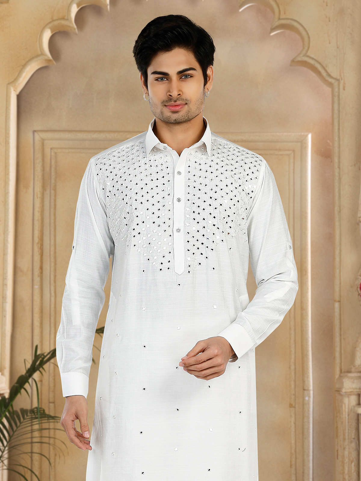 Elevate your look effortlessly with our white pathani suit, adorned with intricate mirror and resham work. Featuring a collar neck and full sleeves, this suit adds a touch of glamour to any ensemble.