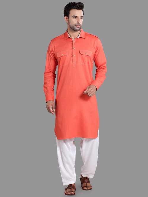 Try this solid orange cotton rayon pathani suit, make featuring with collar neck as well as short buttoned placket, two flap pocket, full sleeves with buttoned cuff, curve vented hem, comes with salwar.