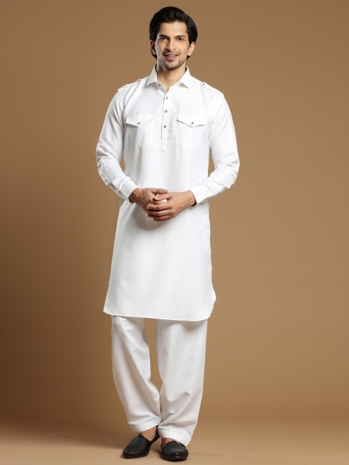 Give your perfect ethnic look with this festive occasions white men plain pathani suit in cotton silk. It comes with collar neck, full sleeves with cuffs, half buttoned placket, curve vented hemline, two patch pocket with flap. Comes with cotton salwar.