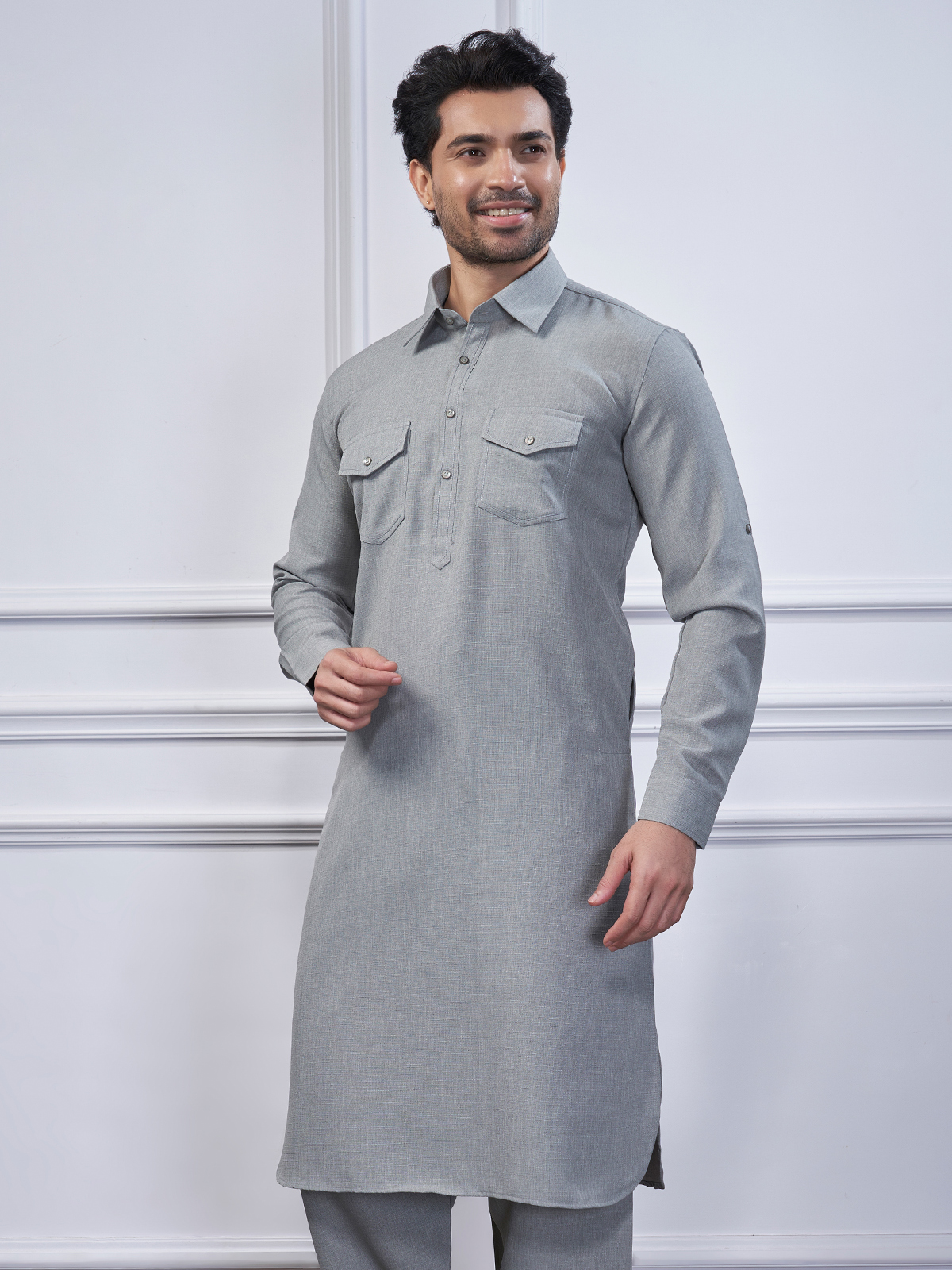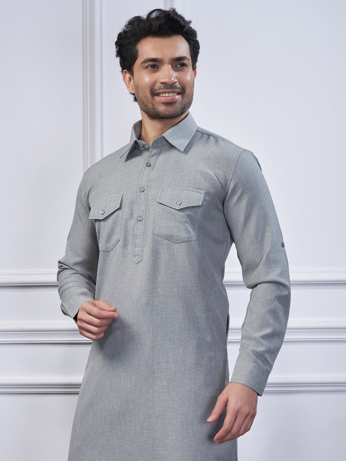 Update your eid wardrobe with our elegant grey pathani suit. Crafted from soft cotton, it features a smart cutaway collar and full sleeves that can be rolled up for added style and comfort ideal for any festive celebration.