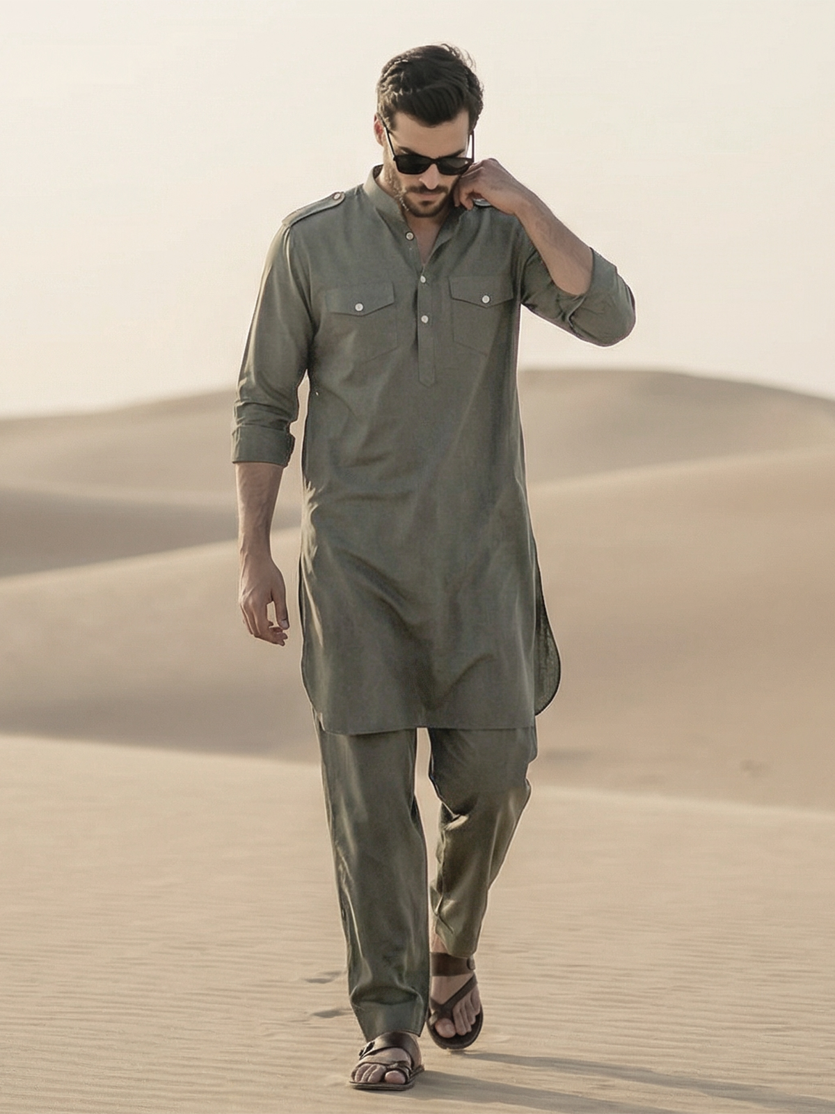 This grey pathani suit offers a perfect balance of modern style and traditional charm. Made from lightweight cotton, it features a mandarin collar and concealed buttons. Suitable for eid, festive celebrations, and parties, the full sleeve design ensures comfort with a clean, polished ethnic look.