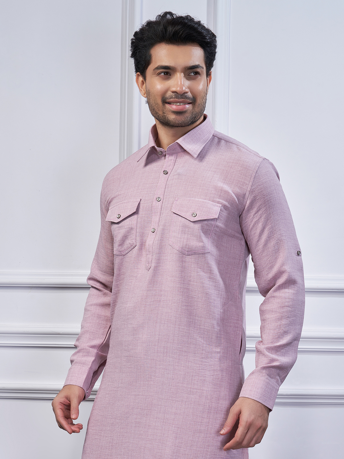 Stand out in our radiant lilac purple pathani suit. The rayon cotton fabric adds a luxurious touch, while the cutaway collar and flexible sleeves provide a stylish balance of tradition and trend.