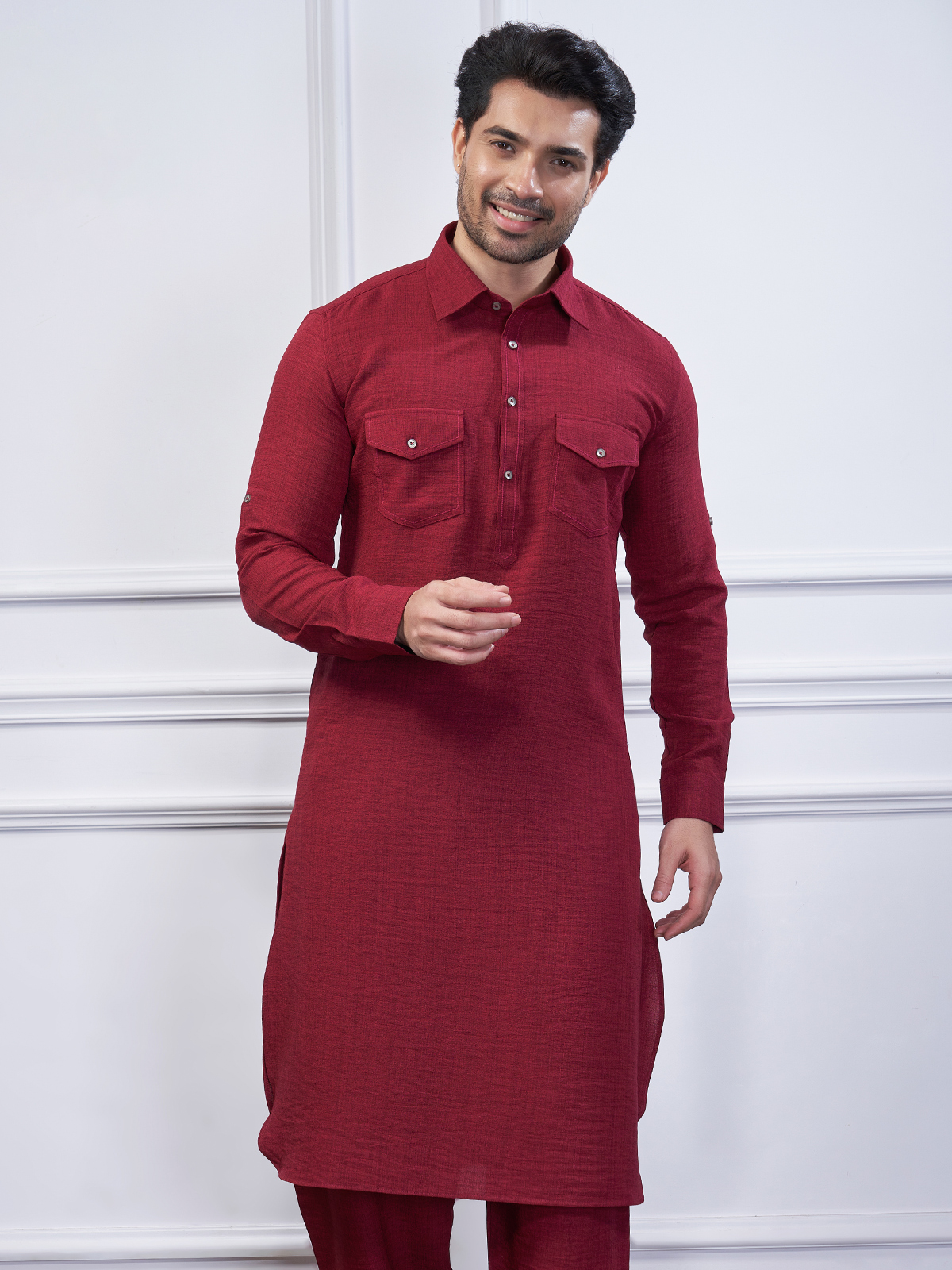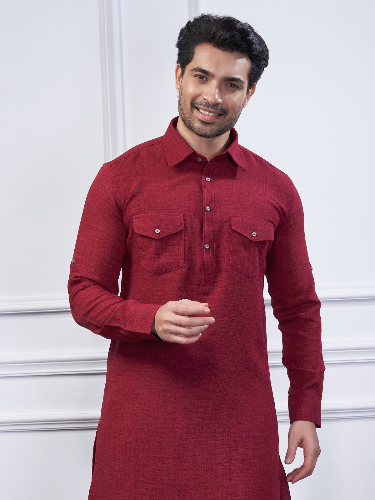 Make a subtle yet stylish statement this eid with our maroon pathani kurta suit. The cotton fabric ensures comfort while the cutaway collar and full sleeves create an effortlessly refined festive look.