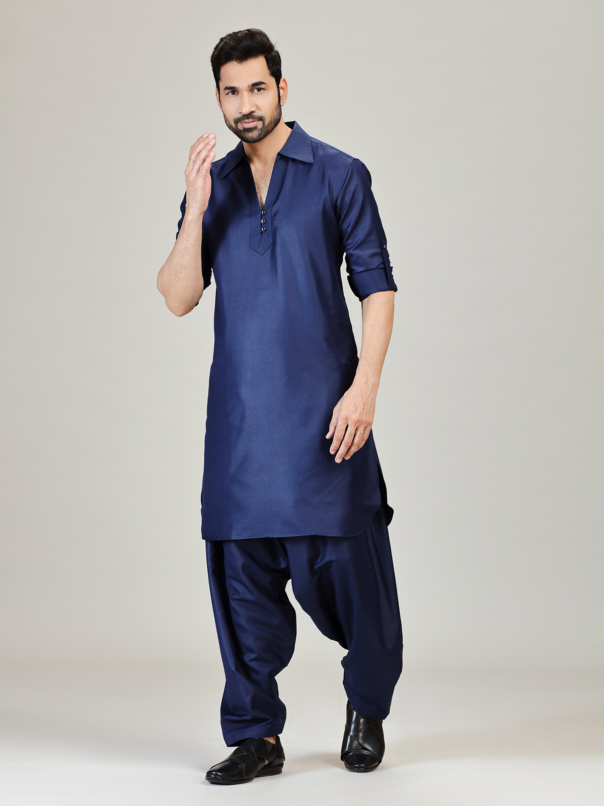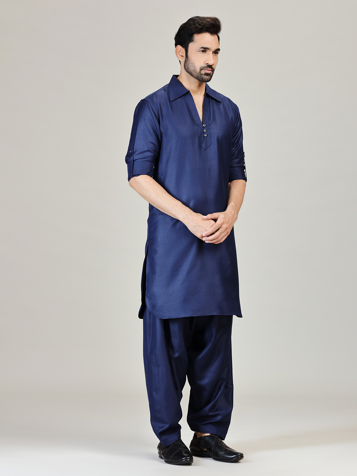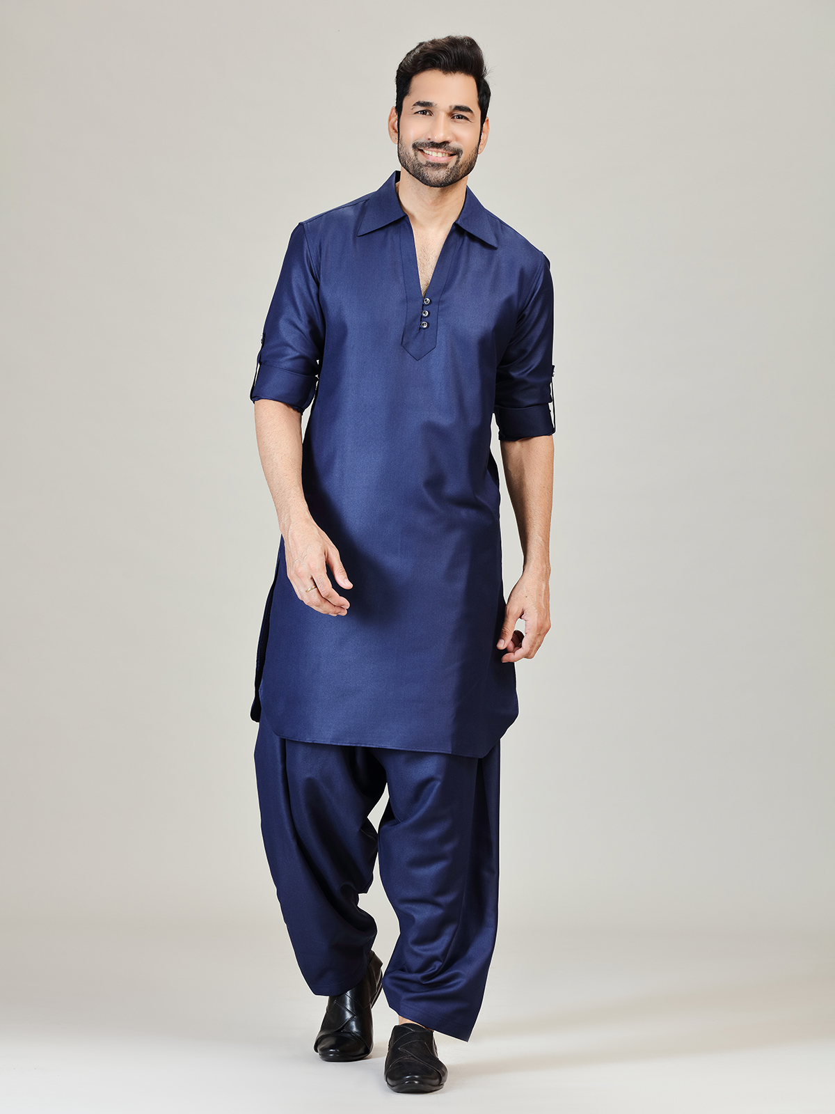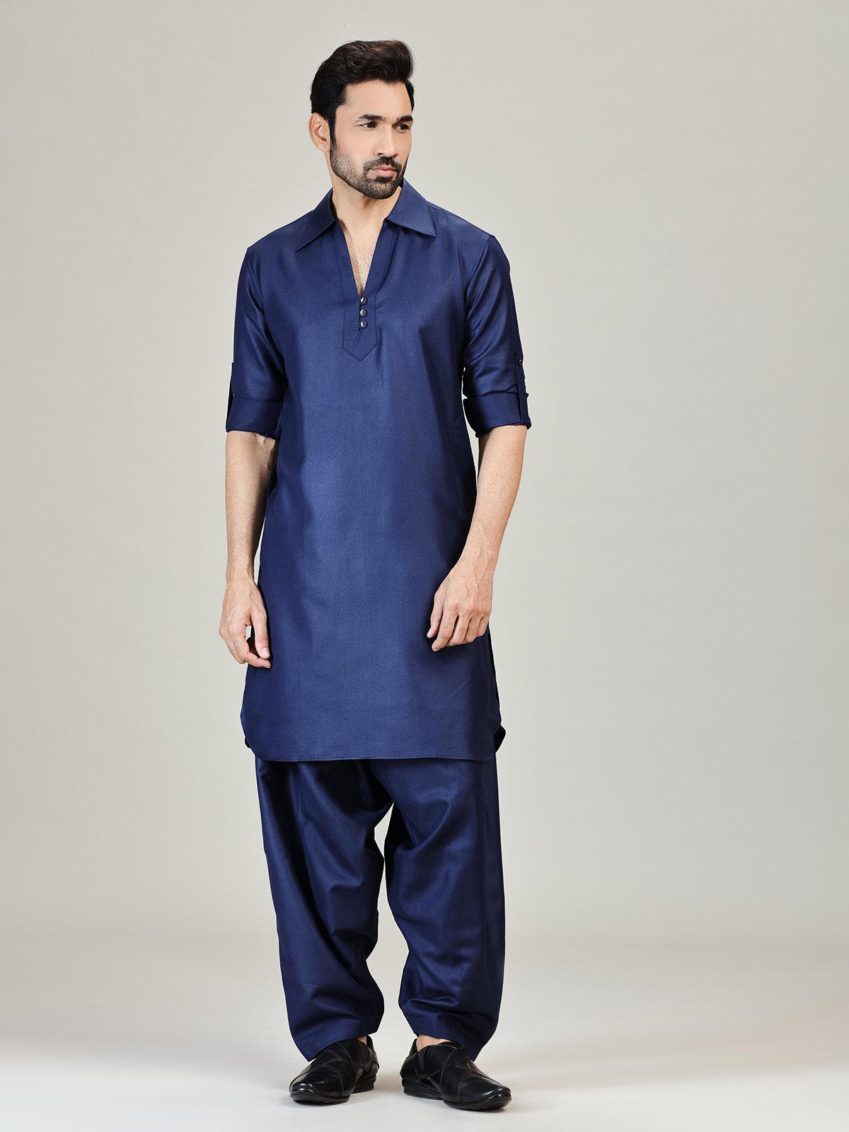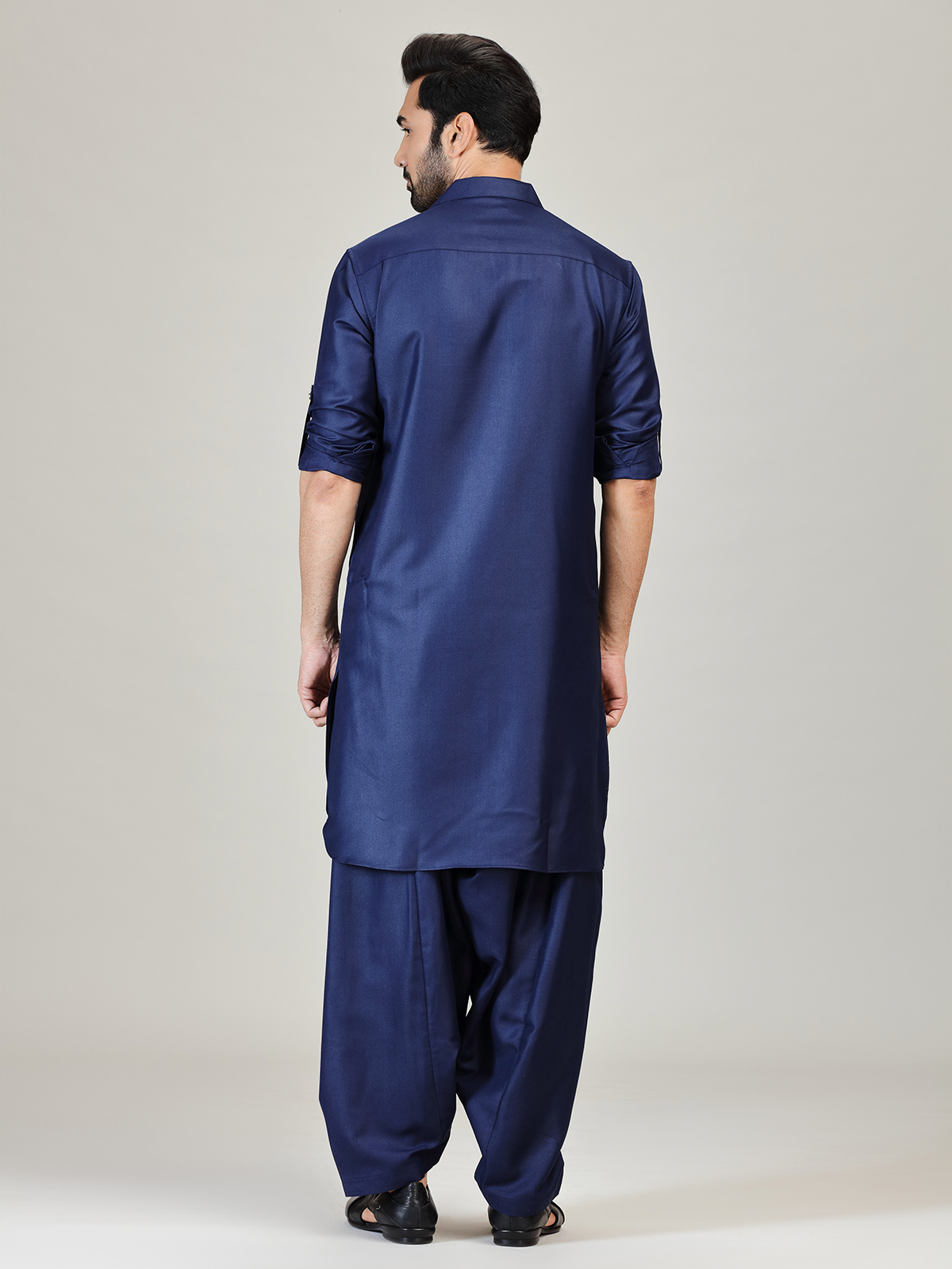 Make a distinguished statement in this navy cotton silk Pathani kurta suit styled for modern festive charm. Designed with a sharp cutaway collar and full sleeves, the plain finish enhances its structured elegance. Perfect for festivals and Eid gatherings, it comes coordinated with a classic salwar for a complete ensemble.