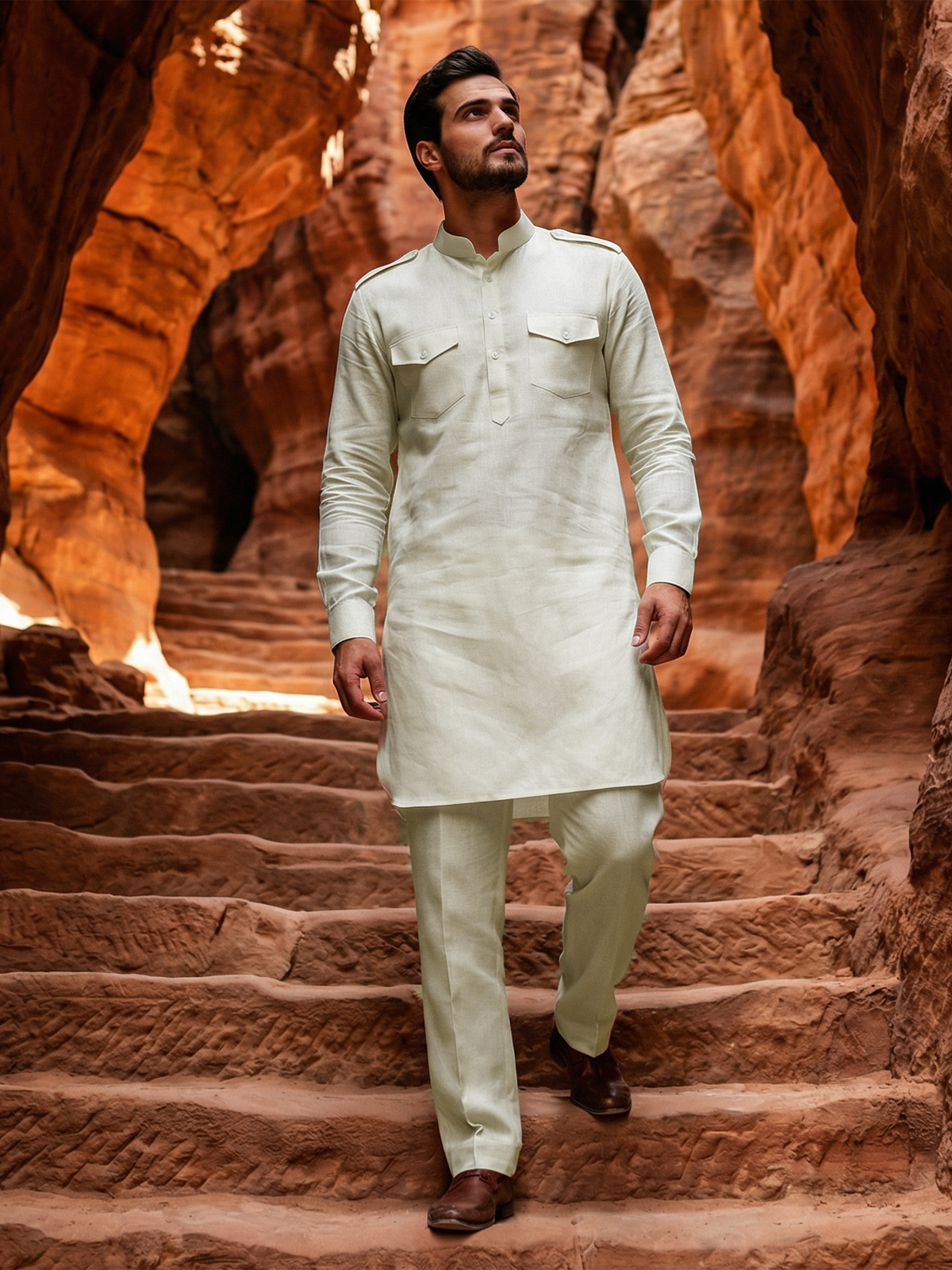 Elevate your festive look with this pista green pathani suit made from smooth cotton. Featuring a neat mandarin collar and concealed button placket, it offers a refined and modern ethnic style. Ideal for eid, family gatherings, and parties, the full sleeves ensure comfort with classy elegance.