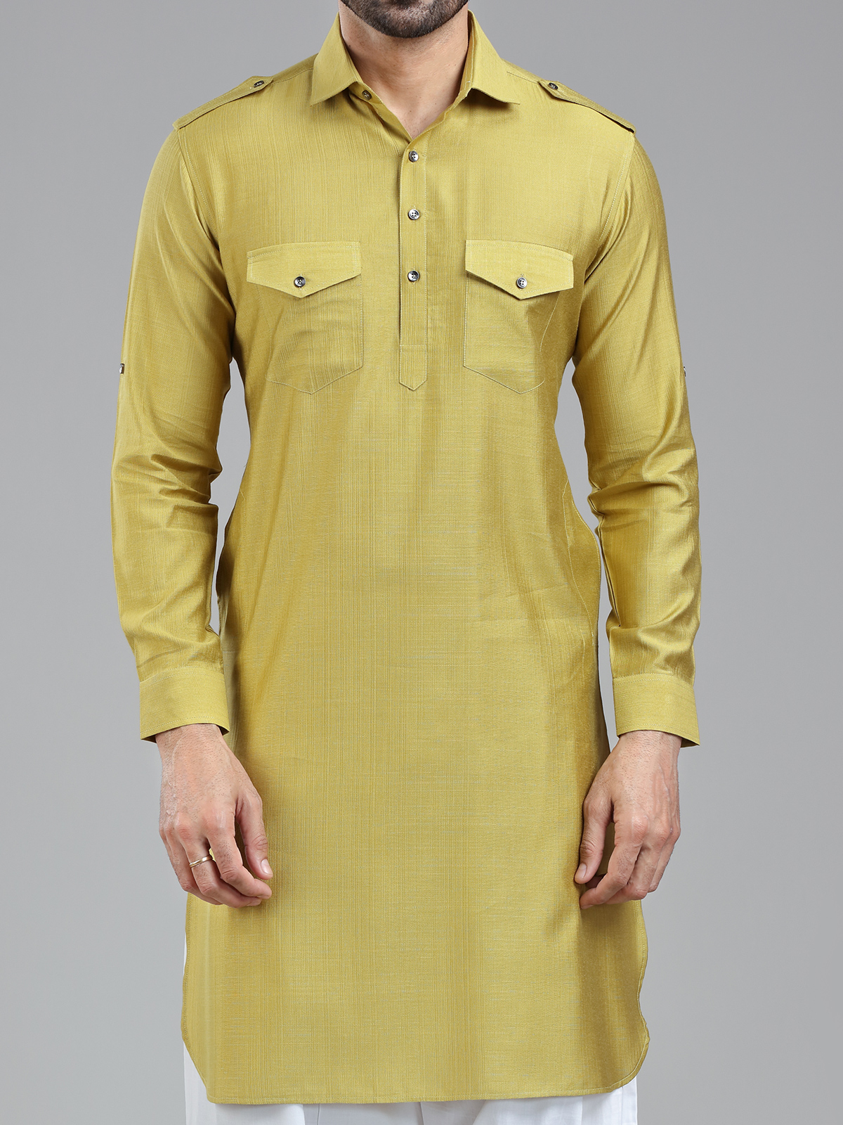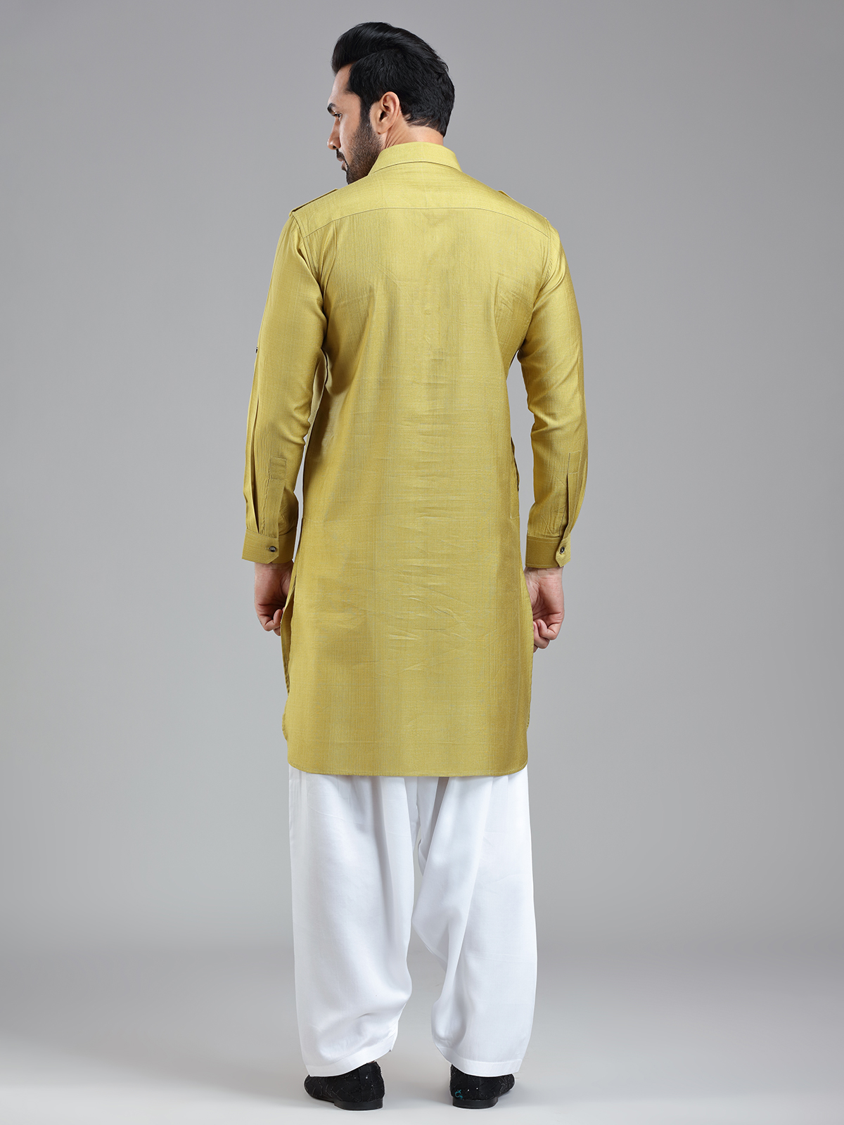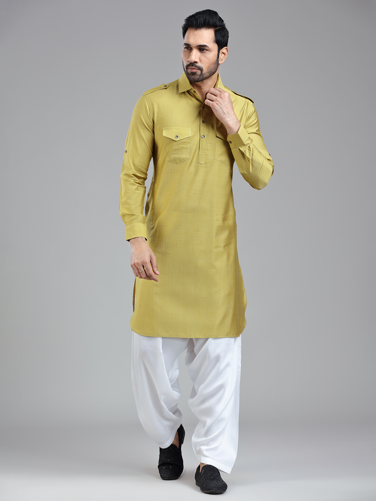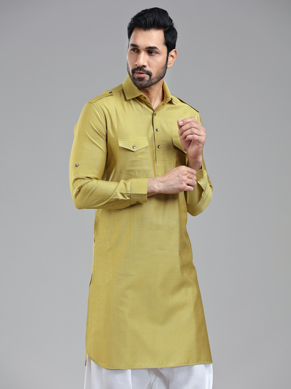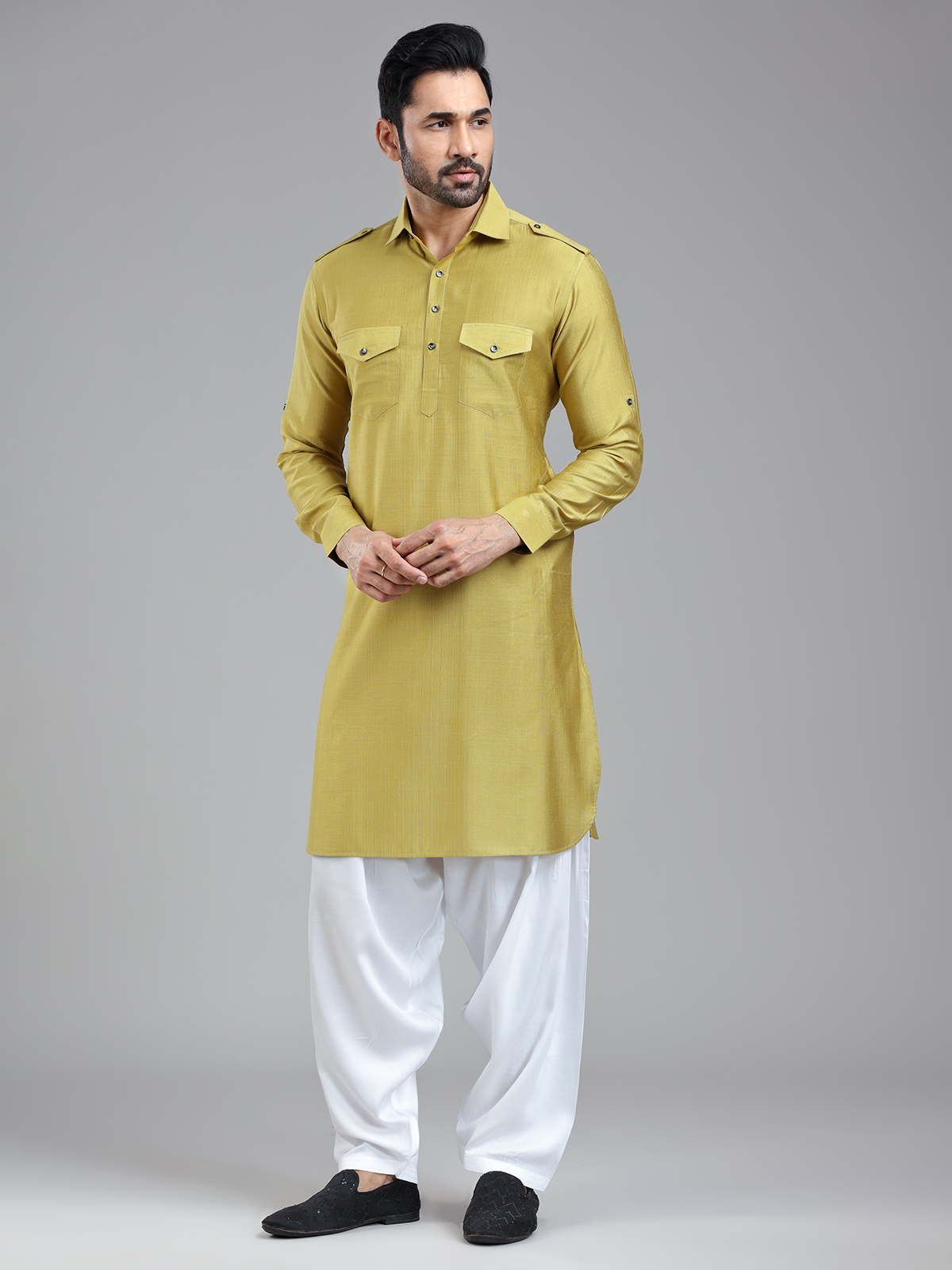 Radiant Golden Pathani Kurta Set For A Bold Style