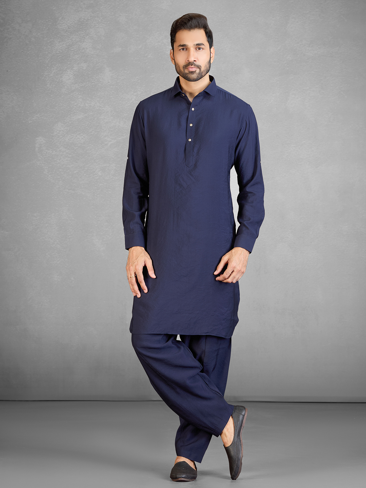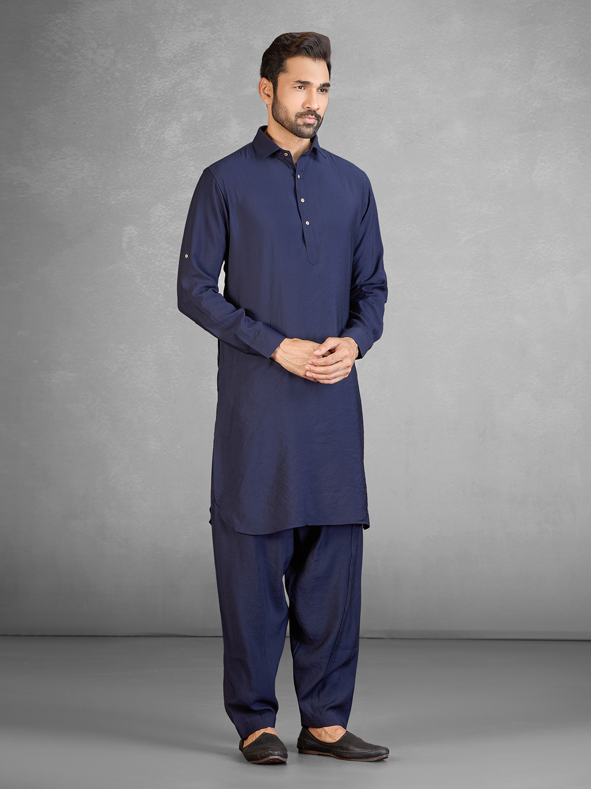 Elegant and versatile, this navy cotton blend Pathani suit offers a sharp festive appearance. The kurta is styled with a button down collar, full sleeves, and front button detailing along with a functional pocket. Paired with a matching navy salwar, this ensemble is perfect for Eid celebrations and festive occasions.