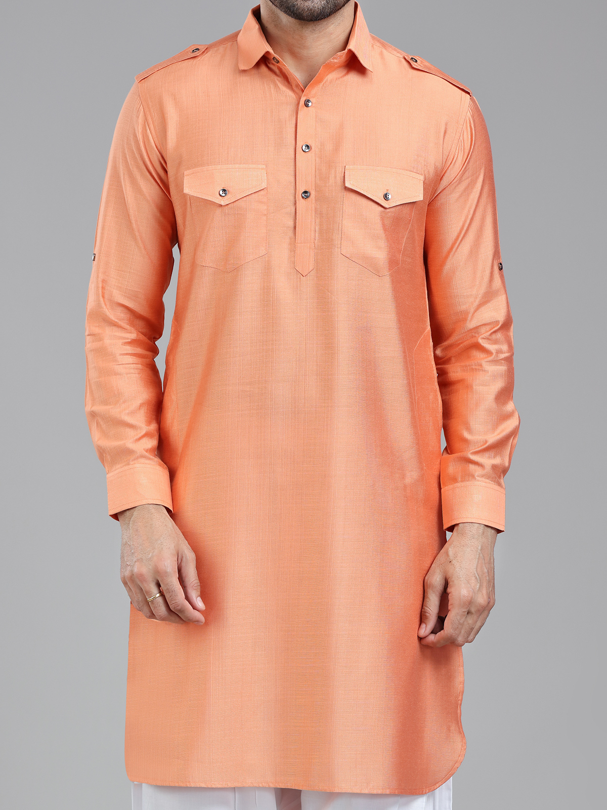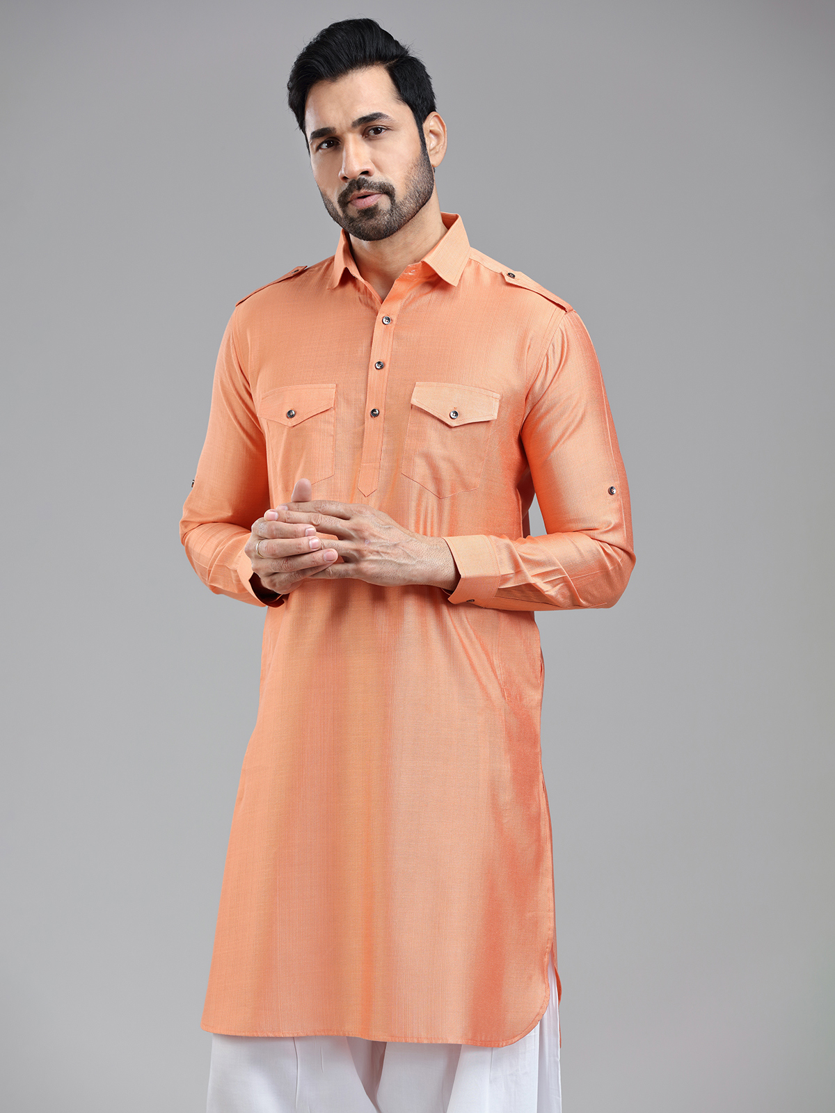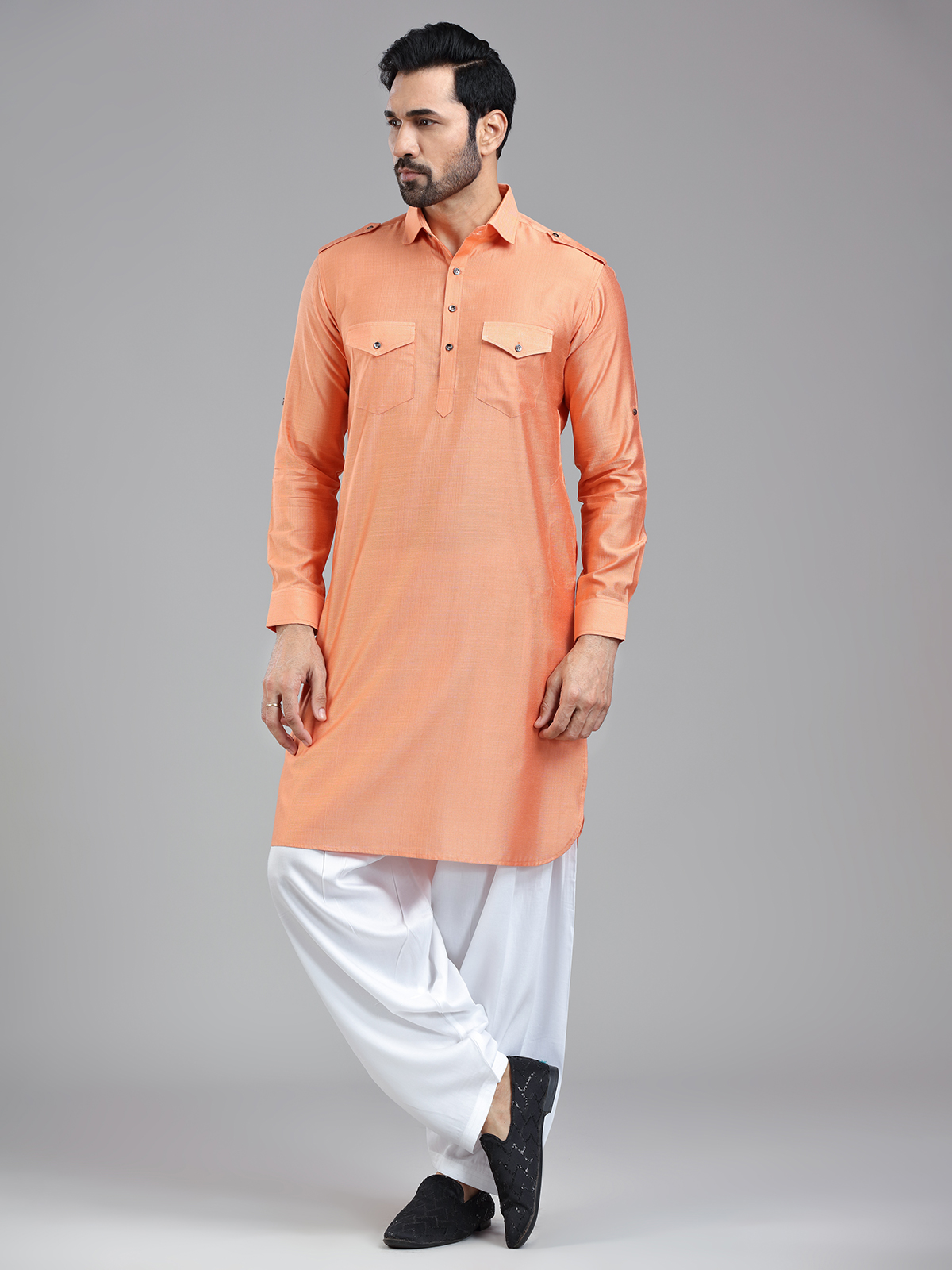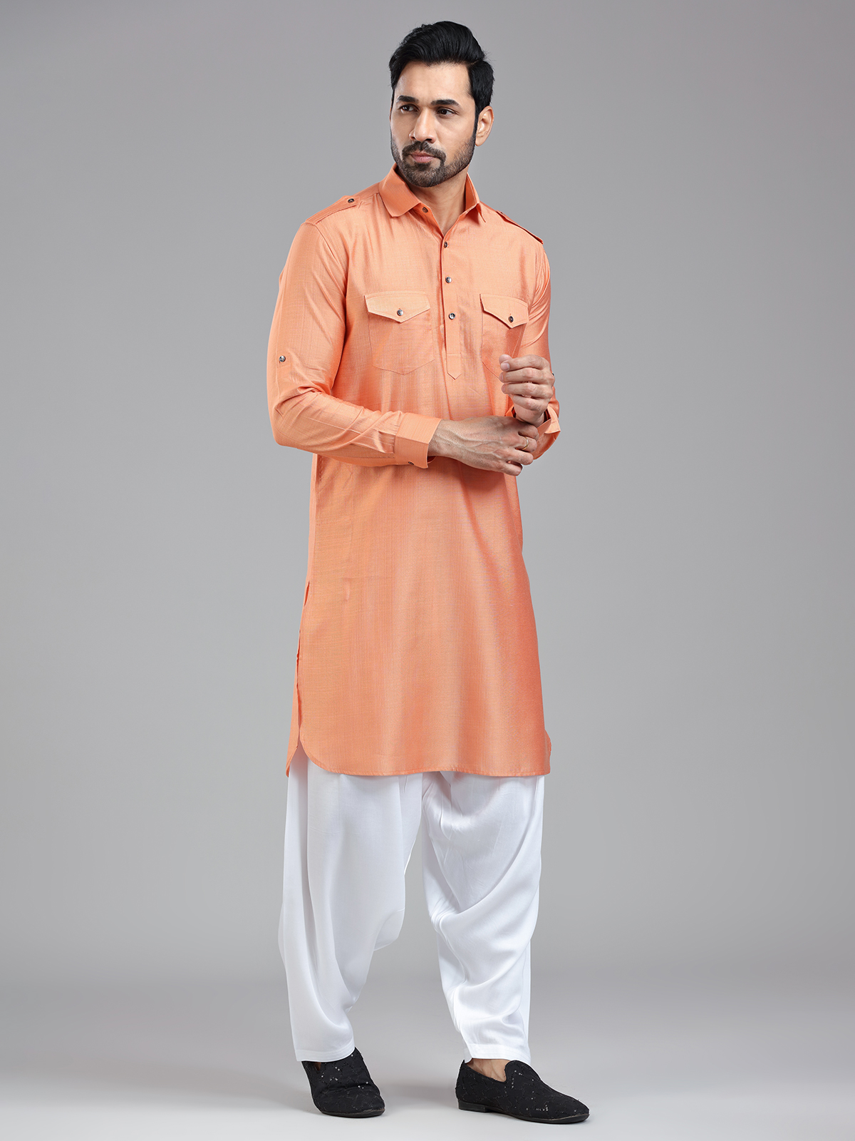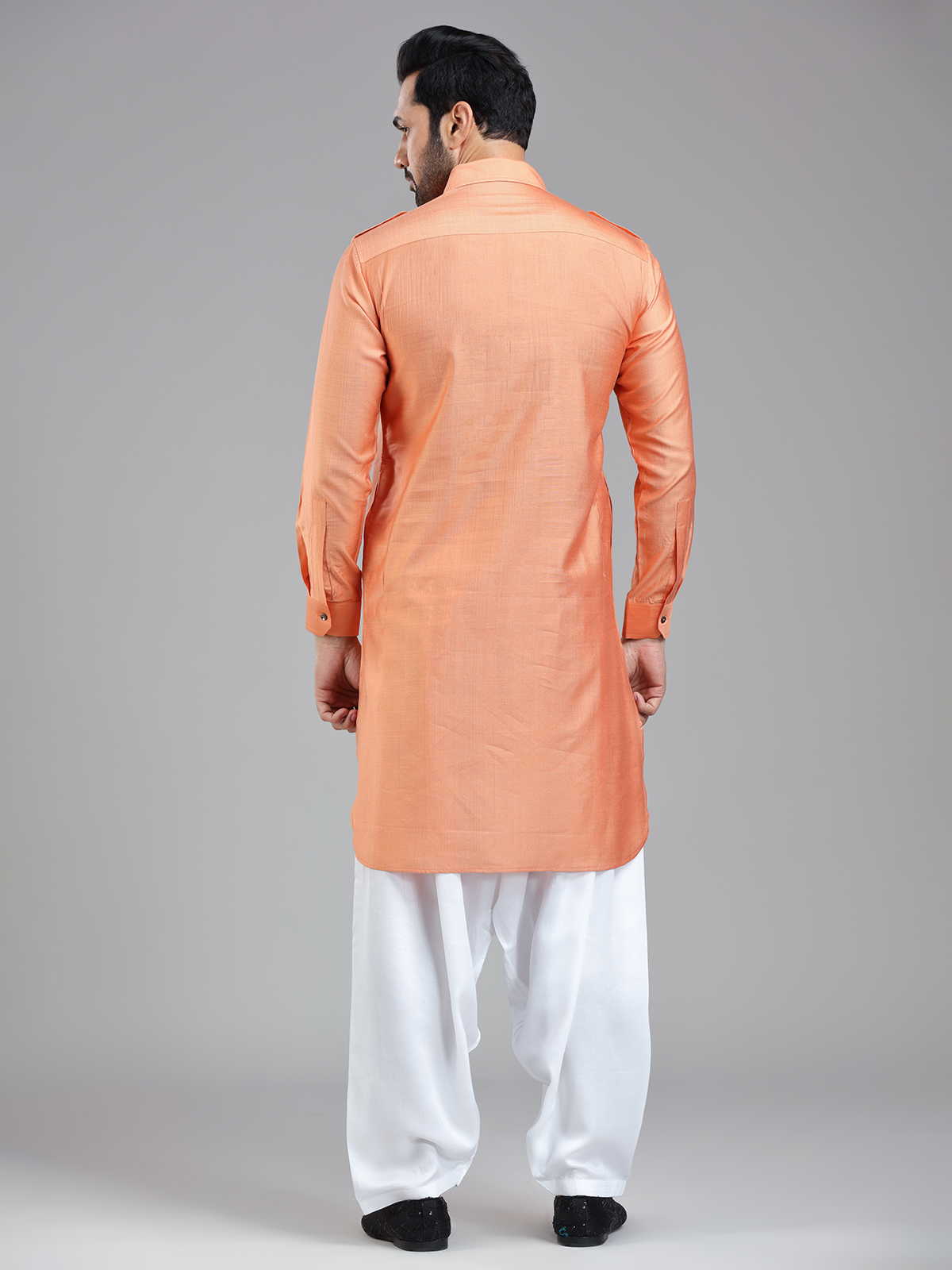 Refreshing Salmon Peach Pathani Kurta Suit For Men