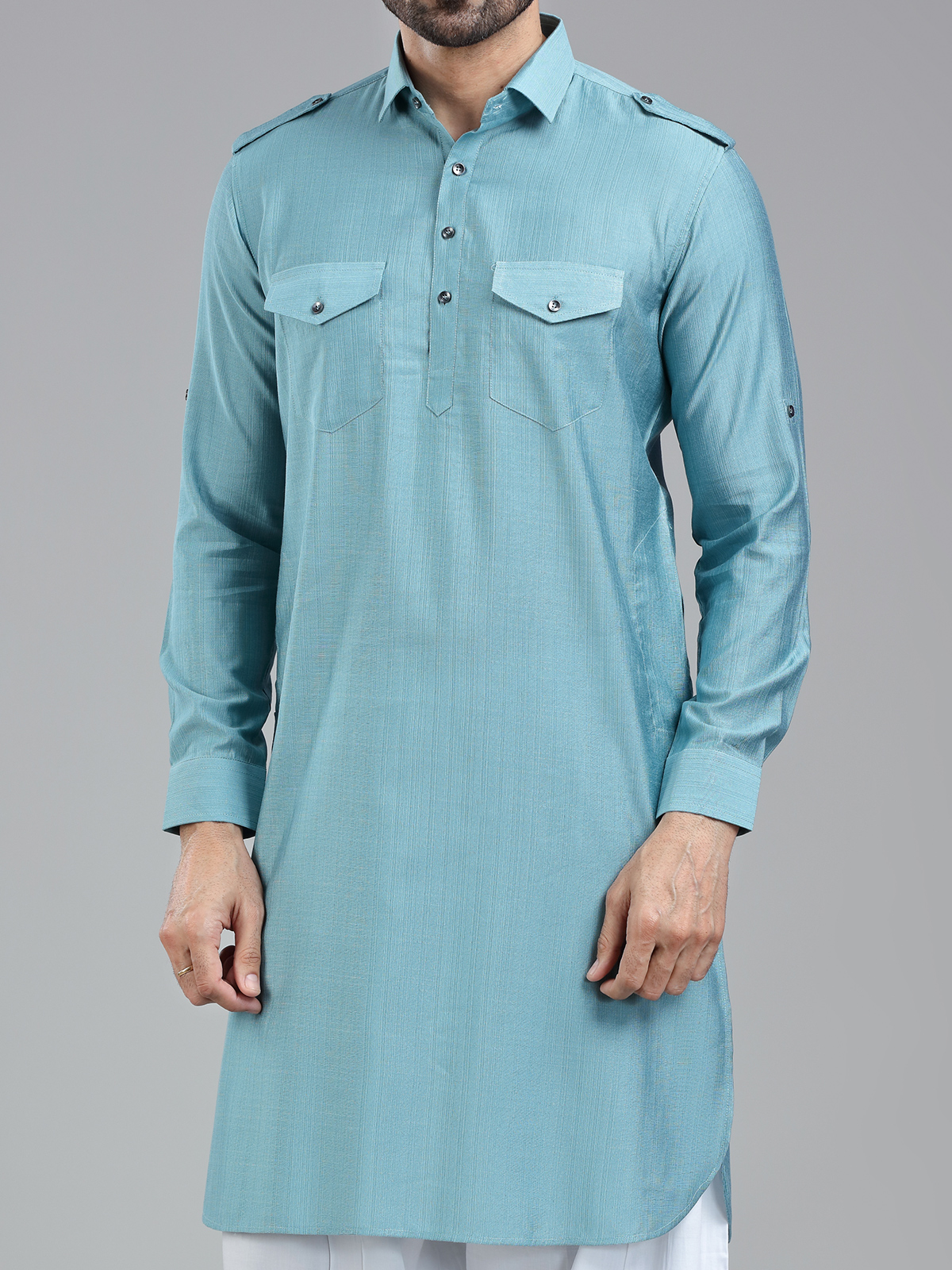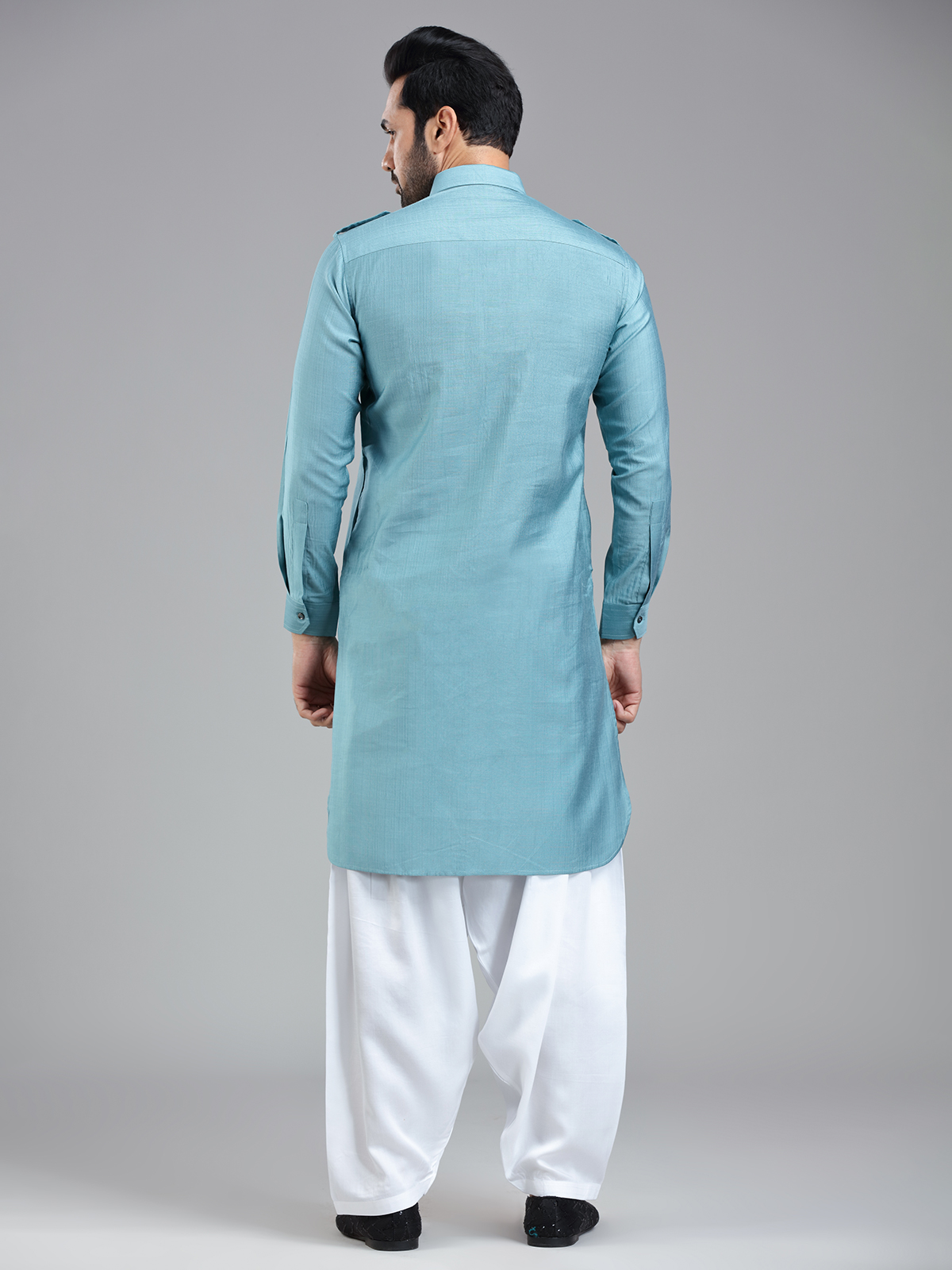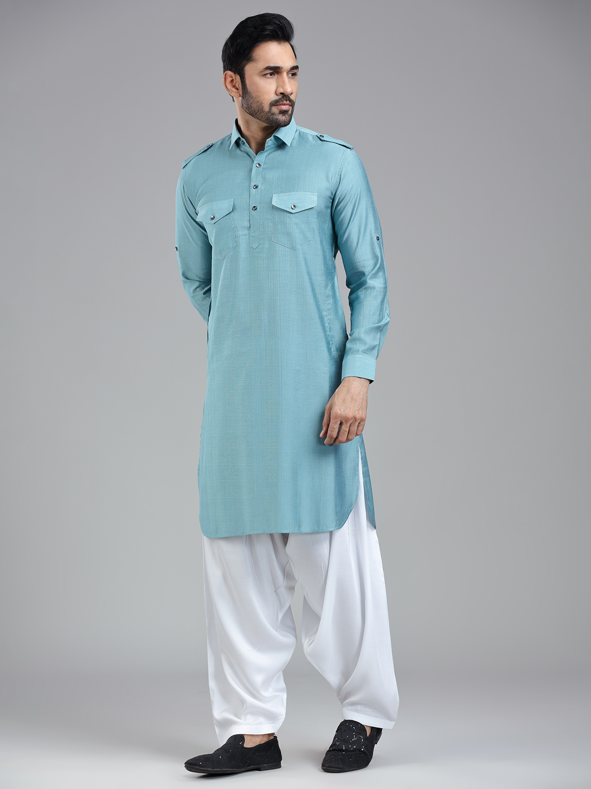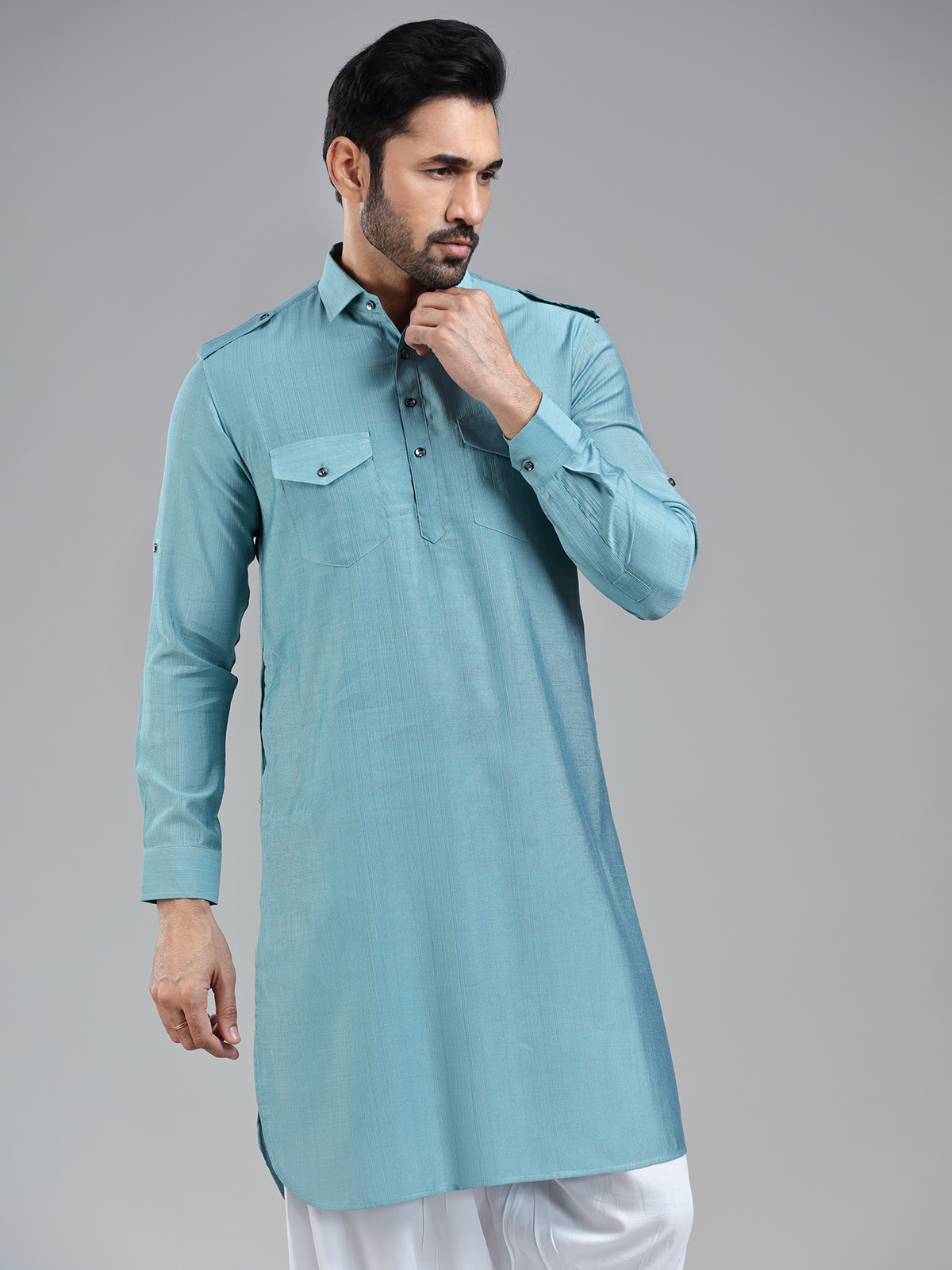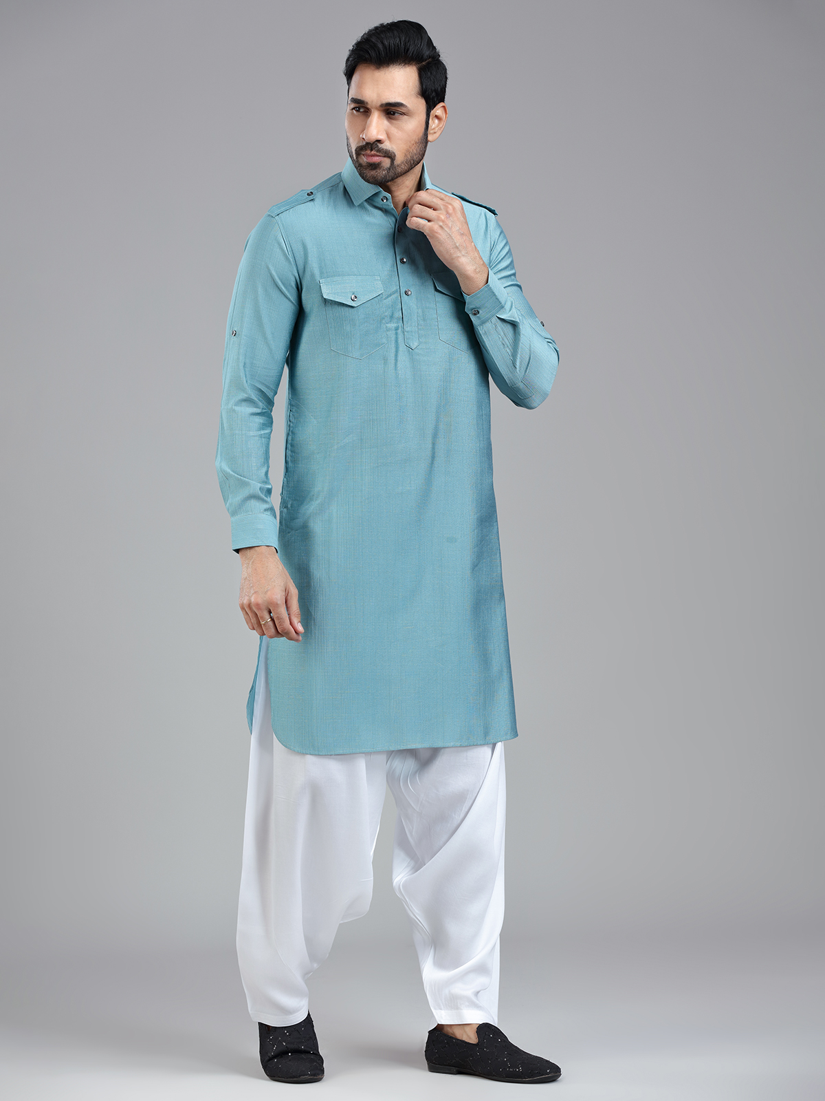 Add a regal touch to your Eid celebrations with our Firozi blue Pathani suit. This vibrant yet sophisticated shade of blue, paired with luxurious rayon cotton fabric, ensures a standout look. The cutaway collar, three-button placket, and dual chest patch pockets offer the perfect balance of functionality and style. Full sleeves can be rolled up or kept down, allowing you to adapt your look to suit any occasion.