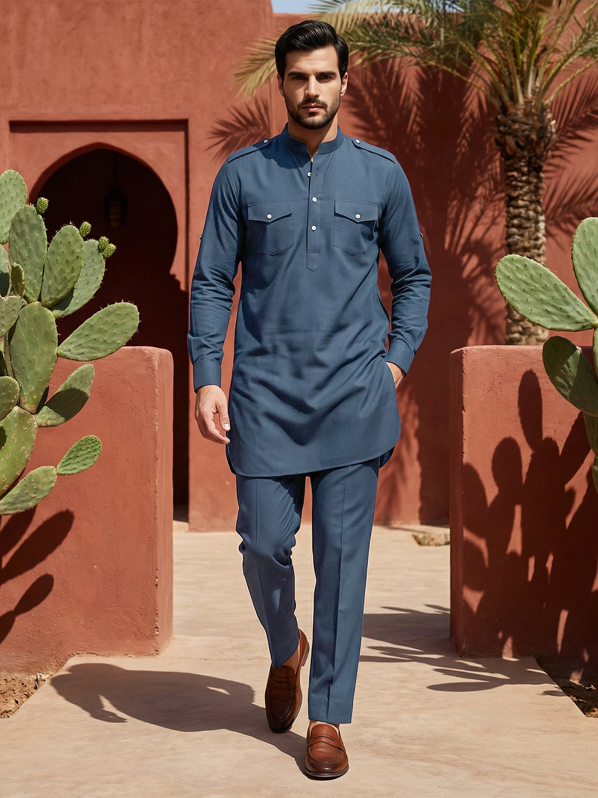 Stand out during festive celebrations with this royal blue pathani suit in soft cotton fabric. Designed with a mandarin collar and hidden button placket, it delivers a modern ethnic look. Ideal for eid, parties, and family functions, the full sleeves ensure comfort and sharp styling.