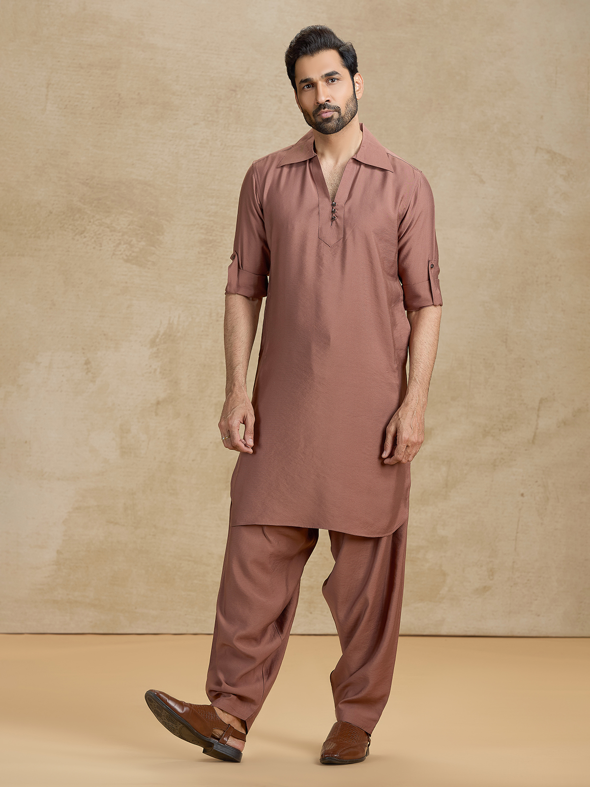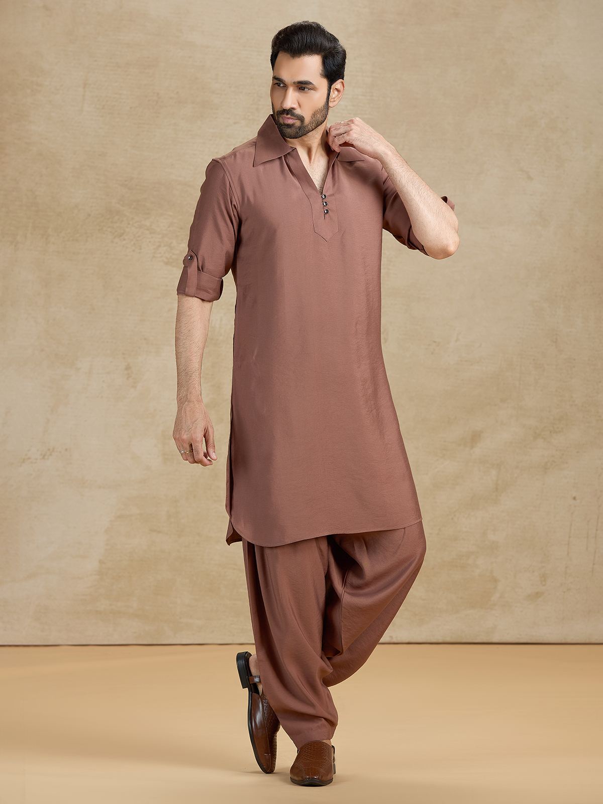 Elevate your festive style with this royal brown cotton silk Pathani set, designed for refined celebrations. The knee-length kurta features a sharp cutaway collar, full sleeves, and an elegant buttoned placket for a structured finish. Paired with a matching Pathani salwar, it delivers luxurious comfort and timeless ethnic sophistication.