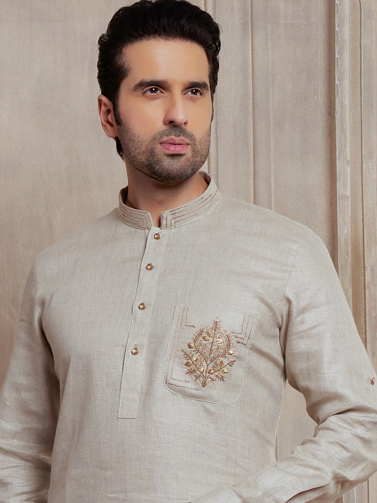 Made from premium quality linen fabric, this beige pathani suit is soft, lightweight and comfortable to wear. Enhanced with embroidery work makes it truly remarkable. It comes with a bottom.