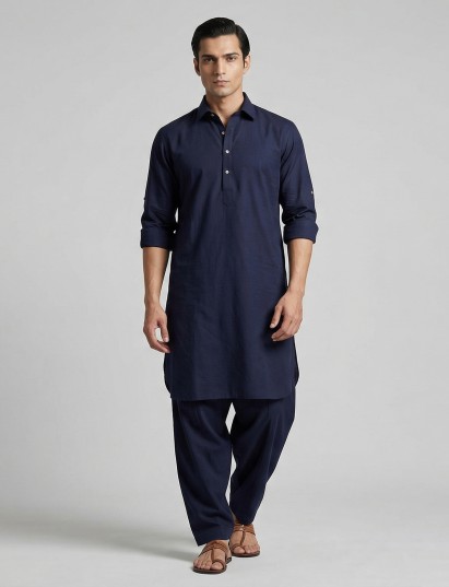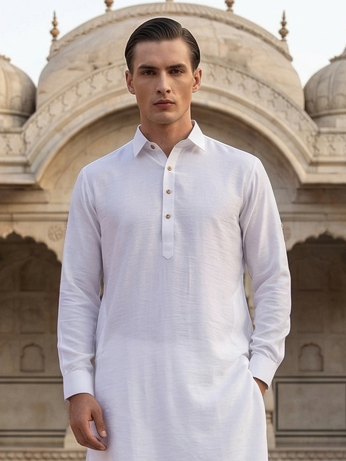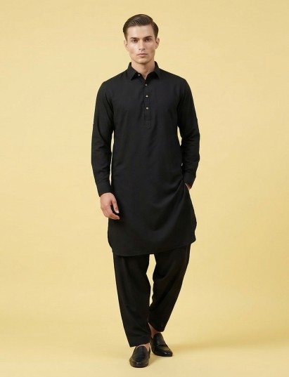 Pure white elegance defines this cotton silk pathani suit designed for timeless festive style. The kurta features a classic collar neckline with full sleeves, offering a refined and traditional appeal. Crafted in smooth cotton silk fabric. It is paired with a relaxed salwar bottom that enhances its authentic silhouette, making this ensemble a graceful choice for eid celebrations and festive gatherings.