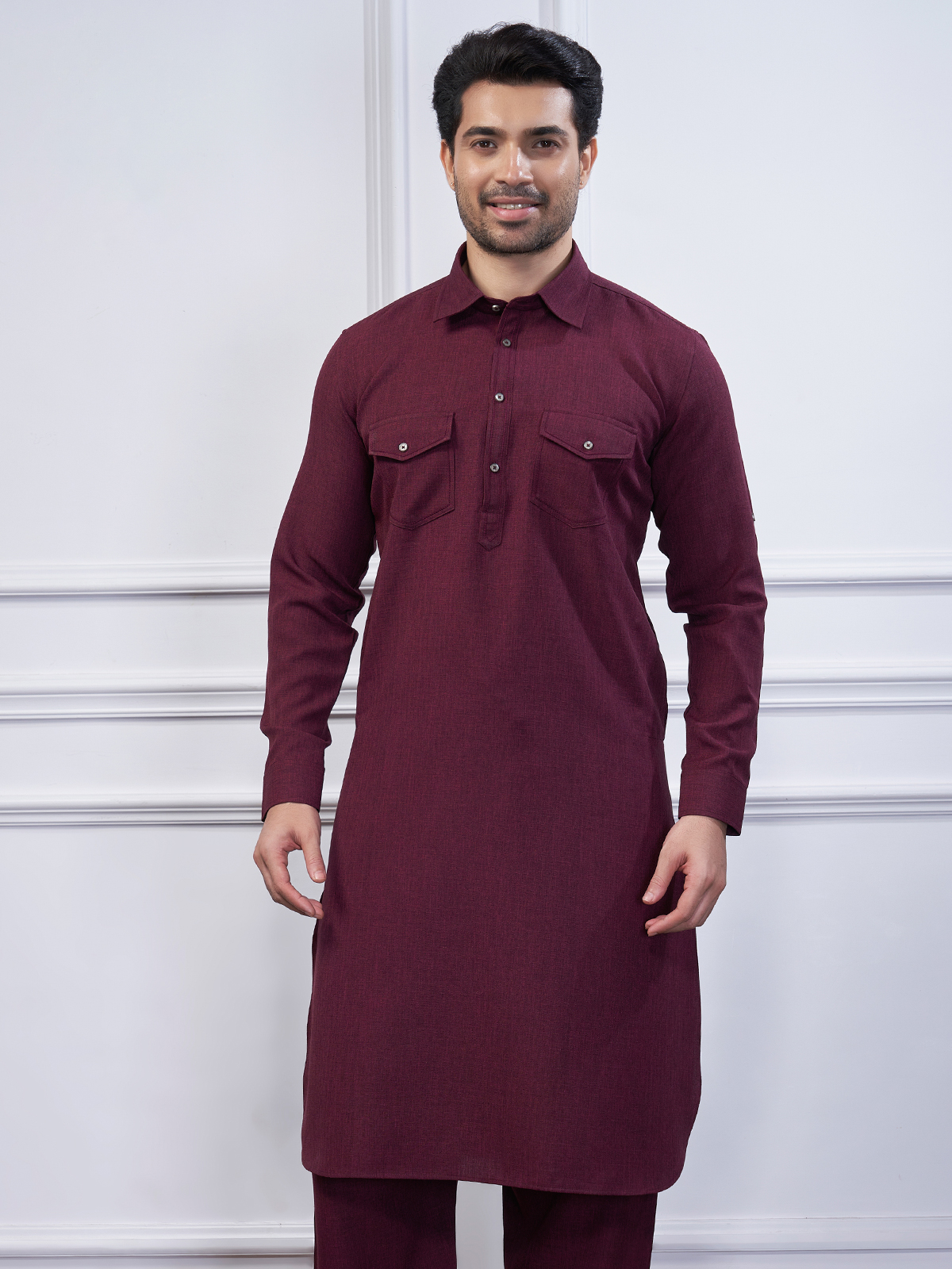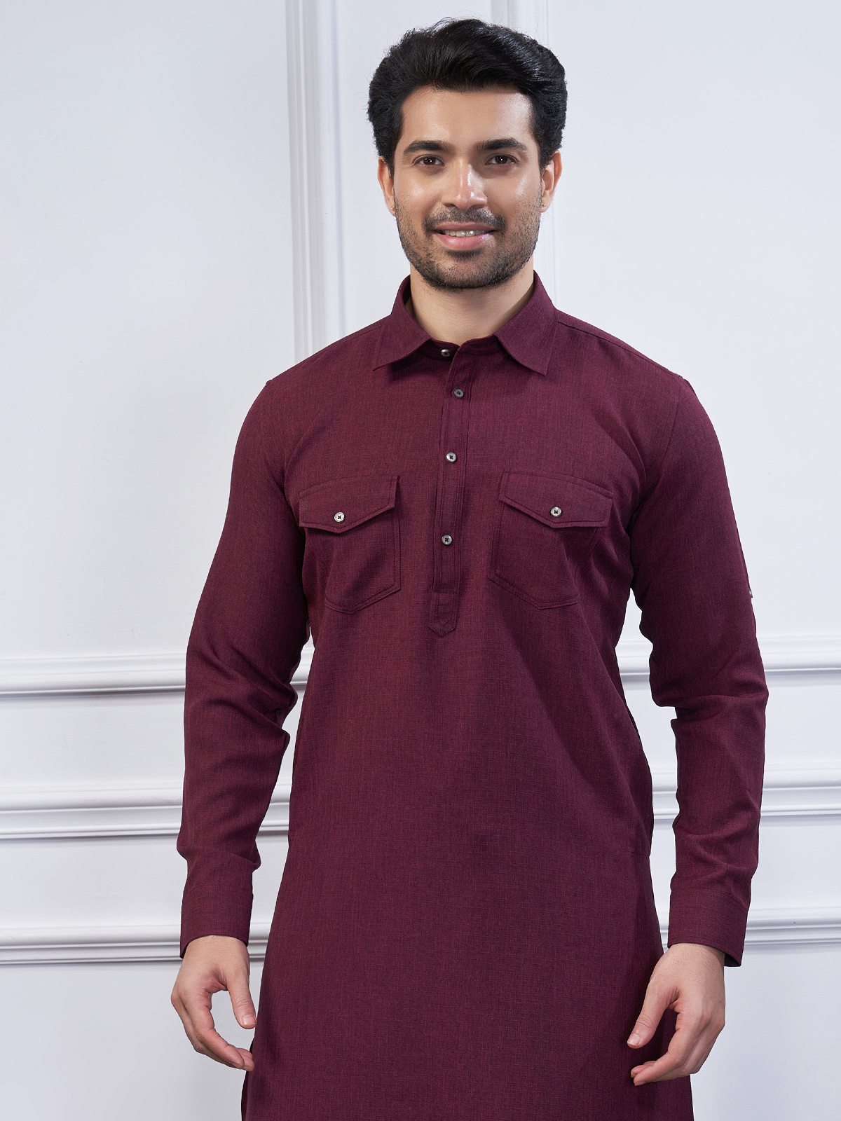 Our wine colored pathani kurta set is perfect for a polished eid appearance. Designed from breathable cotton, it features a cutaway collar and full sleeves that offer versatile styling options.
