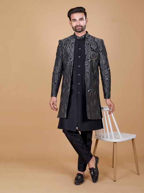 Stand out in this Black silk Indowestern, featuring captivating embroidery for a uniquely sophisticated look. Includes bottom.