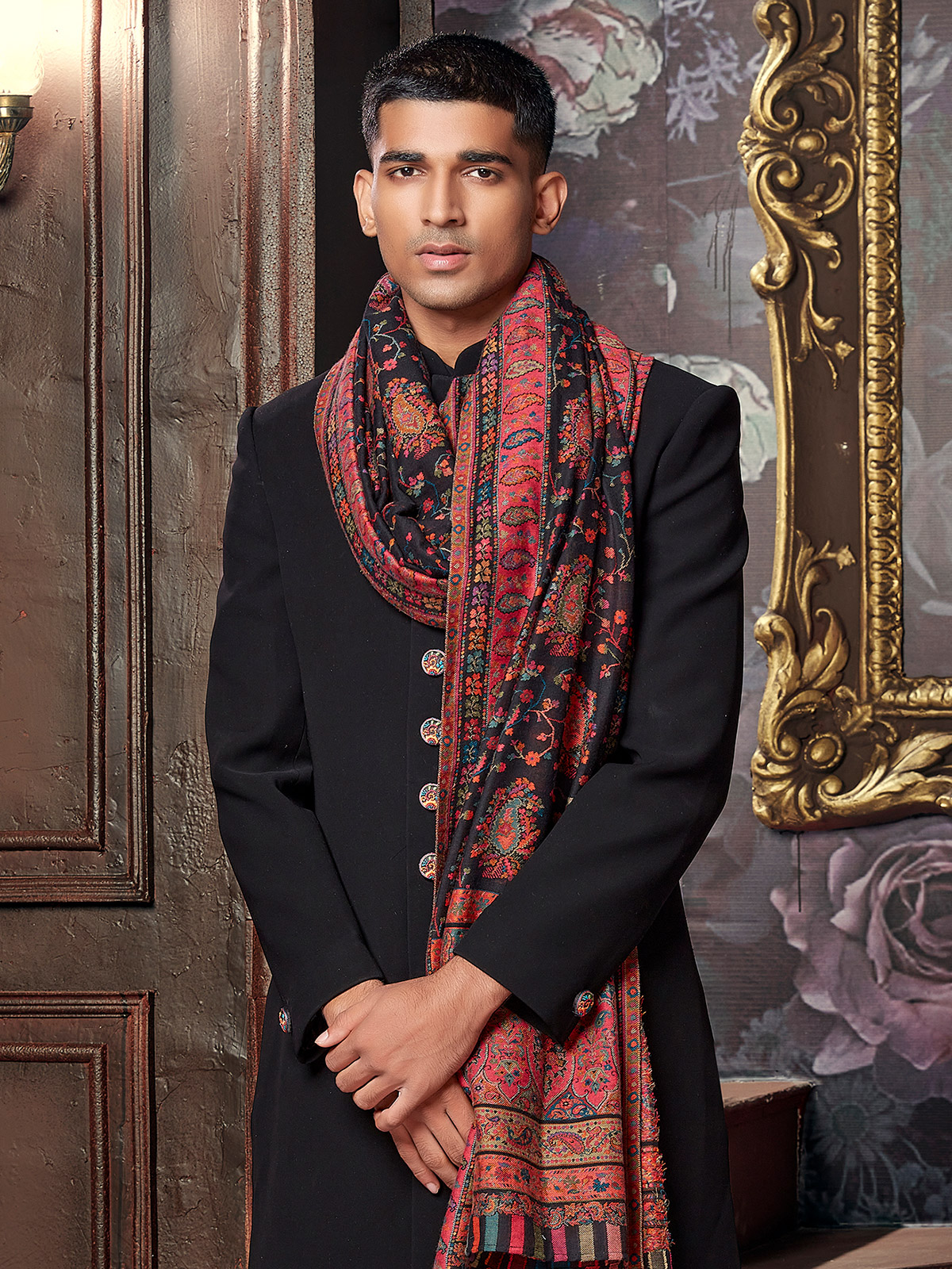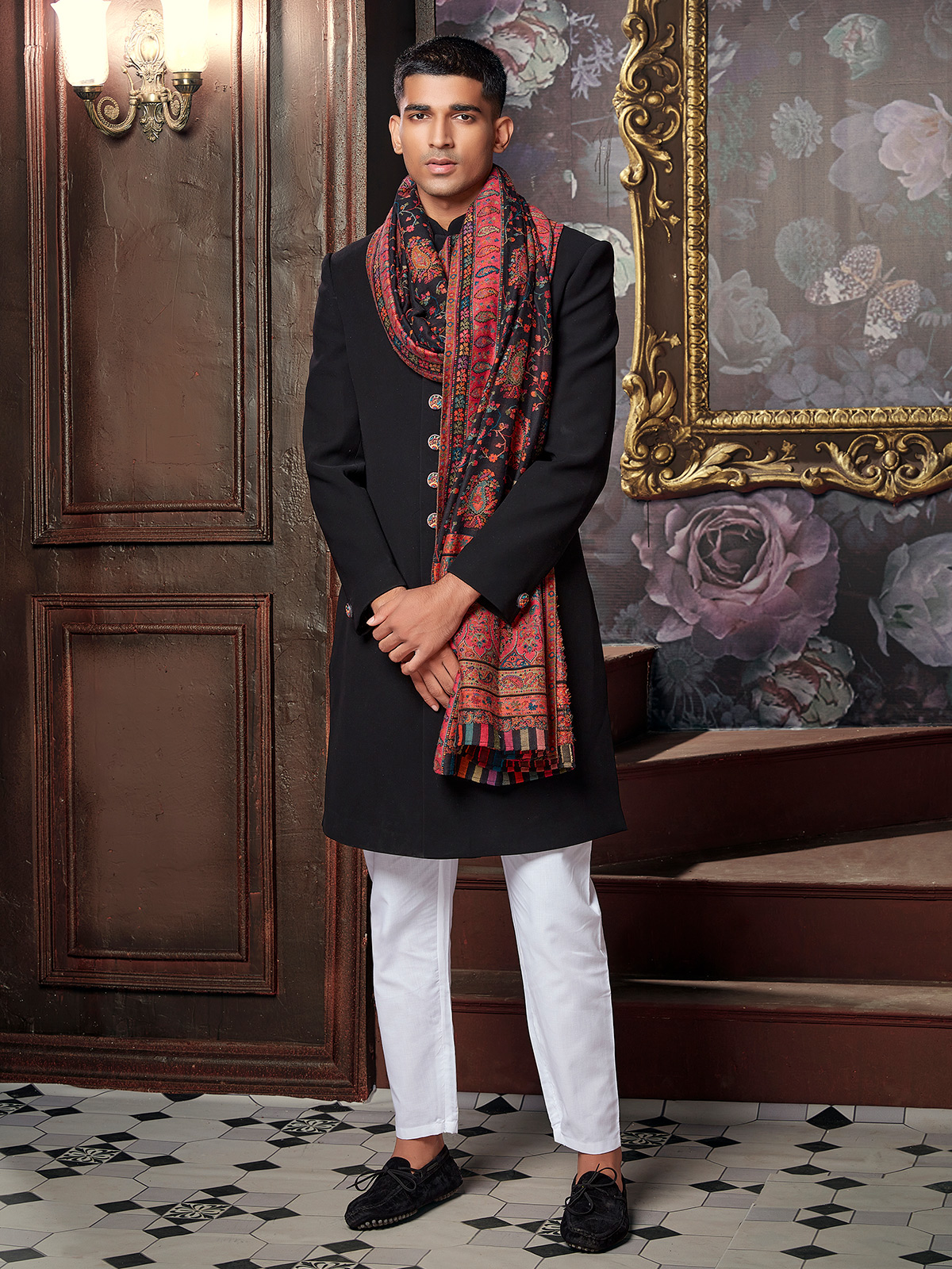 Look your best at any party or wedding function with this black terry rayon fabric indowestern. It features a full fancy buttoned placket, vented hem, stand collar, full sleeves, and comes with bottom and kurta.
