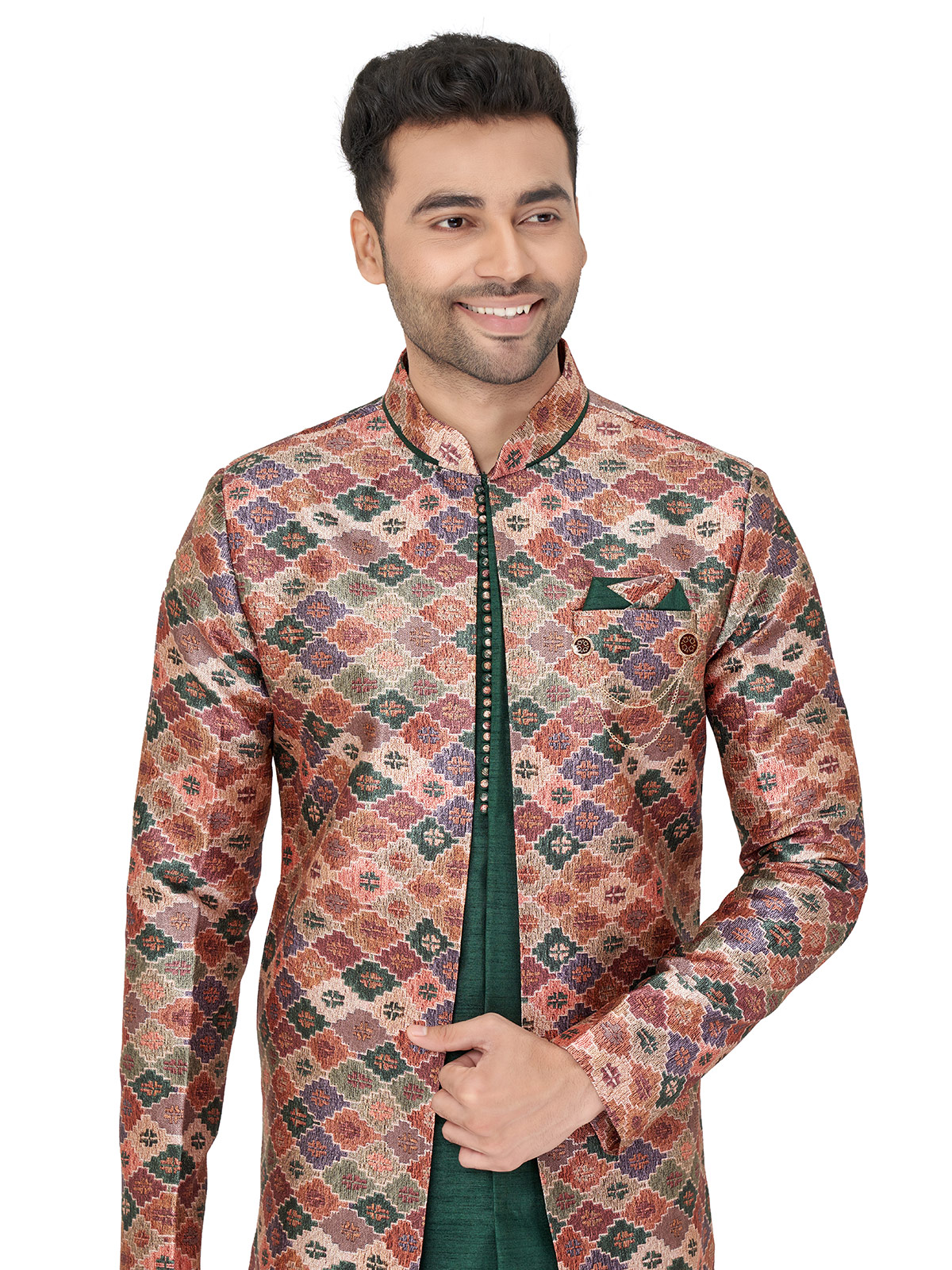 Stand out at weddings with this bottle green silk printed indowestern for men. Features a mandarin collar, full sleeves, a welt pocket with pocket tie, and a full buttoned placket. Comes with a bottom for a complete look.