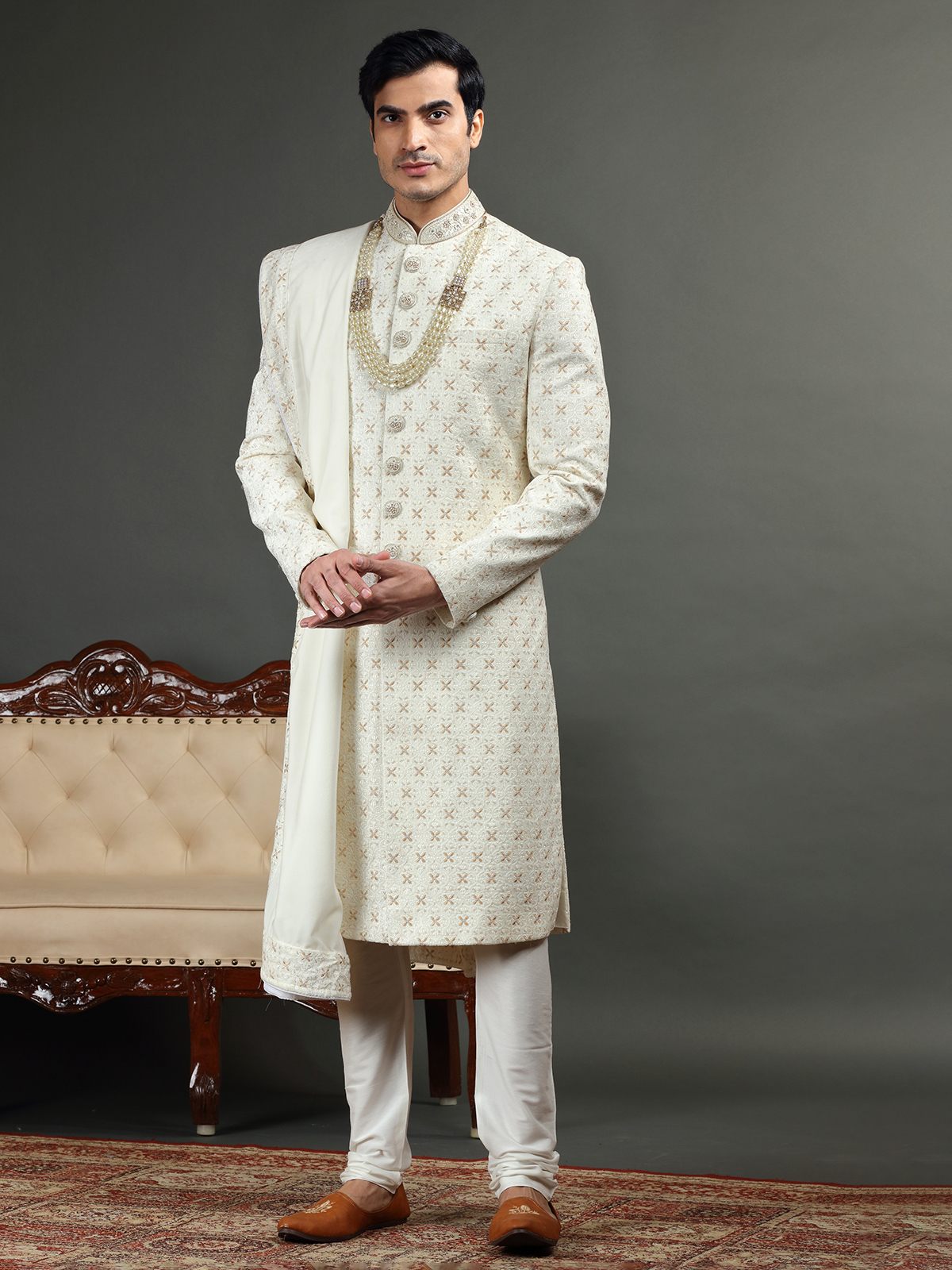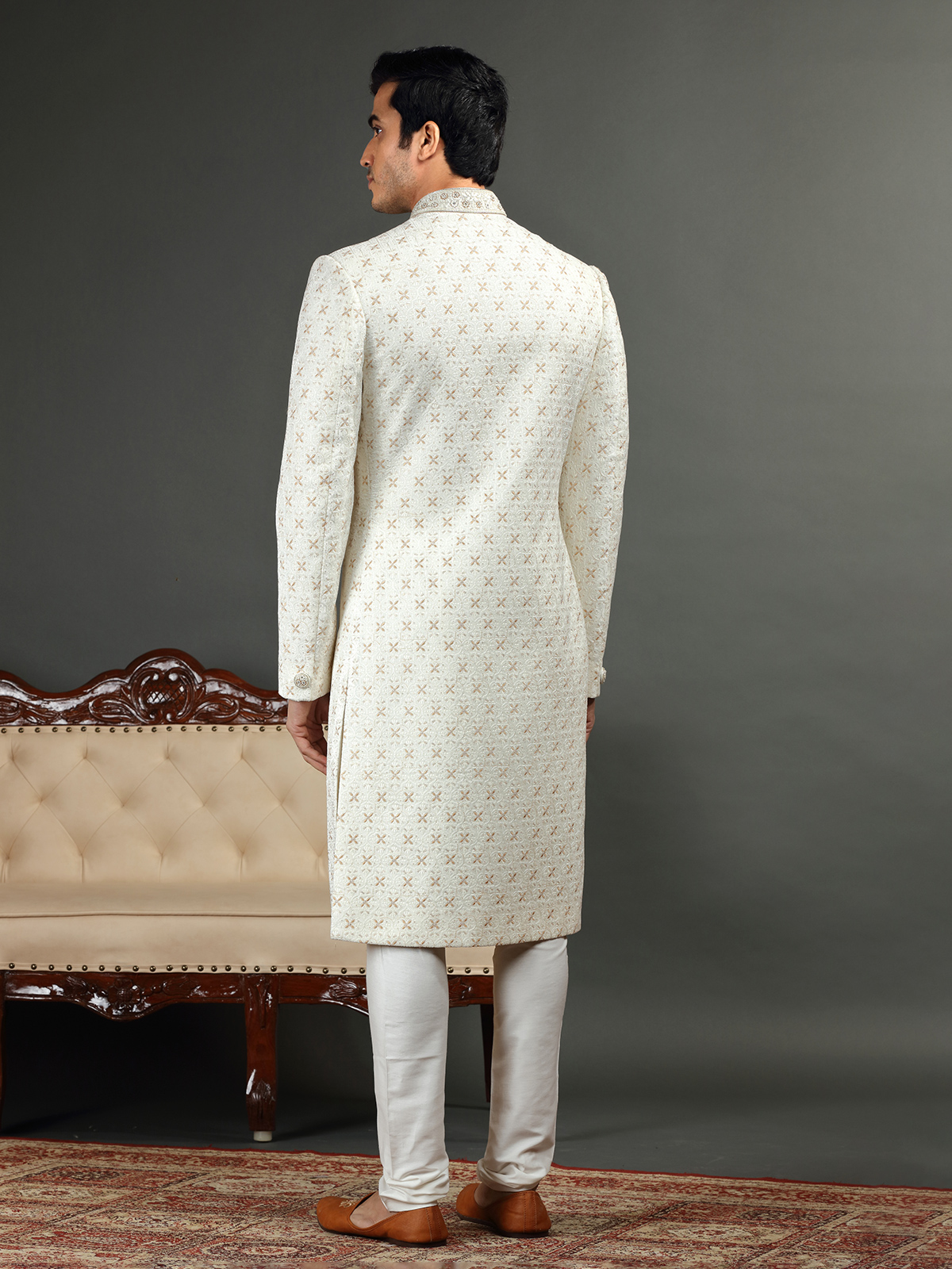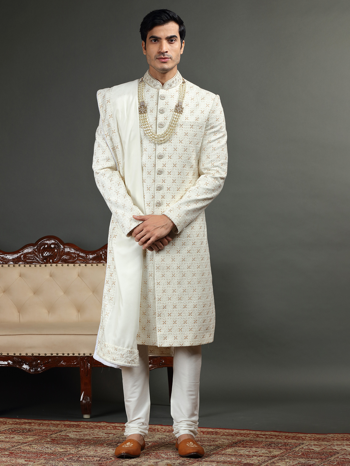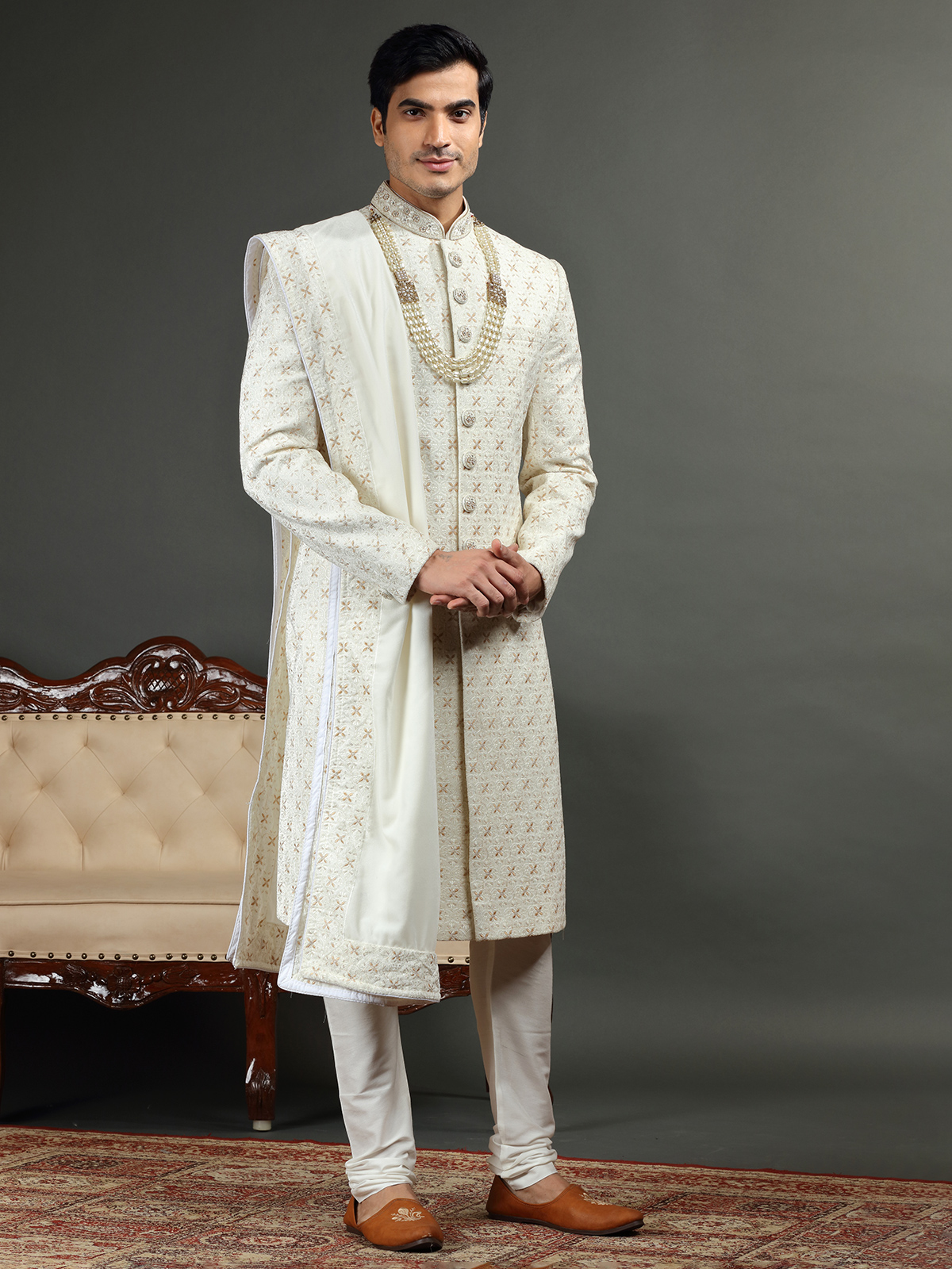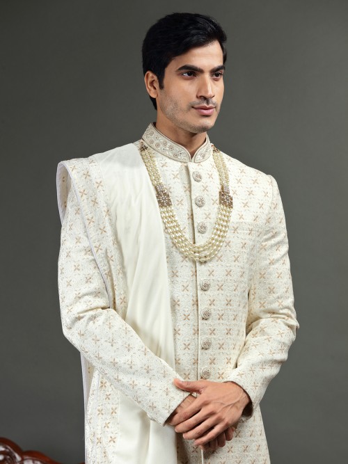 Classic Cream Sherwani In Silk