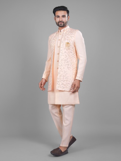 Stay fashionable with this peach silk indowestern, embellished with embroidery and sequins work that enhances the glam of this attire. It comes with a bottom.