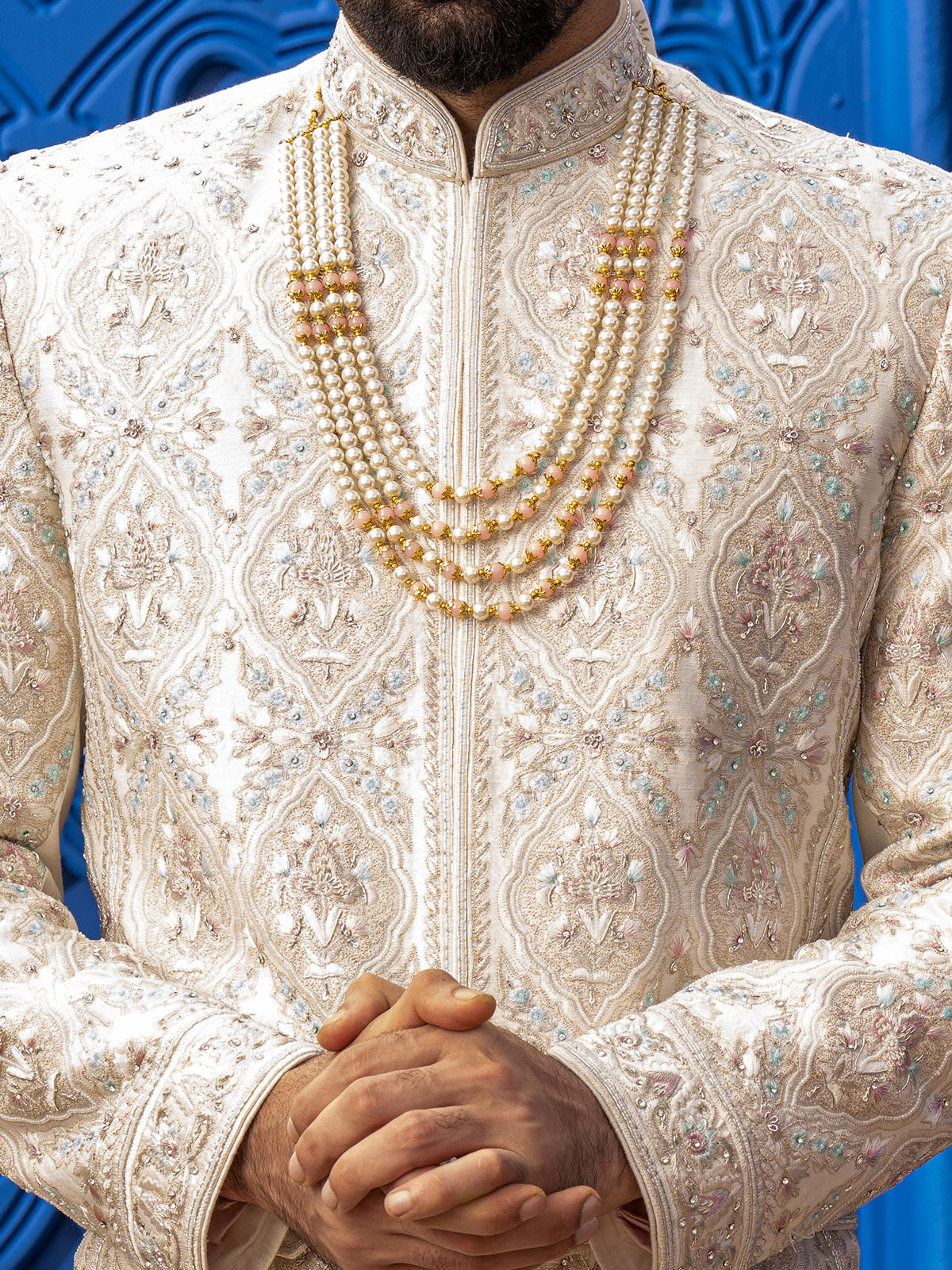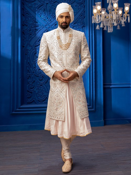 Radiate royalty on your big day with this elegant cream sherwani. The luxurious silk fabric is adorned with intricate embroidery in zari, sequins and zardosi work. The stand collar and full sleeves add to the attire grandeur and style, creating an exuberant look that is sure to turn heads.