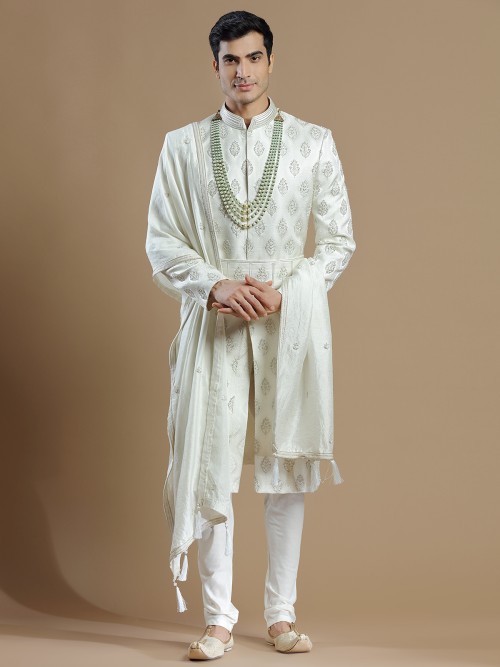 Combining traditional roots with modern design can create a great outfit for your special day. This cream raw silk groom wear premium sherwani is the perfect blend. Embellished with lucknowi, resham, and zardosi work, it features a stand collar, full button placket, full sleeves, and a straight vented hem. Comes with a bottom.