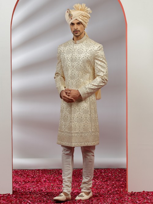 Wedding demands classic and stylish outfits for your special day. Elevate your look with a hand-picked collection of traditional attires featuring a premium raw silk cream groom wear sherwani. Adorned with embroidered, sequins, resham, beads, and zardosi work all-over. Featuring a stand collar, full button placket, full sleeves, and straight vented hem. Bottom included.