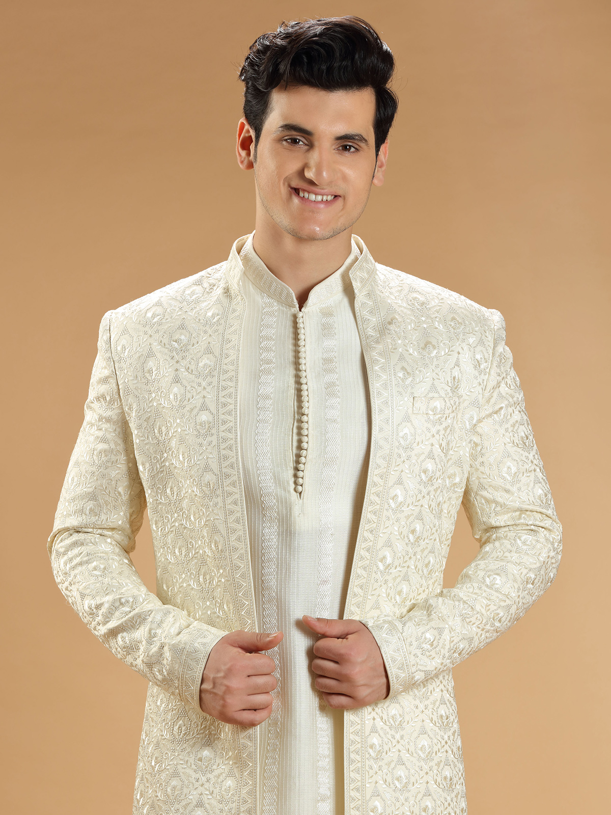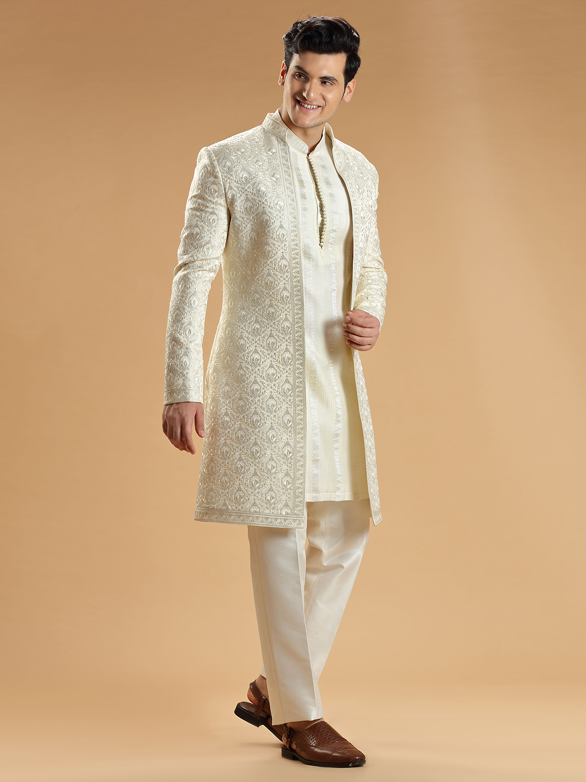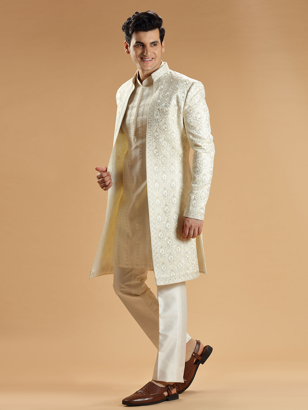 Cream Silk Wedding Look Indowestern