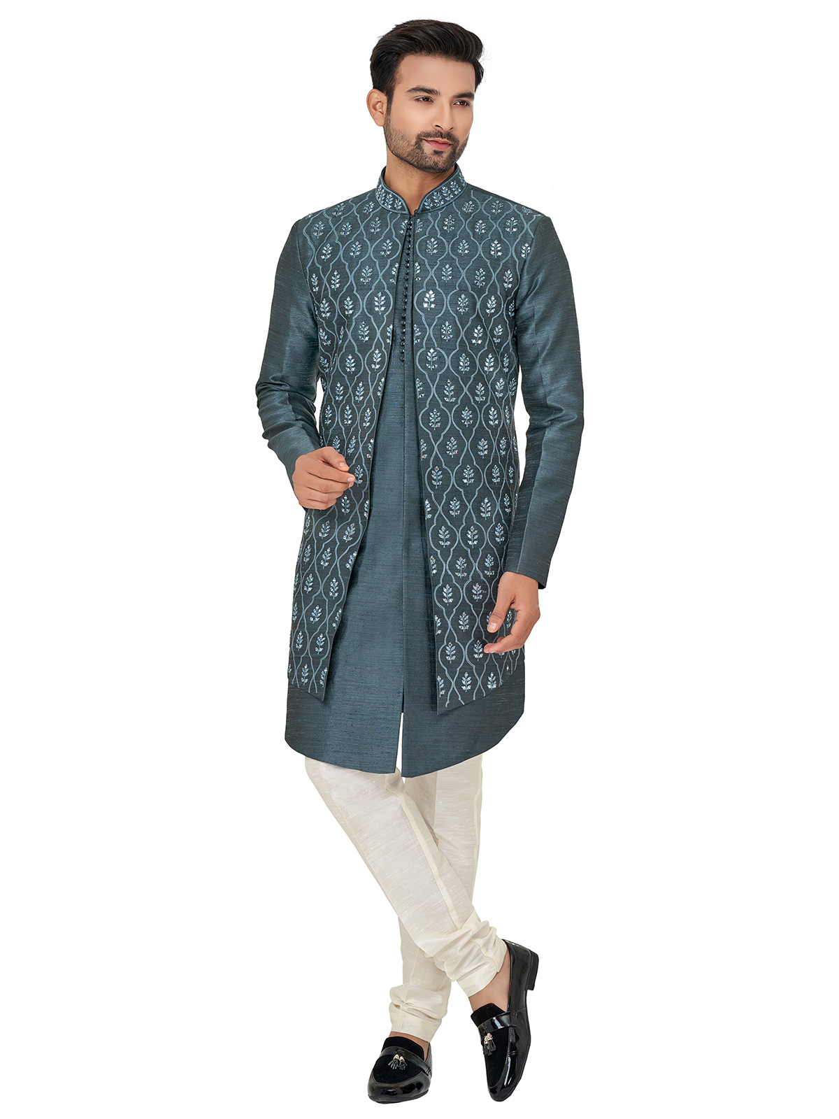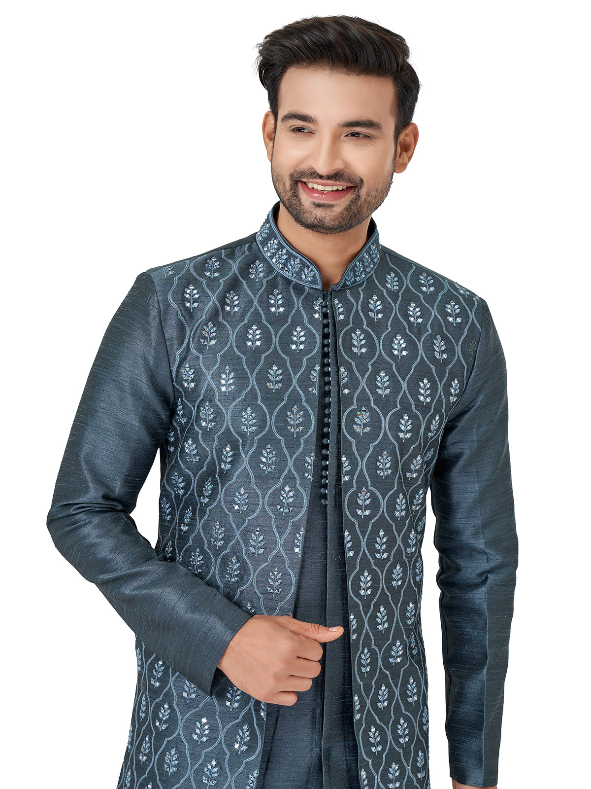 Look dashing in this dark grey silk wedding indowestern, embellished with embroidered, resham, and mirror work. Featuring a mandarin collar, full sleeves, and a full buttoned placket, it comes with a bottom for a complete ensemble.