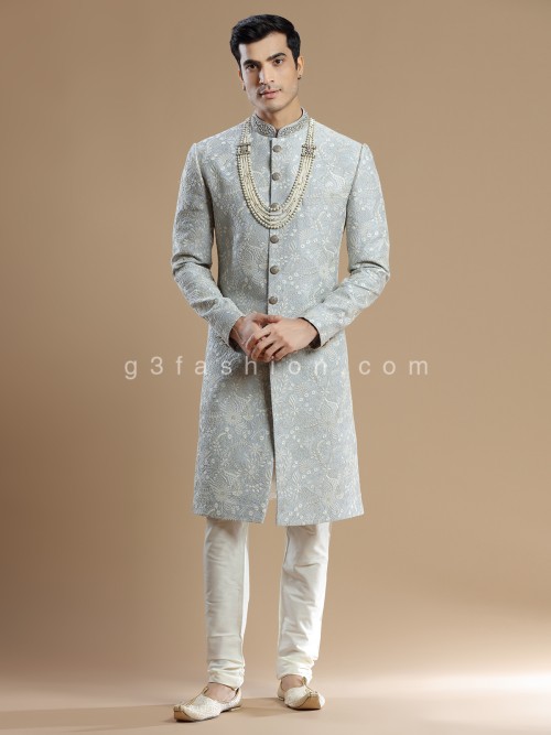Make the groom shine on his big day with this elegant light grey raw silk premium sherwani. Embellished with intricate embroidered and resham work overall. It features a stand collar, a full button placket, full sleeves, and a straight vented hem. Comes with a bottom.