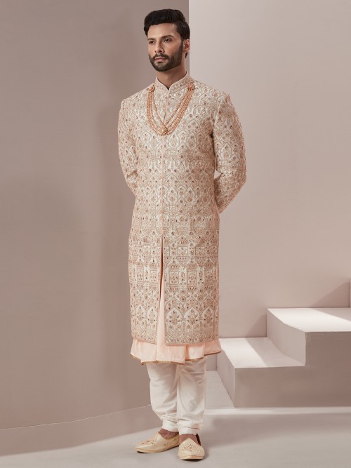 Experience the mesmerizing charm of vibrant colors and aesthetic designs with our exclusive groom collection. This peach colored raw silk sherwani is embellished with embroidered, resham, zardosi, and zari work overall. It features a stand collar, a full button placket, full sleeves, and a straight vented hem. It comes with a bottom and is the perfect choice for a stylish grooms look.