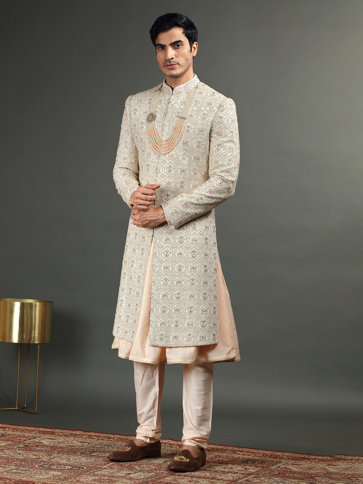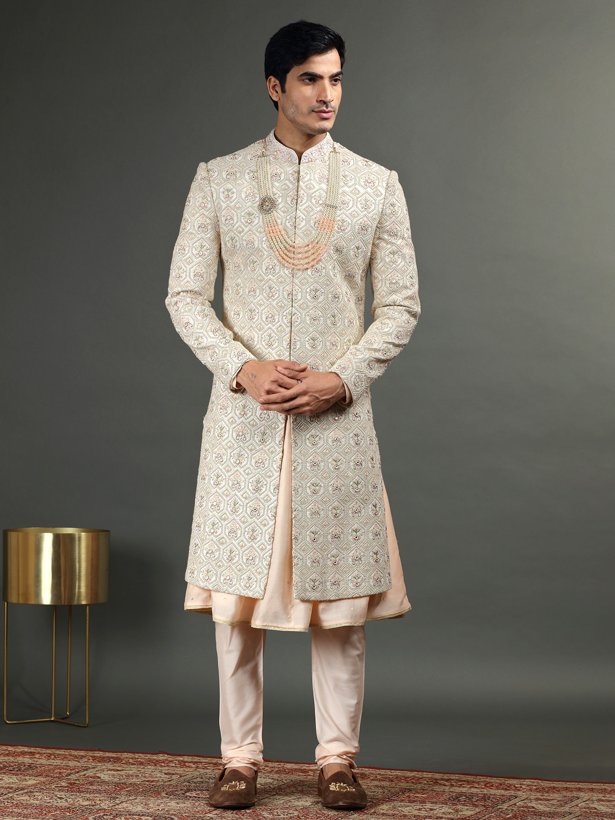 Explore the elegance of this cream silk sherwani, embellished with embroidery, resham, cutdana, diamonds, zardosi and beads work. It includes a bottom