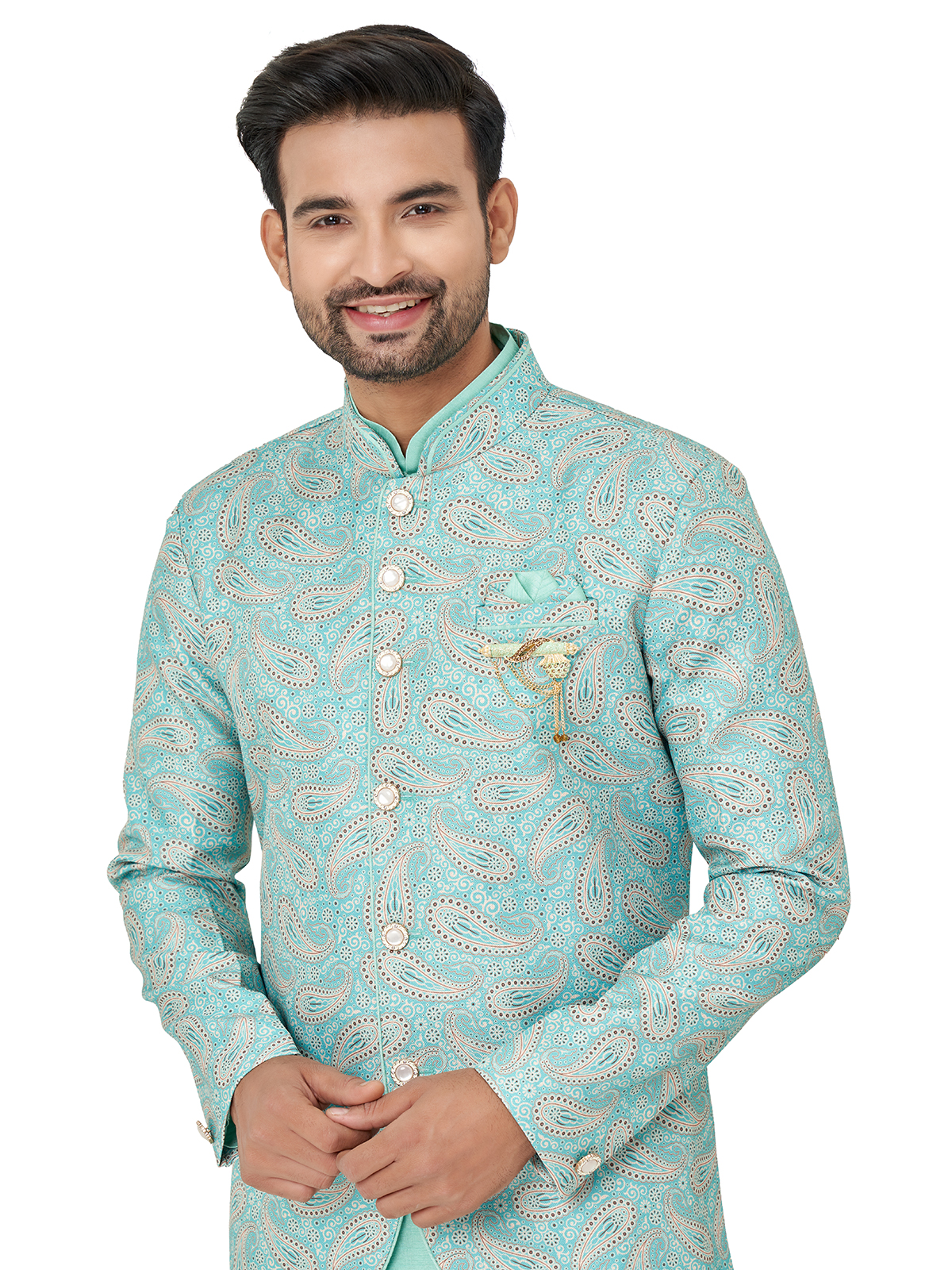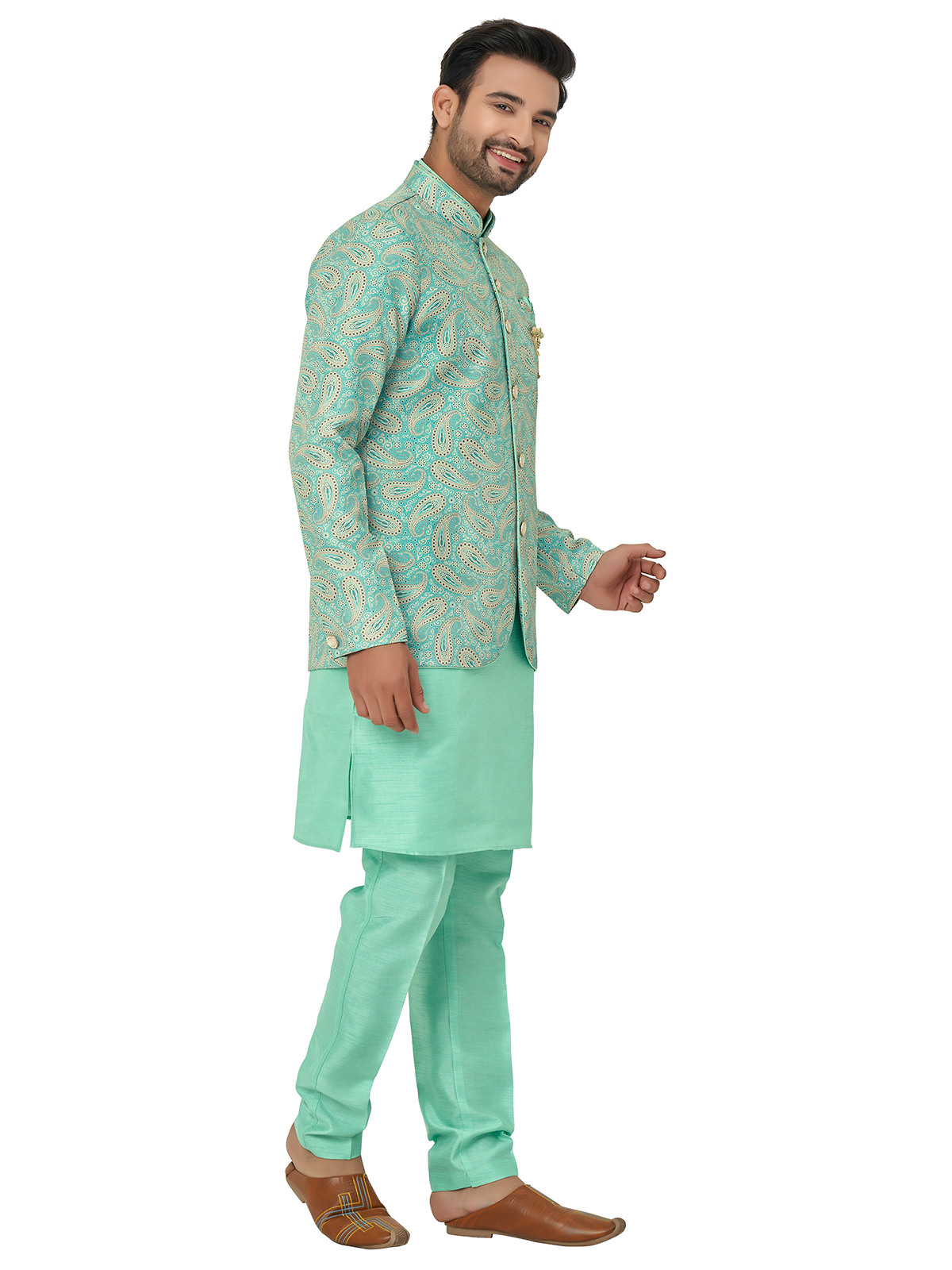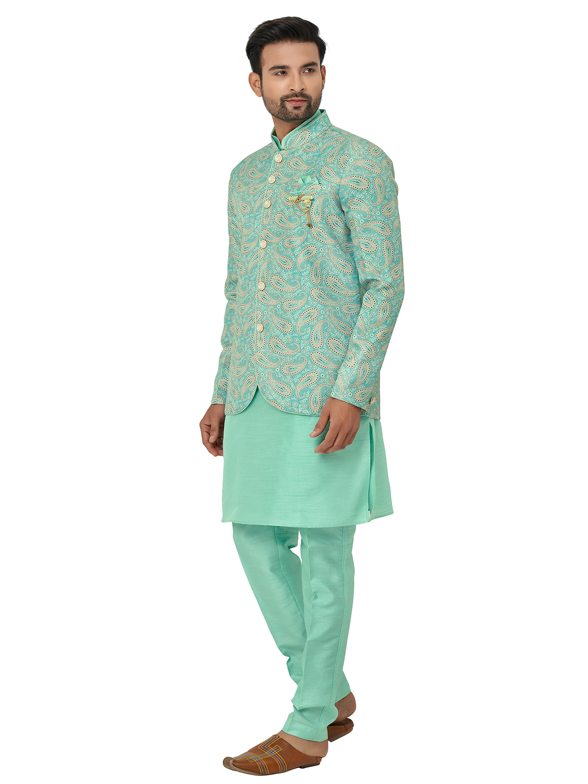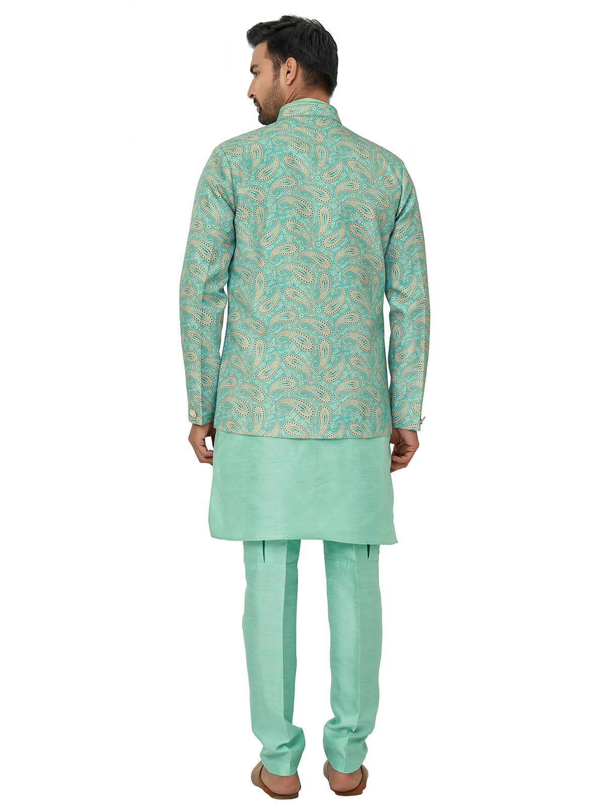 Latest Printed Sea Green Silk Indowestern