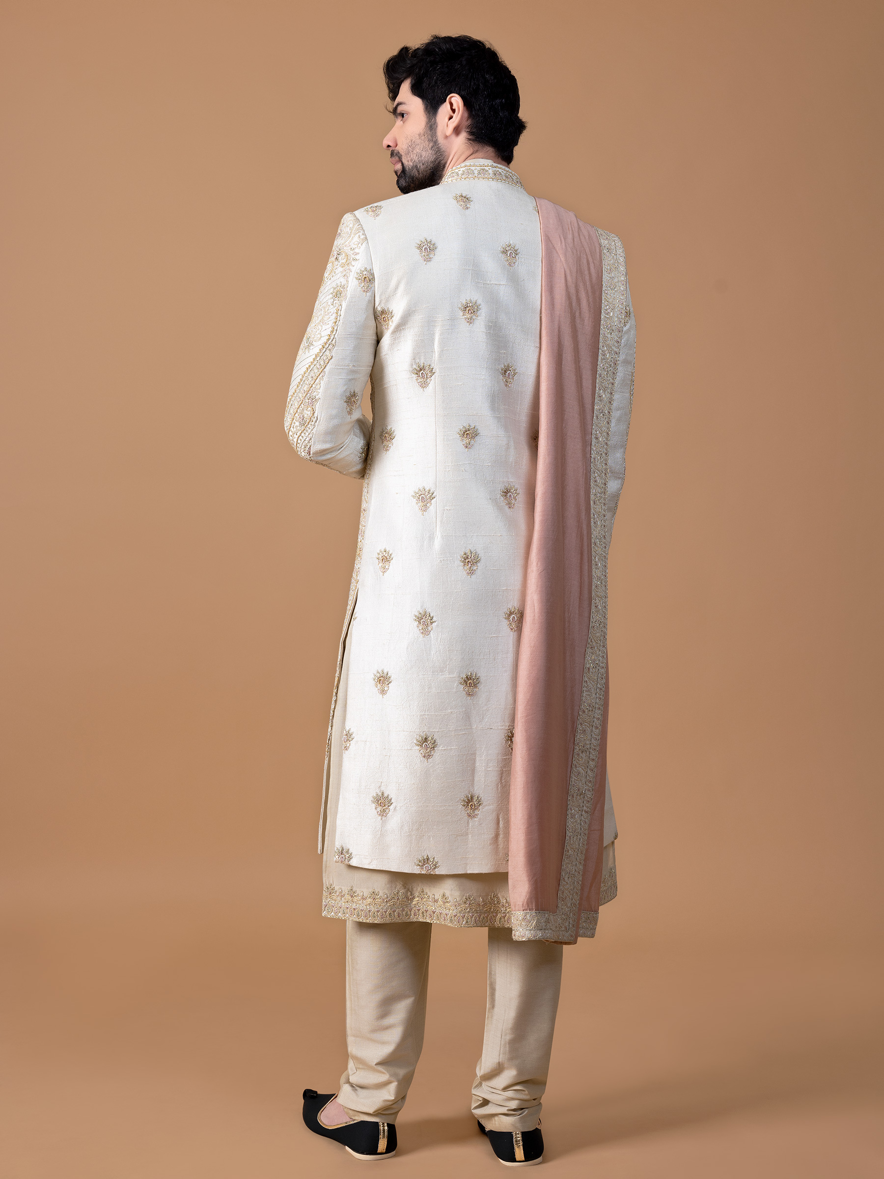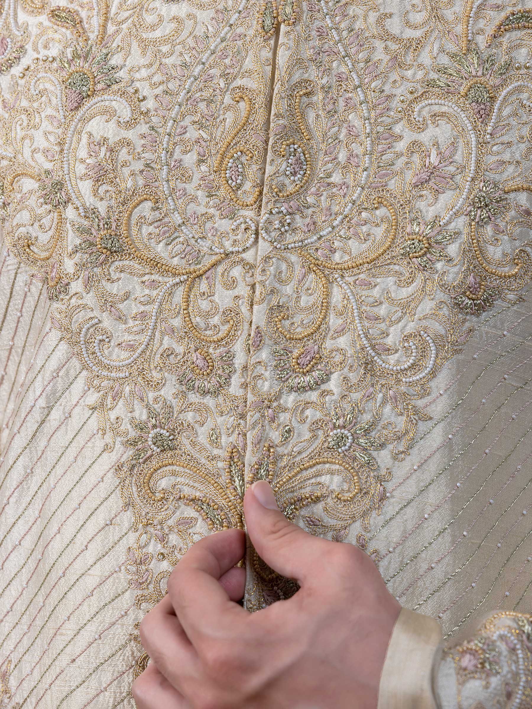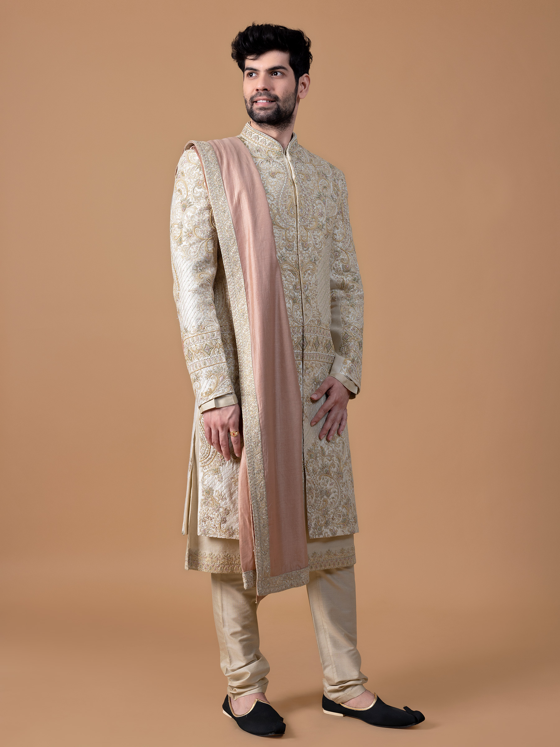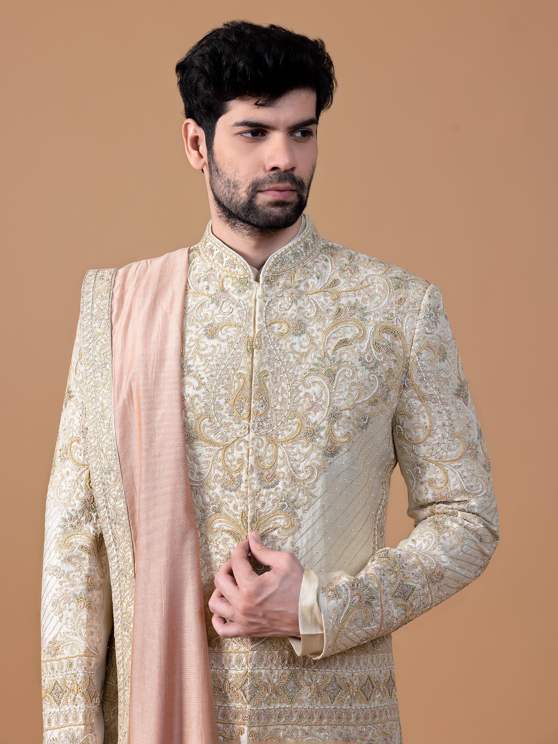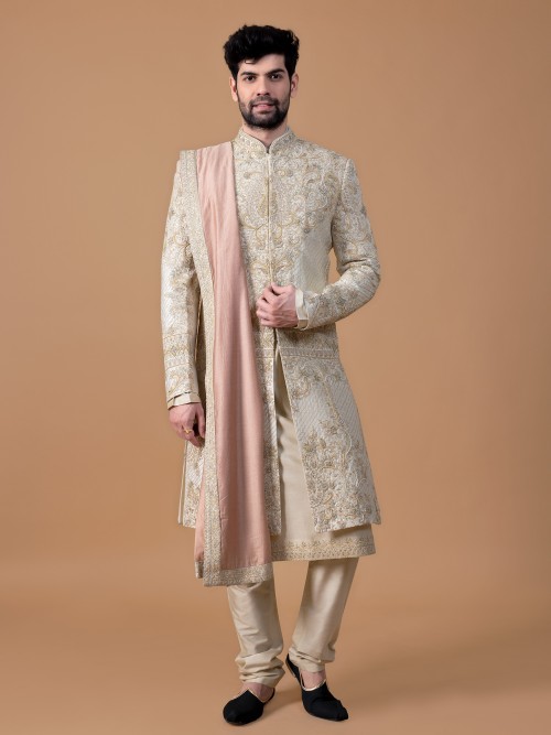 For a charming look on your wedding day, wear this cream raw silk sherwani. It features exquisite embroidery, resham, zari and beads work, accompanied by a bottom.