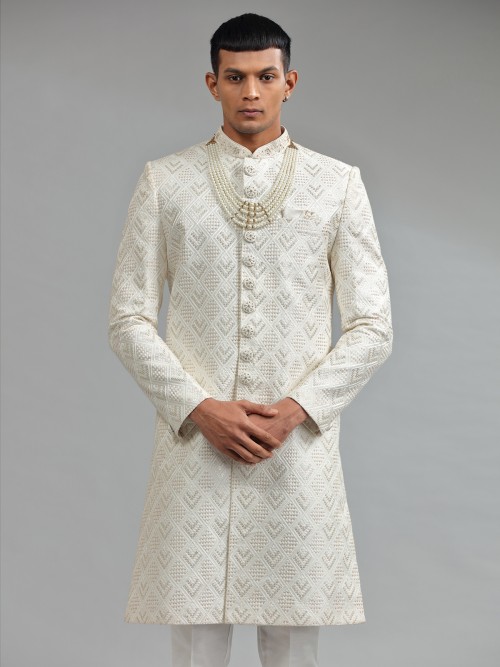 Blend classic and modern styles with this white silk sherwani featuring embroidery and sequins work. Comes with a coordinating bottom.