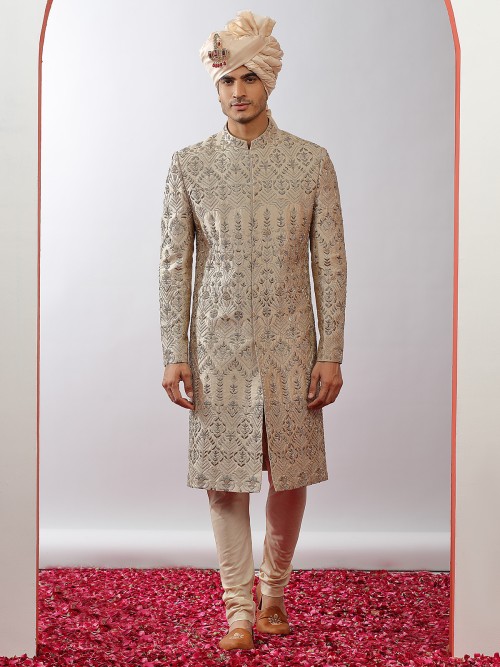 Make a stylish statement at your wedding with our fresh collection of wedding essentials tailored to perfection in rich fabrics. This premium beige raw silk sherwani for grooms is embellished with embroidered, sequins, resham, beads, cutdana, and zardosi work. It features a stand collar, full button placket, full sleeves, and a straight vented hem. Comes with a bottom to complete the look.