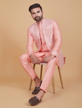 Light Pink Raw Silk Printed Indowestern