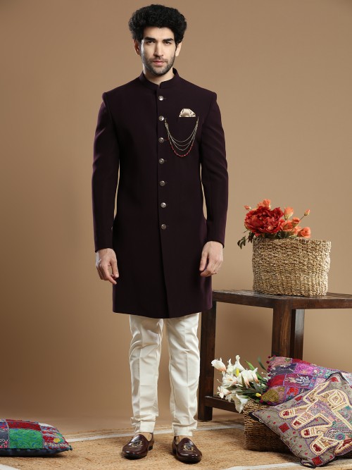Men Wine Hue Terry Rayon Wedding Wear Indowestern
