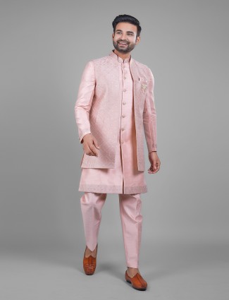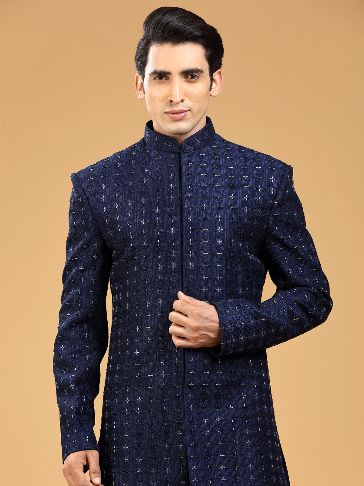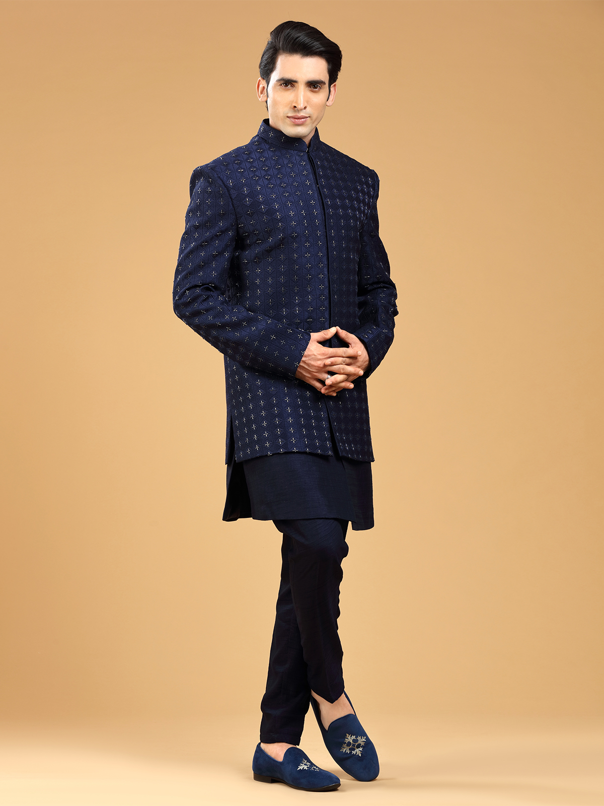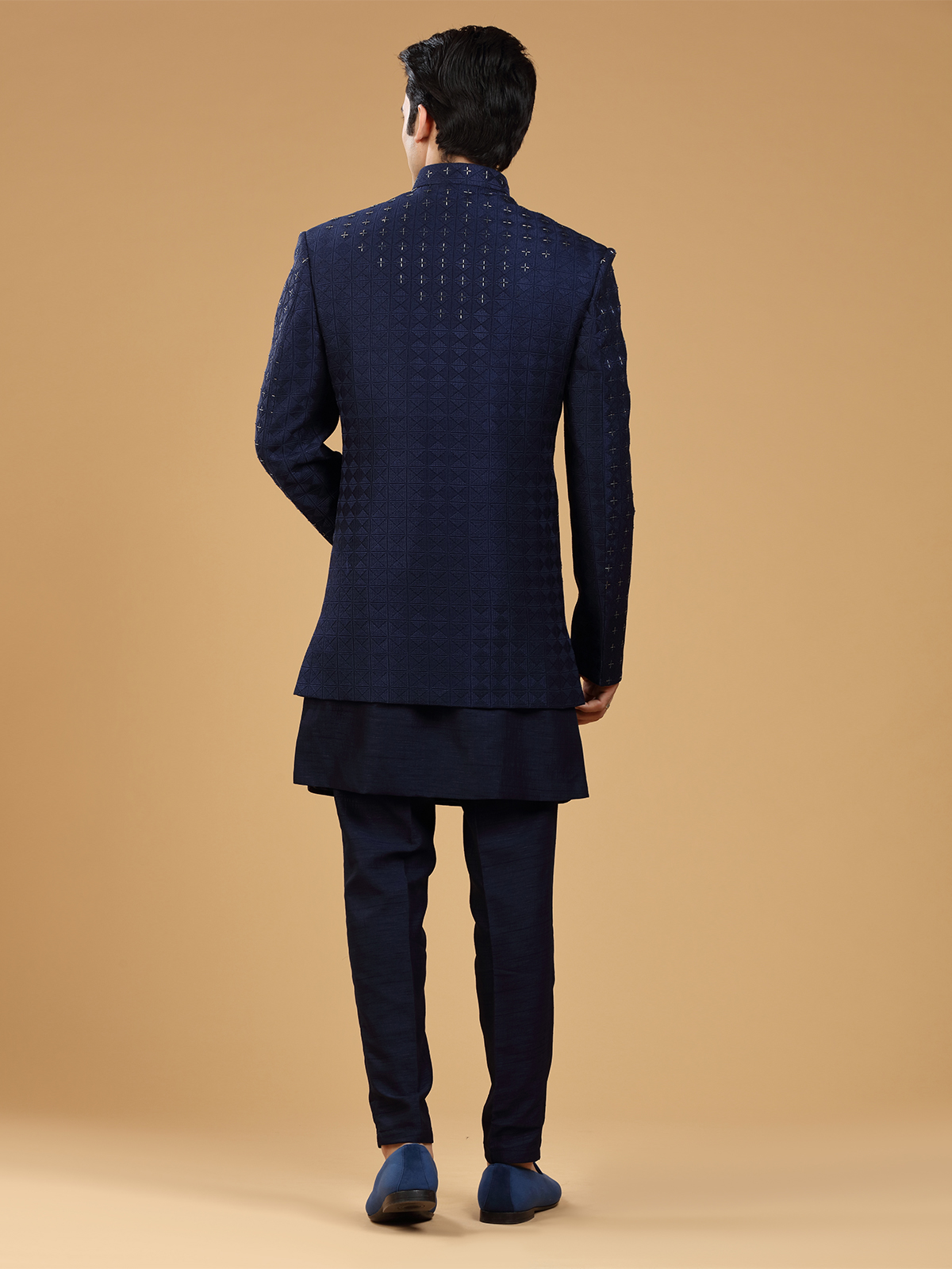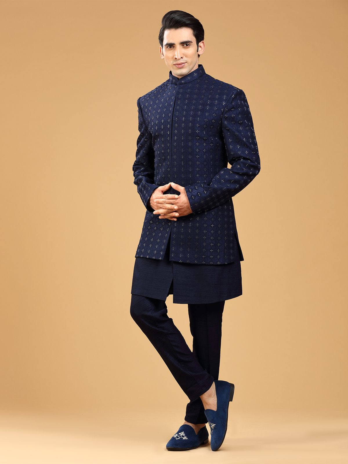 This navy indowestern in terry rayon fabric is adorned with elegant cutdana and resham work, making it a perfect choice for any occasion. Comes with a bottom.