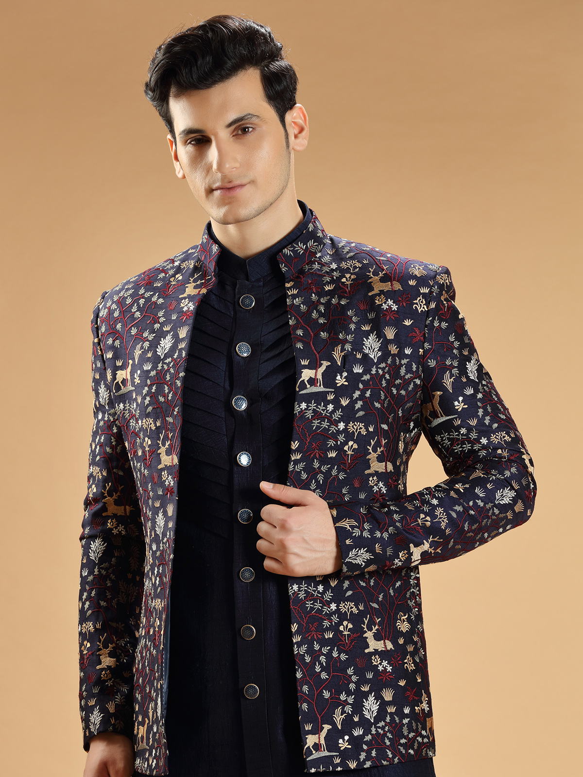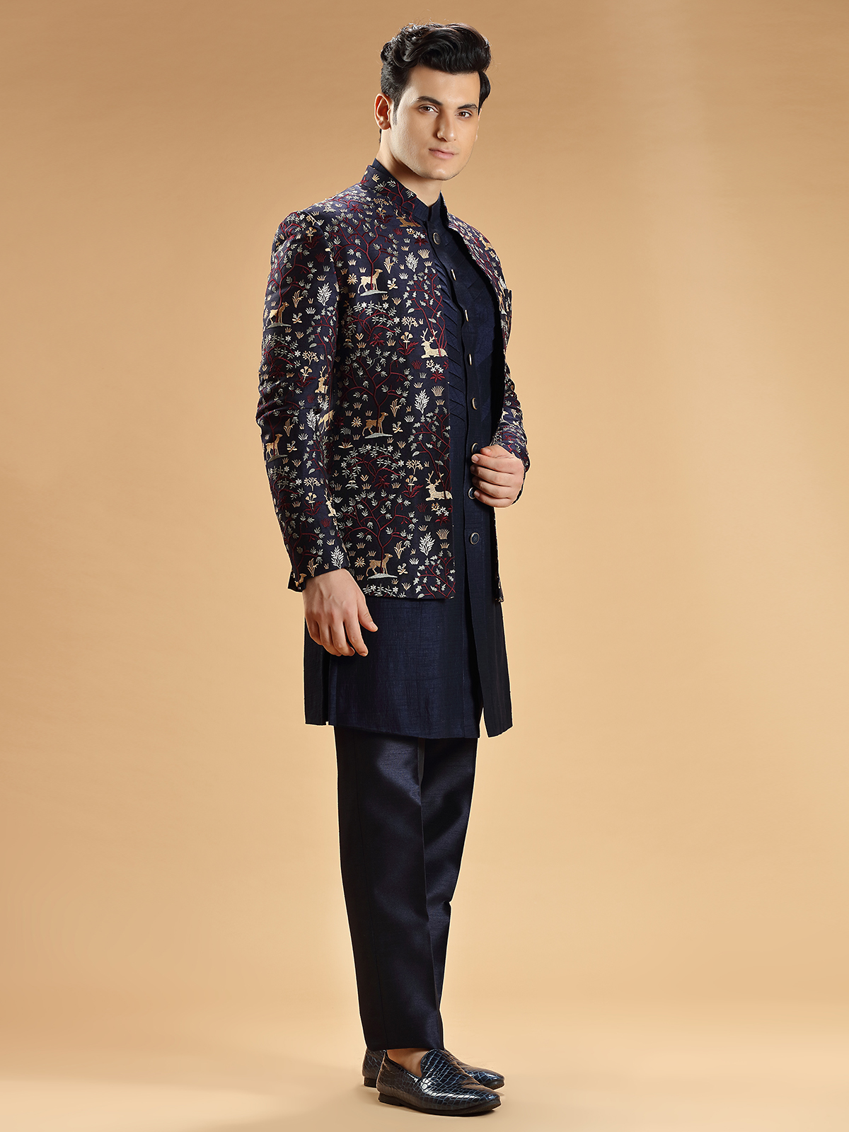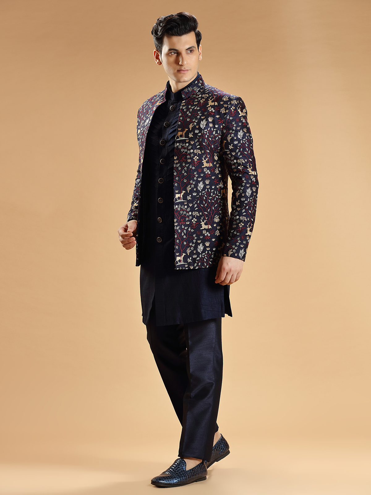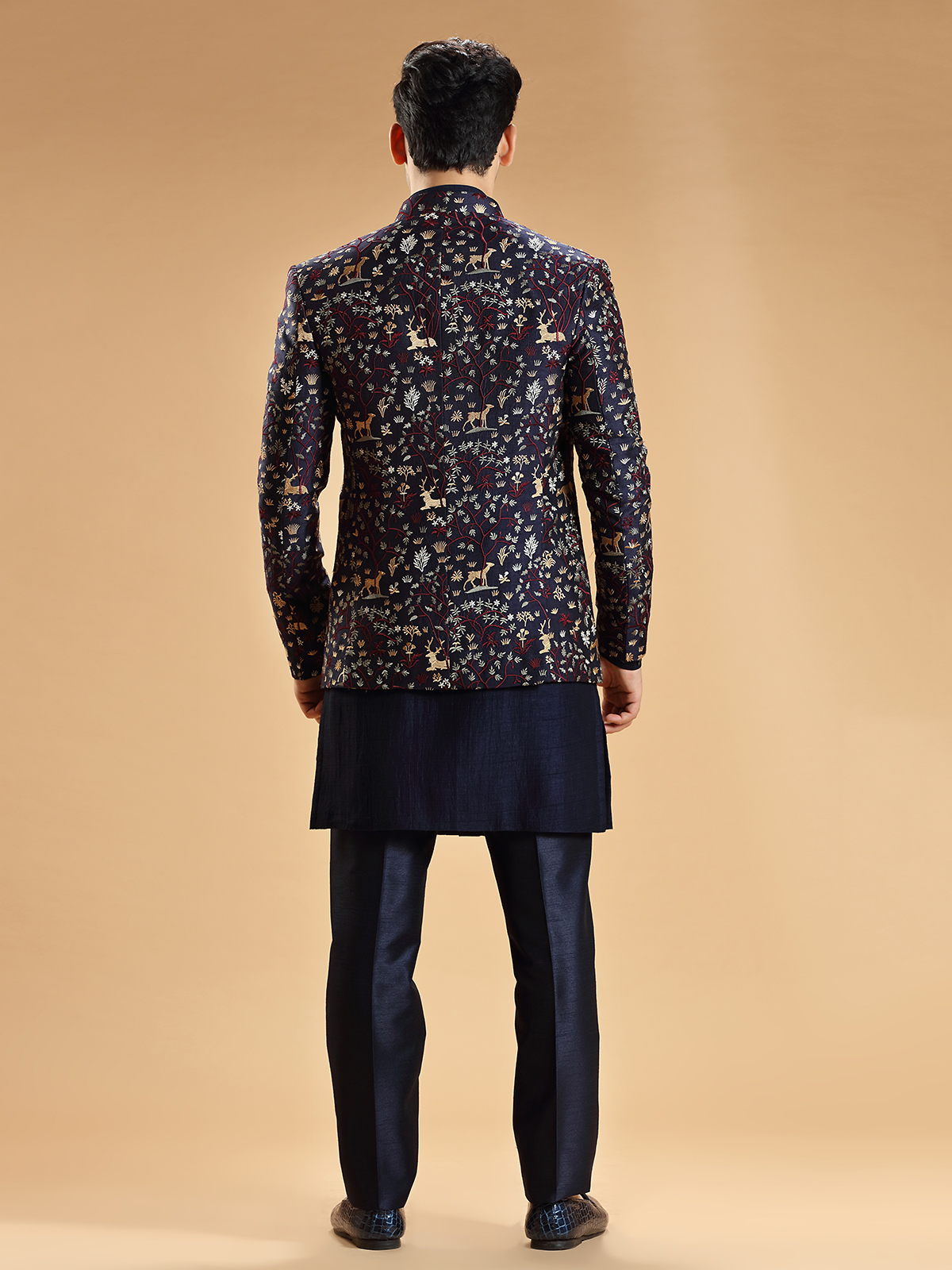 Navy Embroidery Indowestern In Silk
