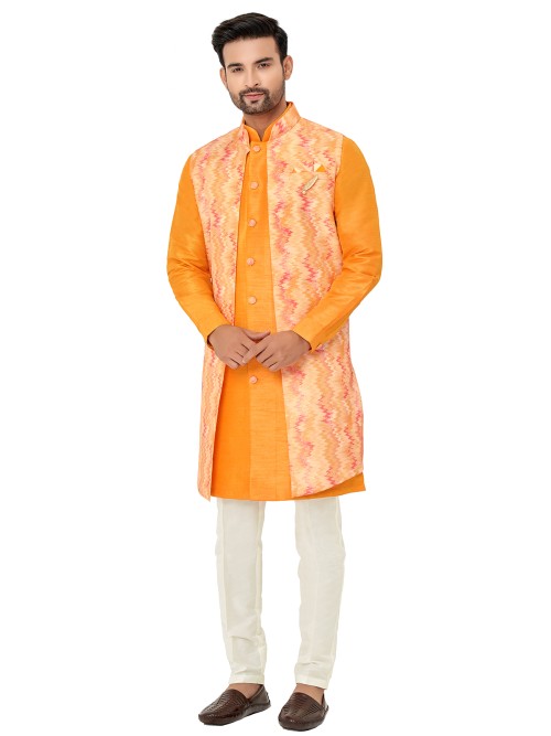 Orange Printed Silk Indowestern For Wedding