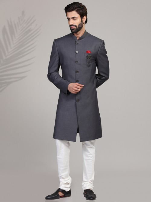 Revamp your style collection with this solid grey terry rayon Indowestern outfit, perfect for wedding wear. It features a stand collar, full buttoned placket, straight hem, and includes bottom.