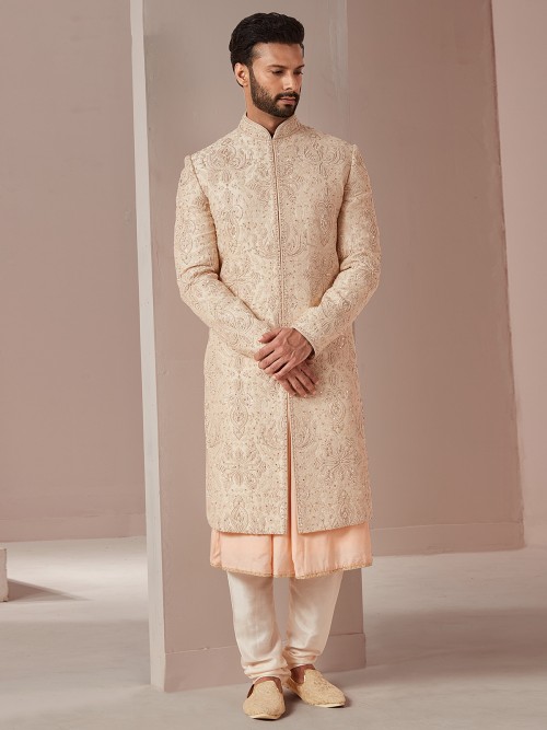 For all the charming souls out there, here an outfit that will make heads turn the moment you step in! Grab this peach raw silk groom and wedding sherwani, intricately crafted with embroidered, resham, sequins, zardosi, beads work overall. It has a stand collar, a full button placket, full sleeves, and a straight vented hem. It comes with a bottom.