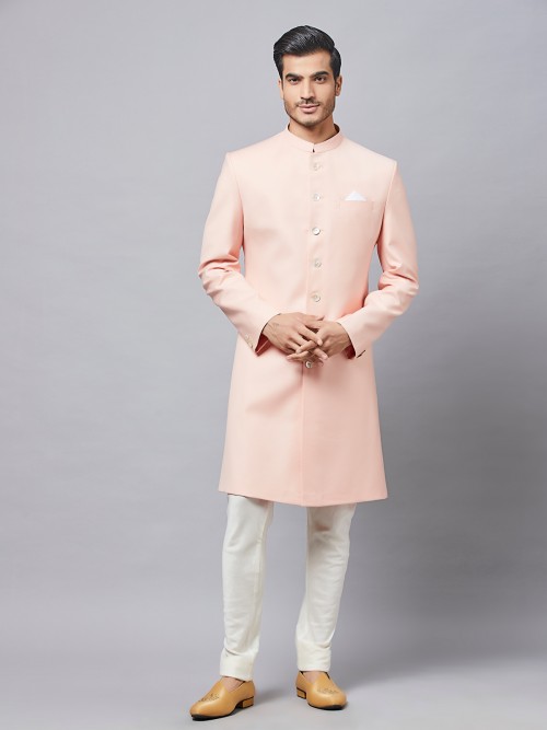 Upgrade your party wardrobe with this peach cotton silk men indowestern. It features a full buttoned placket, stand collar, straight hem, and welt pocket. It comes with a bottom.