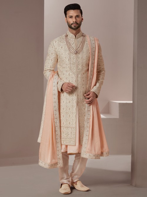 Peach Hue Raw Silk Groom Wear Sherwani
