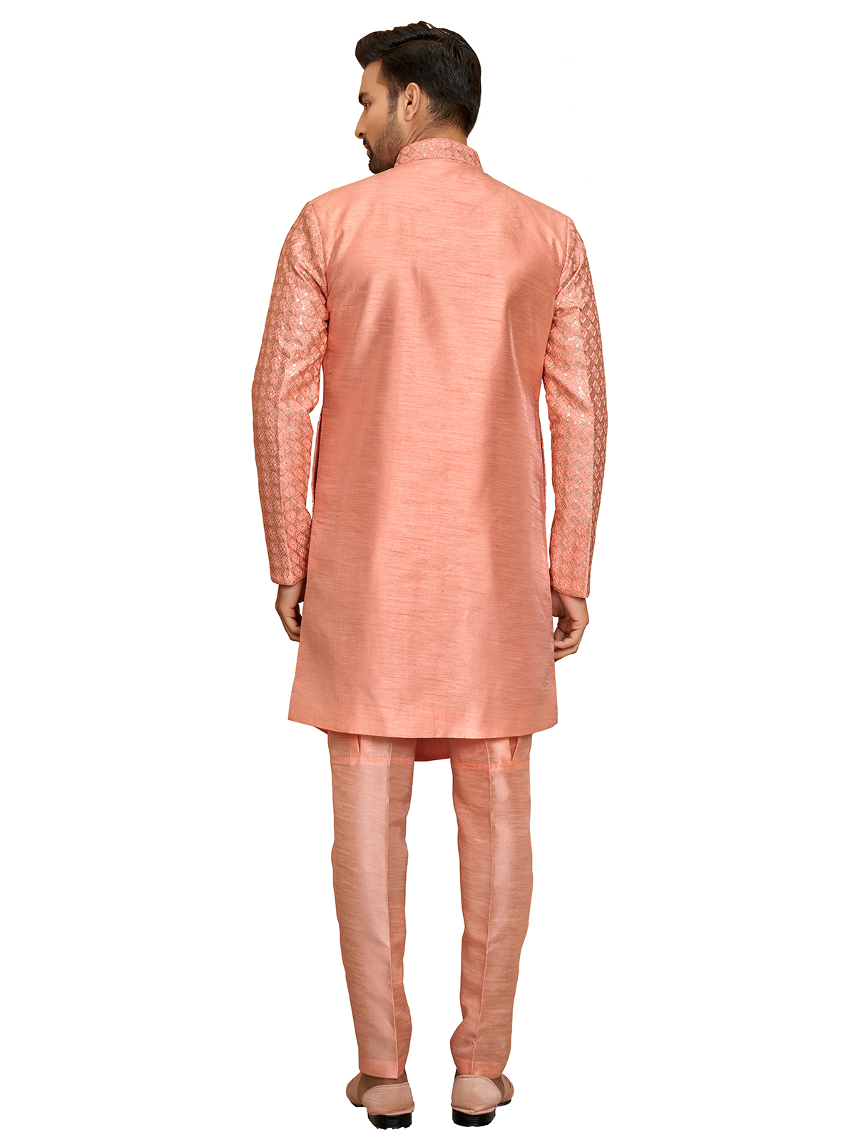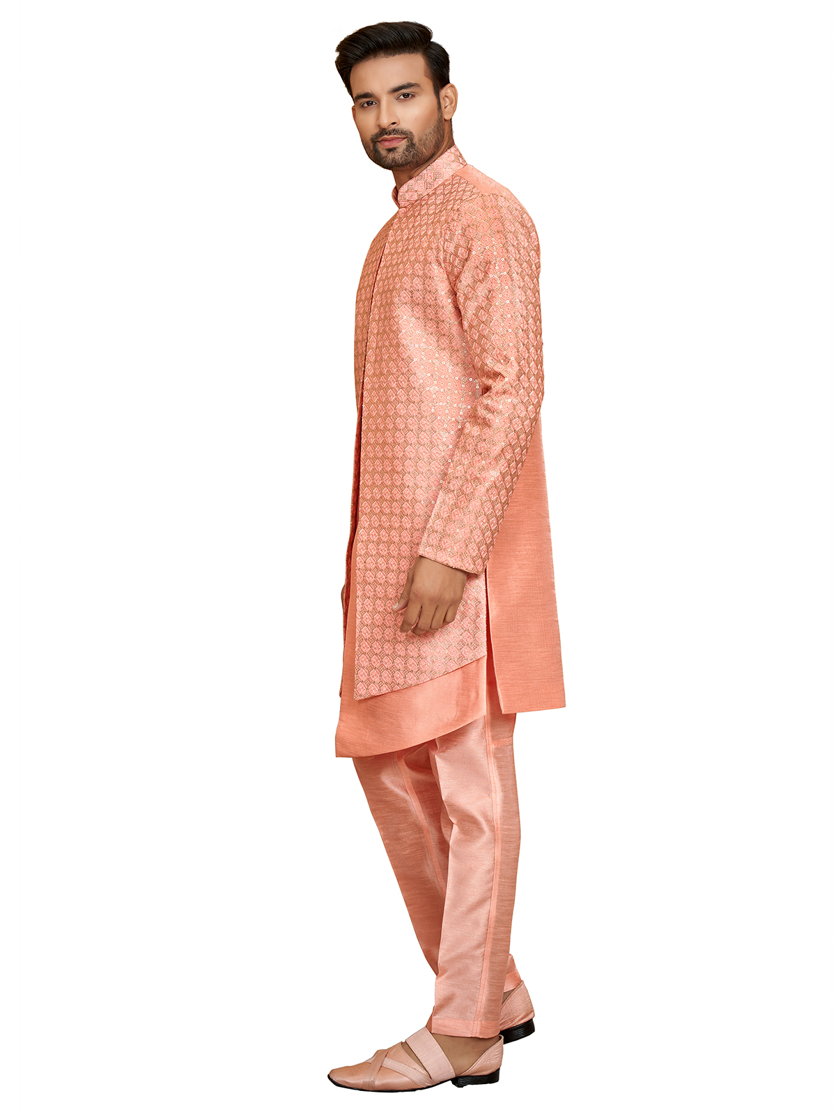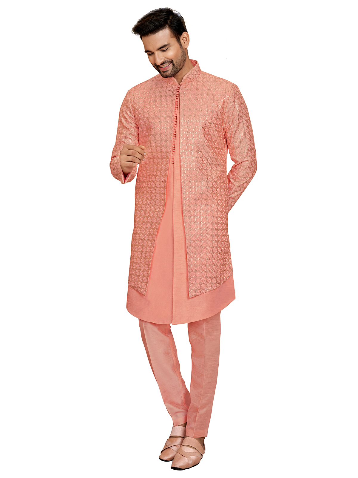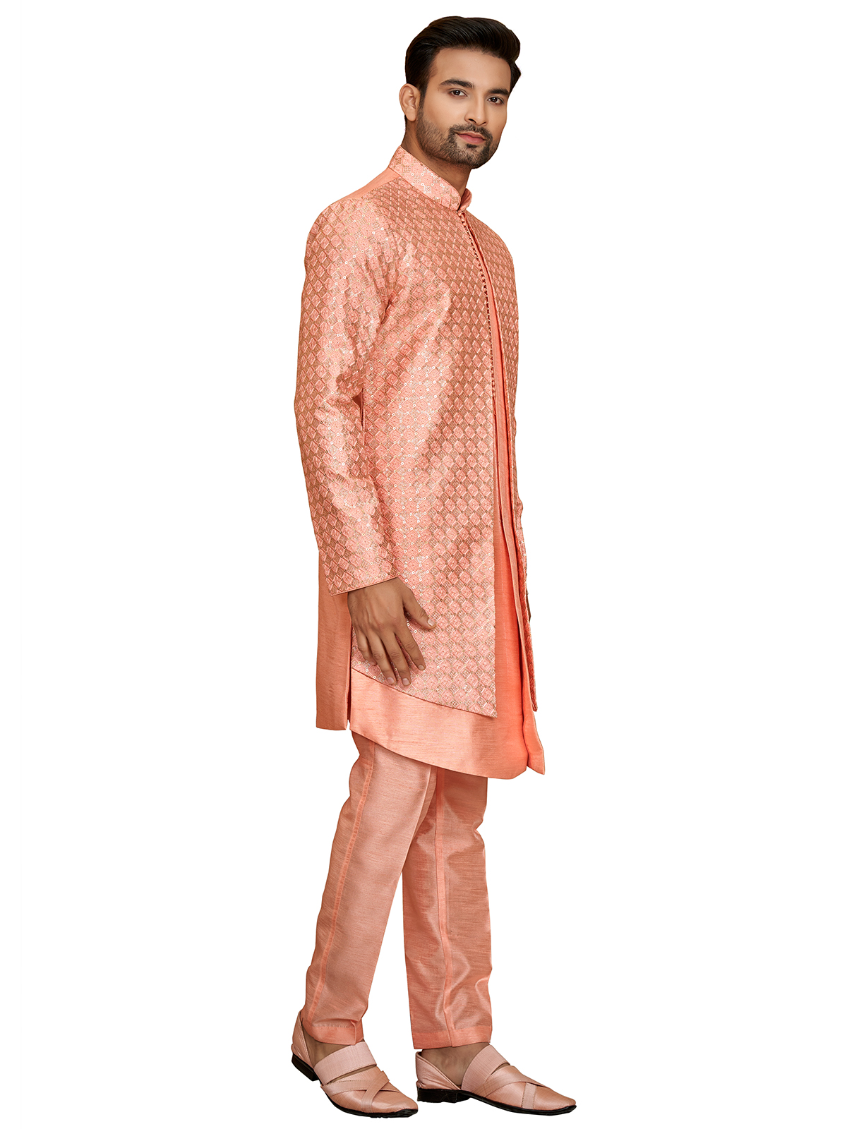 Add a touch of adorableness to your wedding look with this peach silk indowestern. Embellished with embroidered, resham, and sequin work, it features a mandarin collar, full sleeves, and a full buttoned placket. The indowestern comes with a bottom for a perfect traditional look.