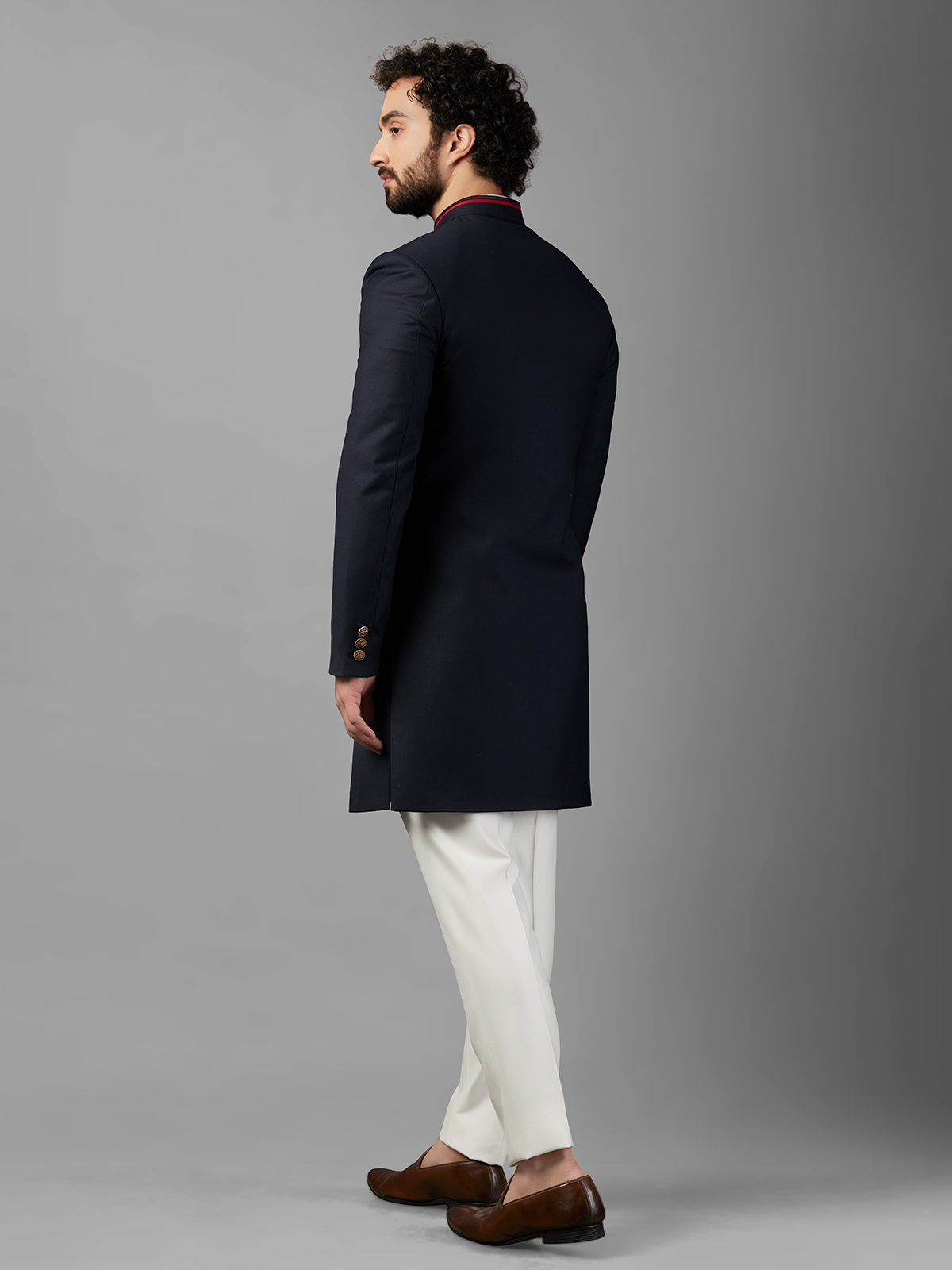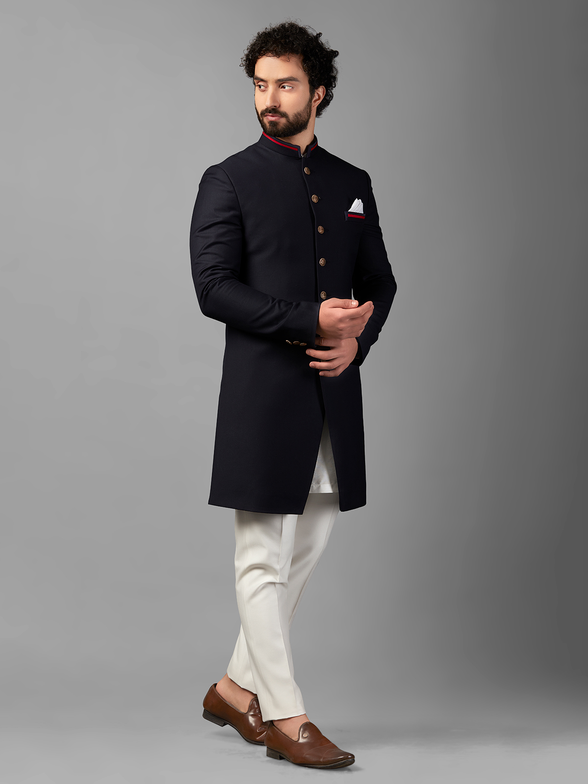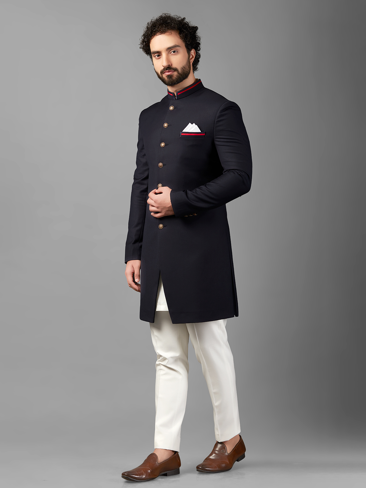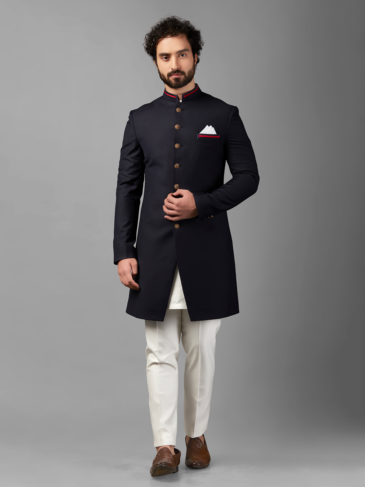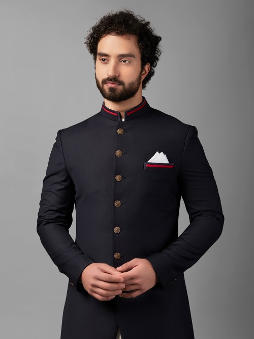Stay stylish with this black terry rayon indowestern. Designed with plain pattern that brings classic wear to the modern. It comes with a bottom.