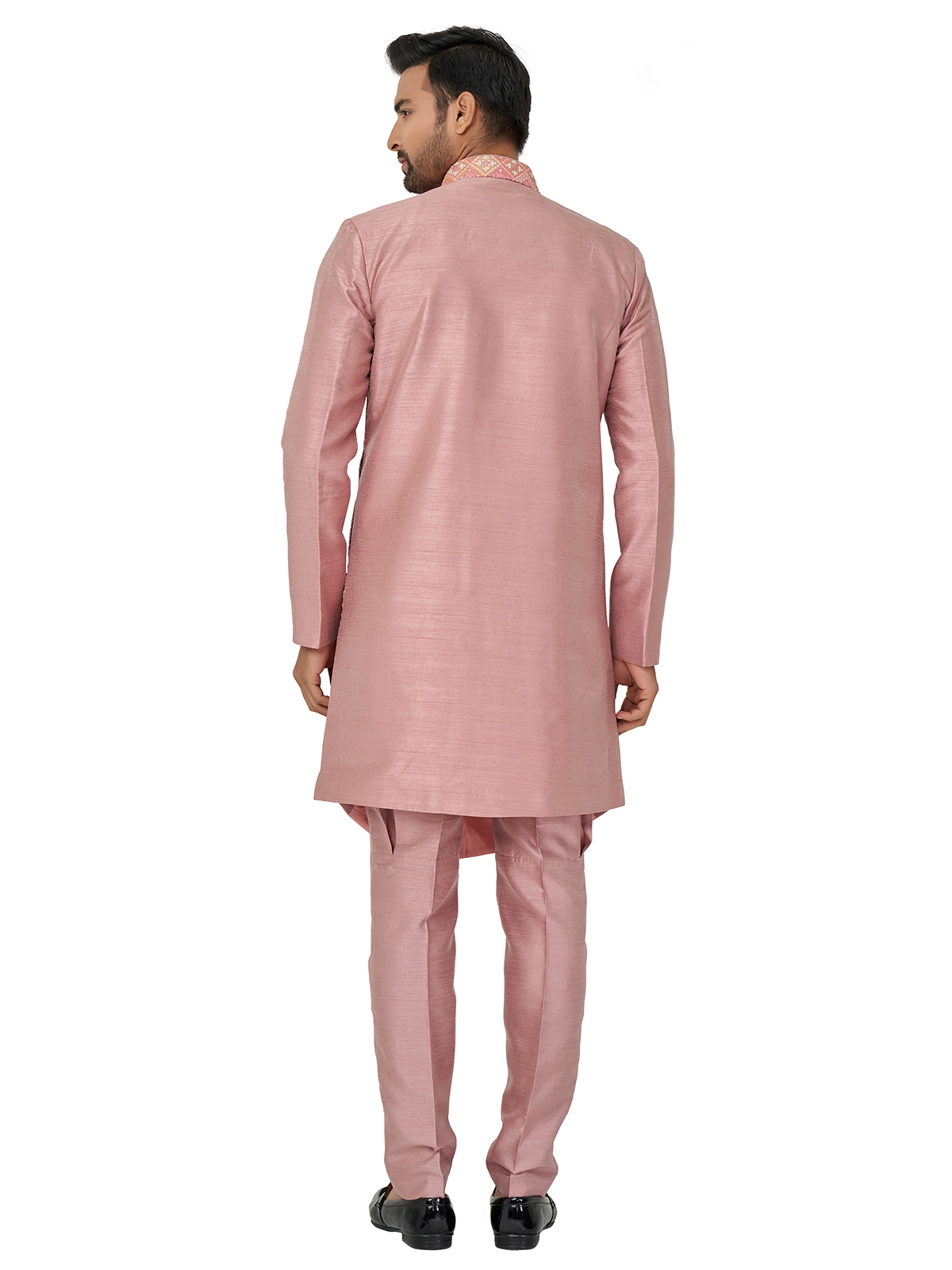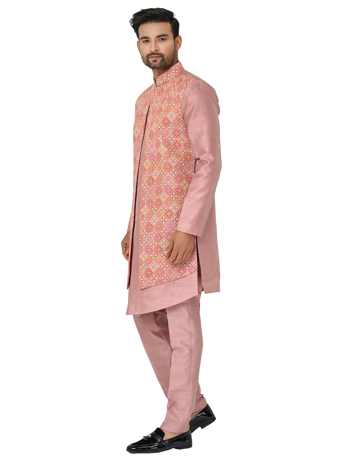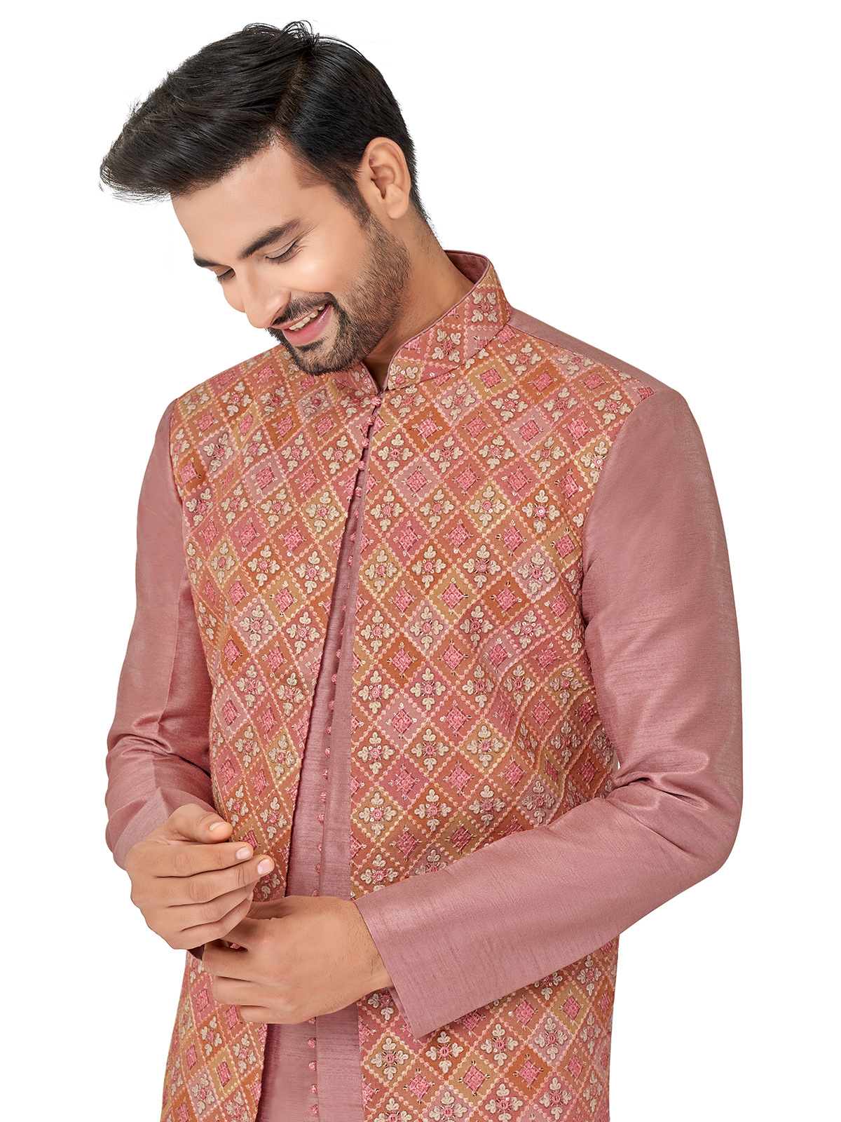 Add a touch of style to your wedding outfit with this printed dusty peach silk indowestern. Embellished with resham and sequins work, it features a mandarin collar, full sleeves, and a full buttoned placket. It comes with a bottom for a complete look.